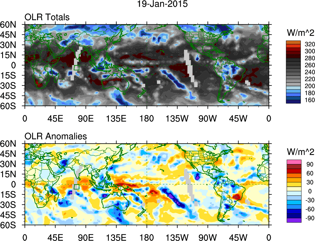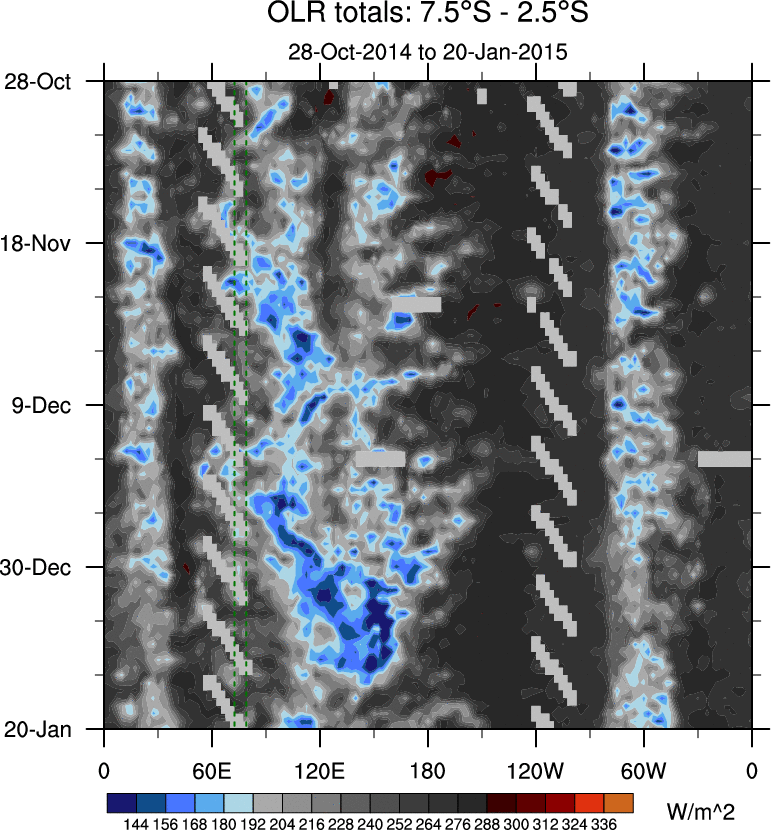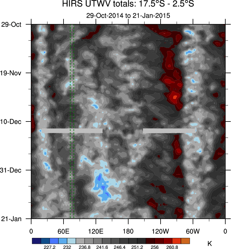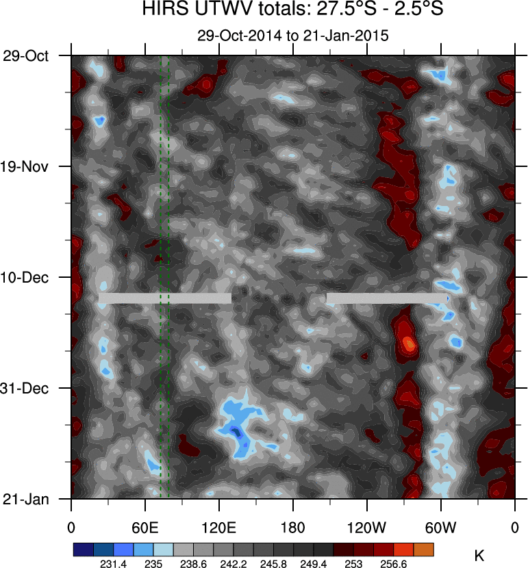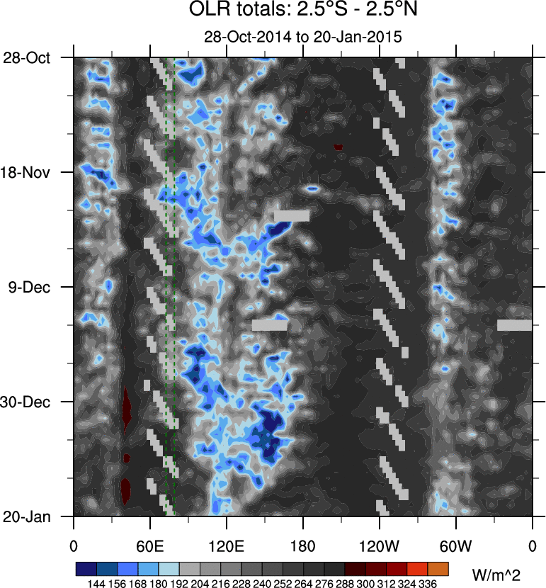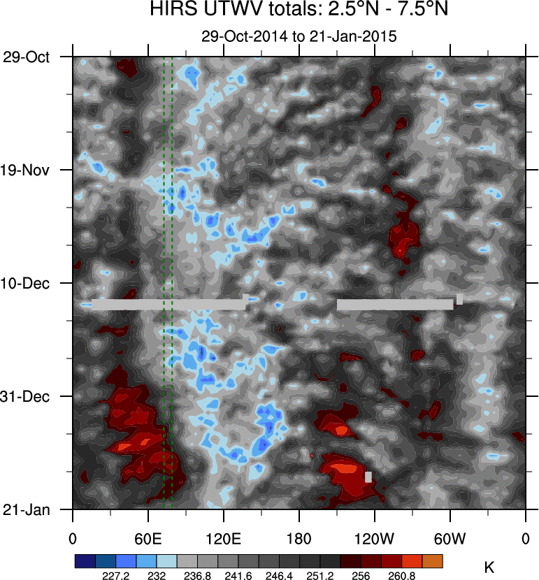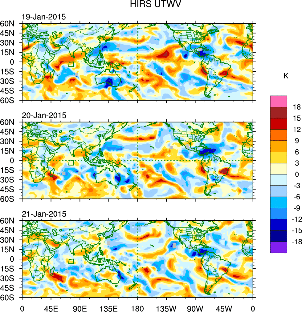 To identify tropical waves in near real-time, the OLR and UTWV data are filtered following Wheeler & Weickmann (2001 MWR). The daily anomalies are calculated using the first 3 harmonics of the seasonal cycle for 1979–2009. Missing values are then filled using linear interpolation in space and time. The most recent 365 days of anomalies are padded with 659 days of zeroes, and the result is filtered for each wave type.