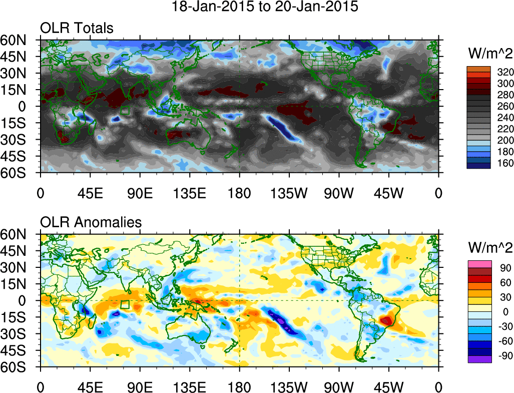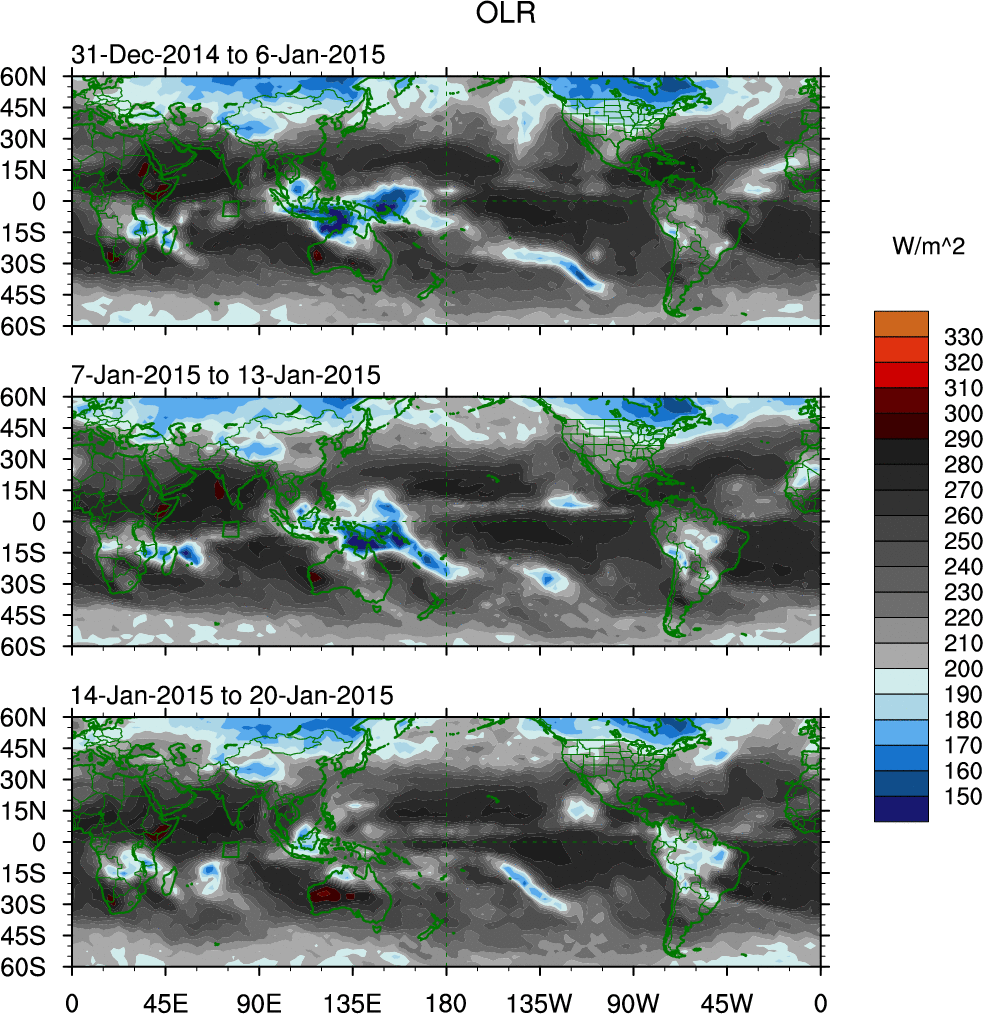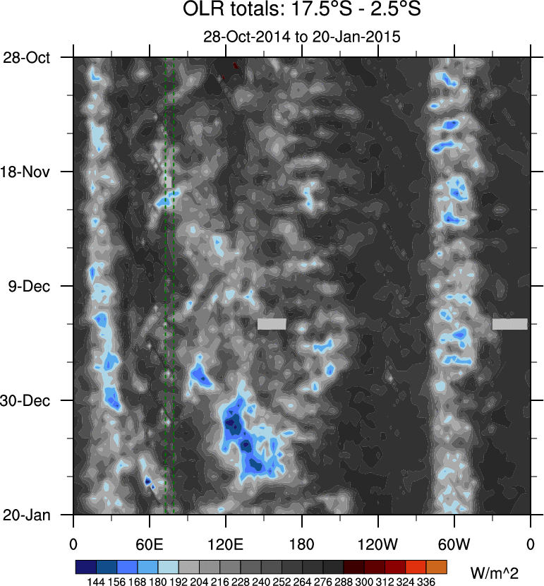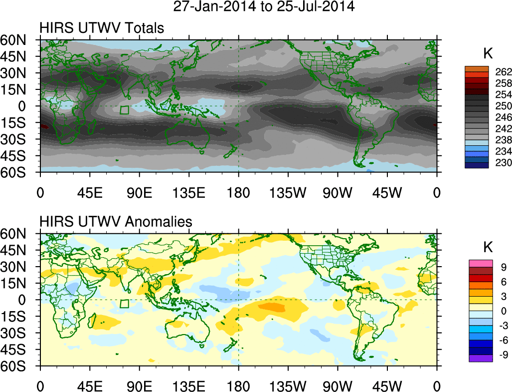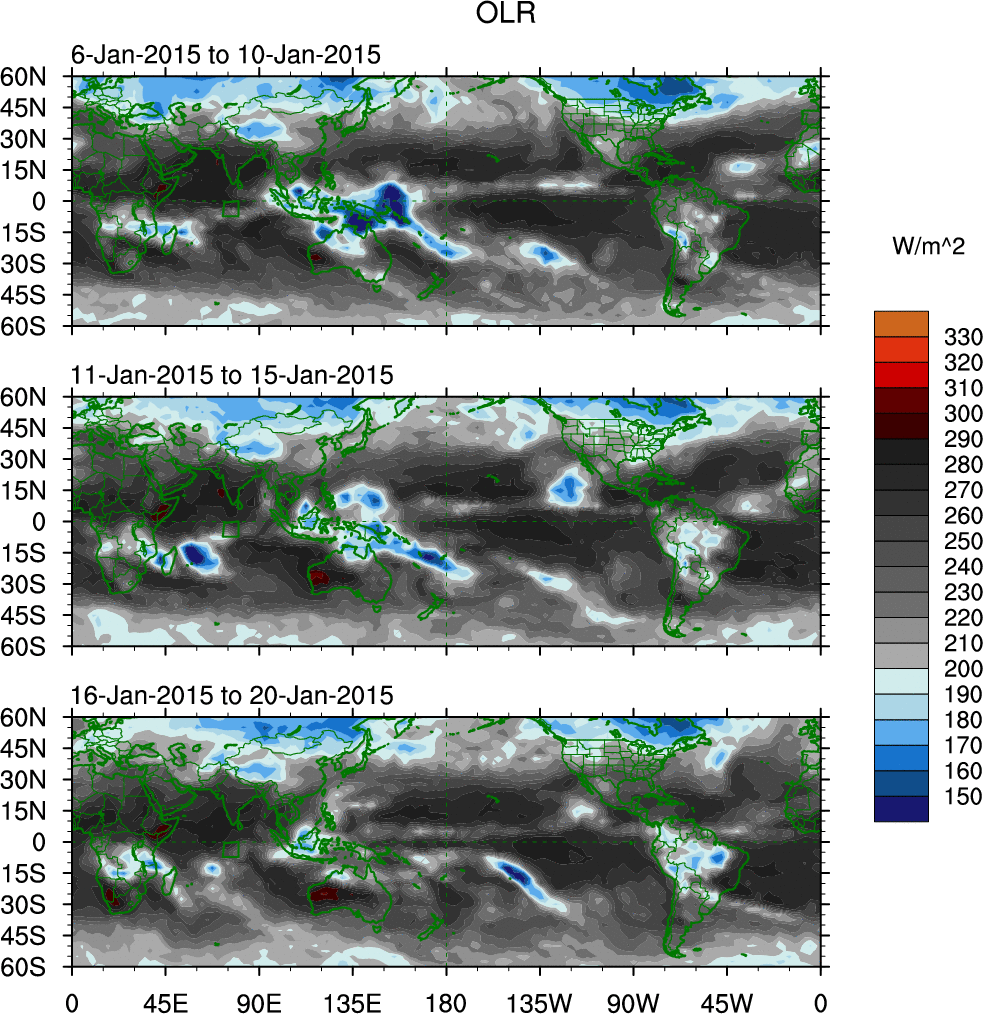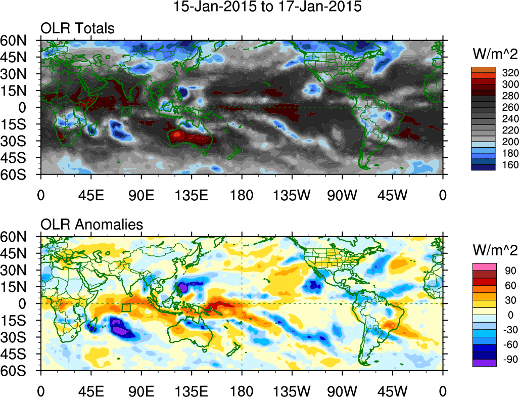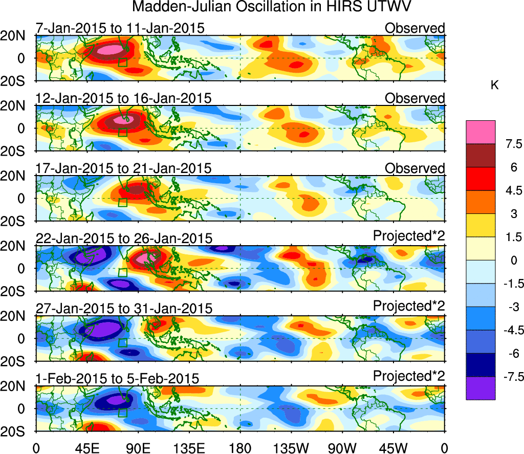 To identify tropical waves in near real-time, the OLR and UTWV data are filtered following Wheeler & Weickmann (2001 MWR). The daily anomalies are calculated using the first 3 harmonics of the seasonal cycle for 1979–2009. Missing values are then filled using linear interpolation in space and time. The most recent 365 days of anomalies are padded with 659 days of zeroes, and the result is filtered for each wave type.
