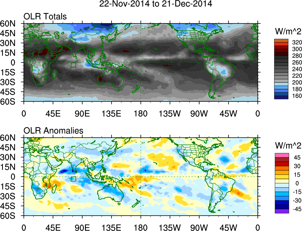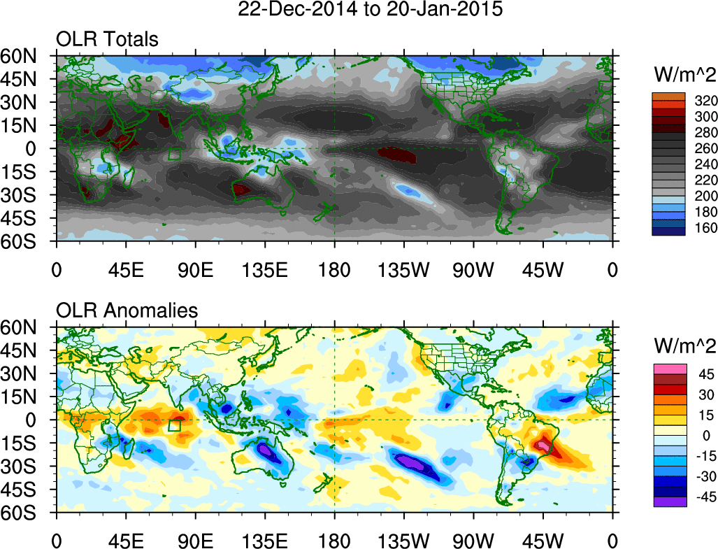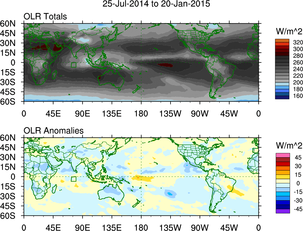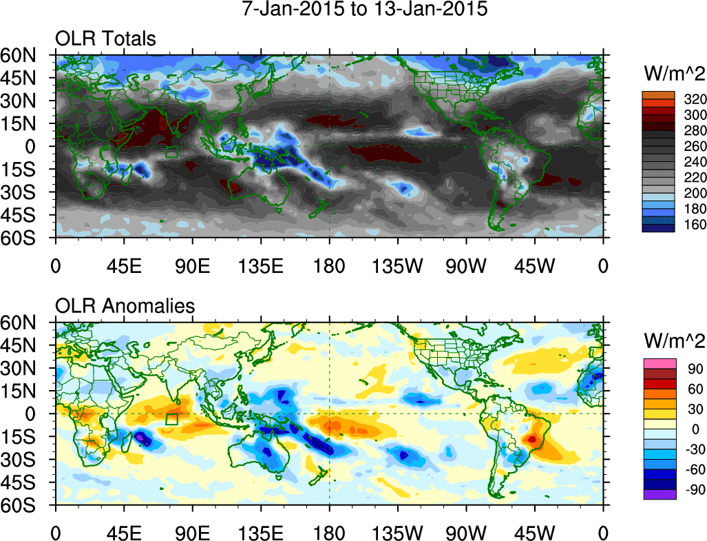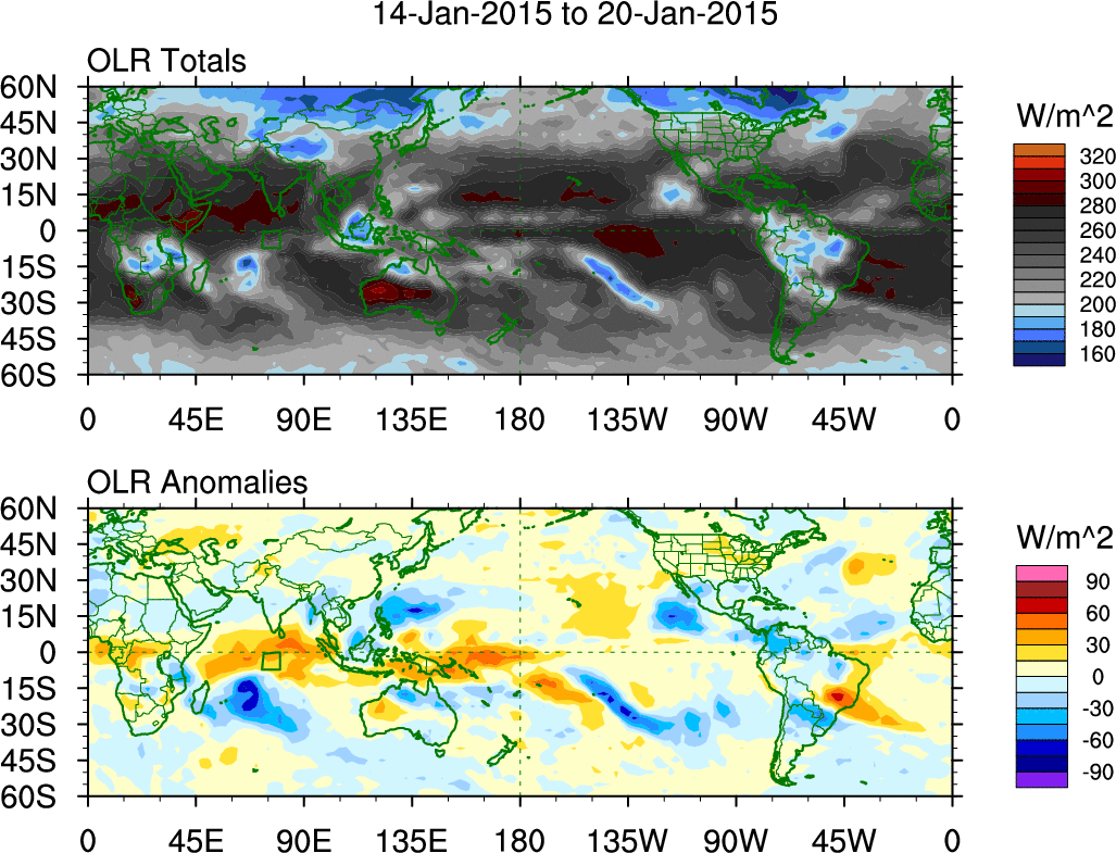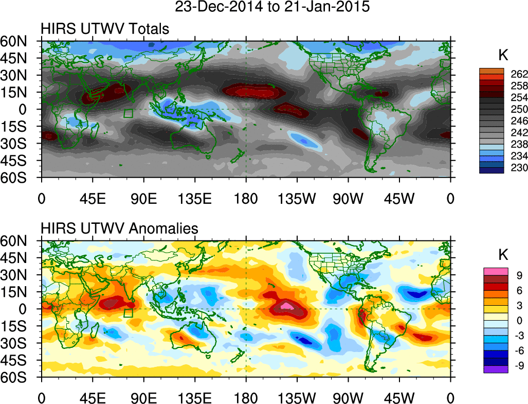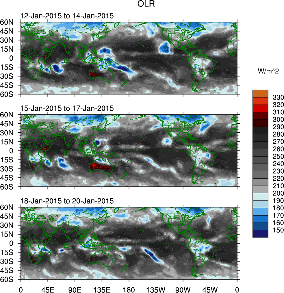 To identify tropical waves in near real-time, the OLR and UTWV data are filtered following Wheeler & Weickmann (2001 MWR). The daily anomalies are calculated using the first 3 harmonics of the seasonal cycle for 1979–2009. Missing values are then filled using linear interpolation in space and time. The most recent 365 days of anomalies are padded with 659 days of zeroes, and the result is filtered for each wave type.