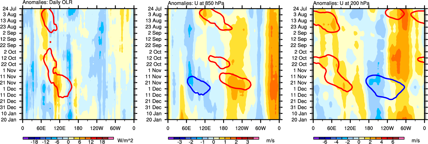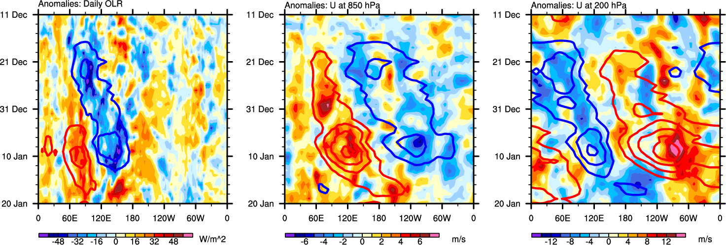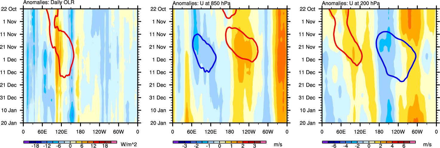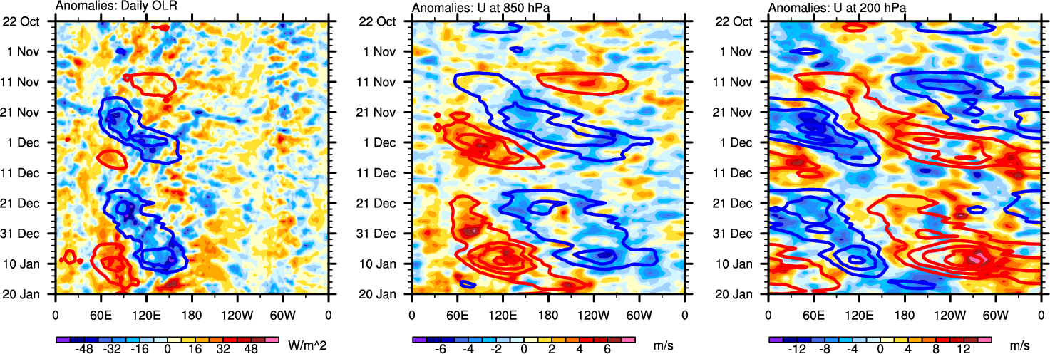 The Hovmöllers show longitude-time plots for OLR, U-850, and U-200. The shading indicates the observed anomalies, while the contours are the projection of those anomalies onto the RMM EOFs.