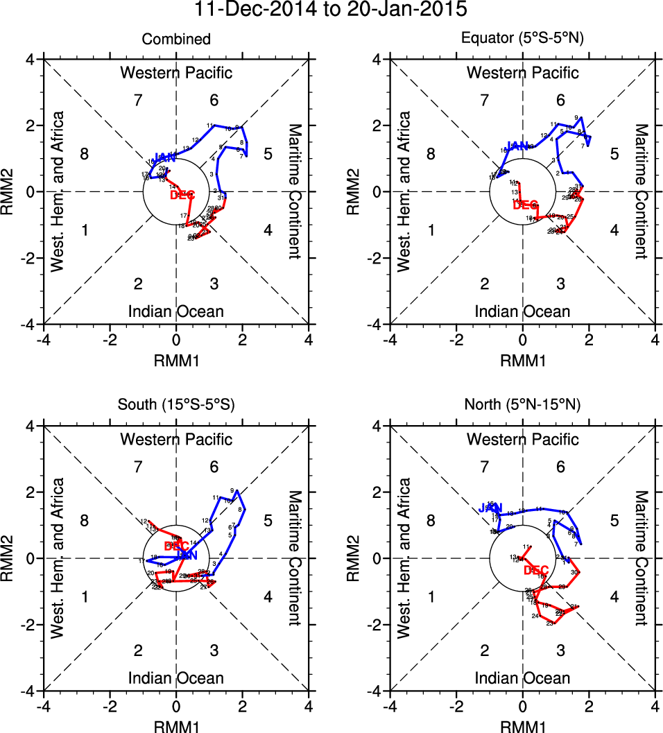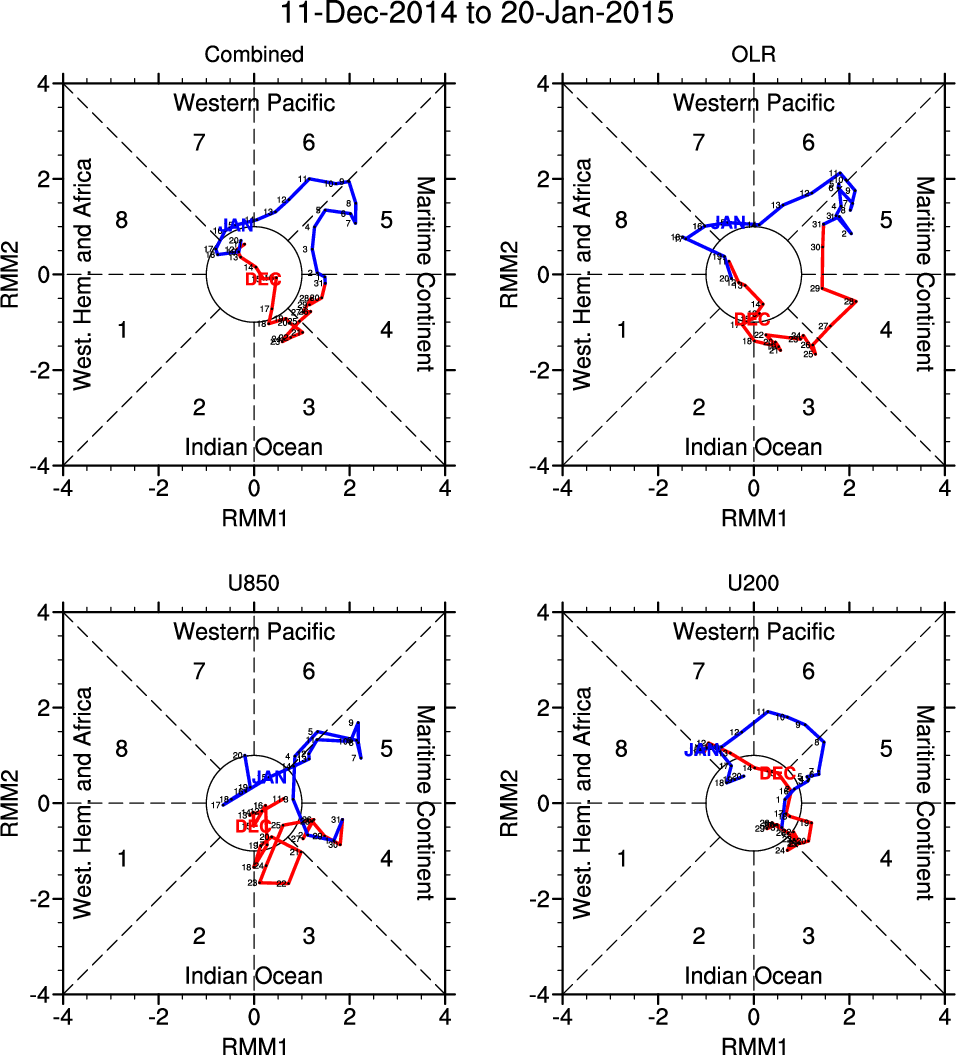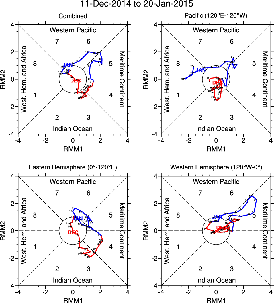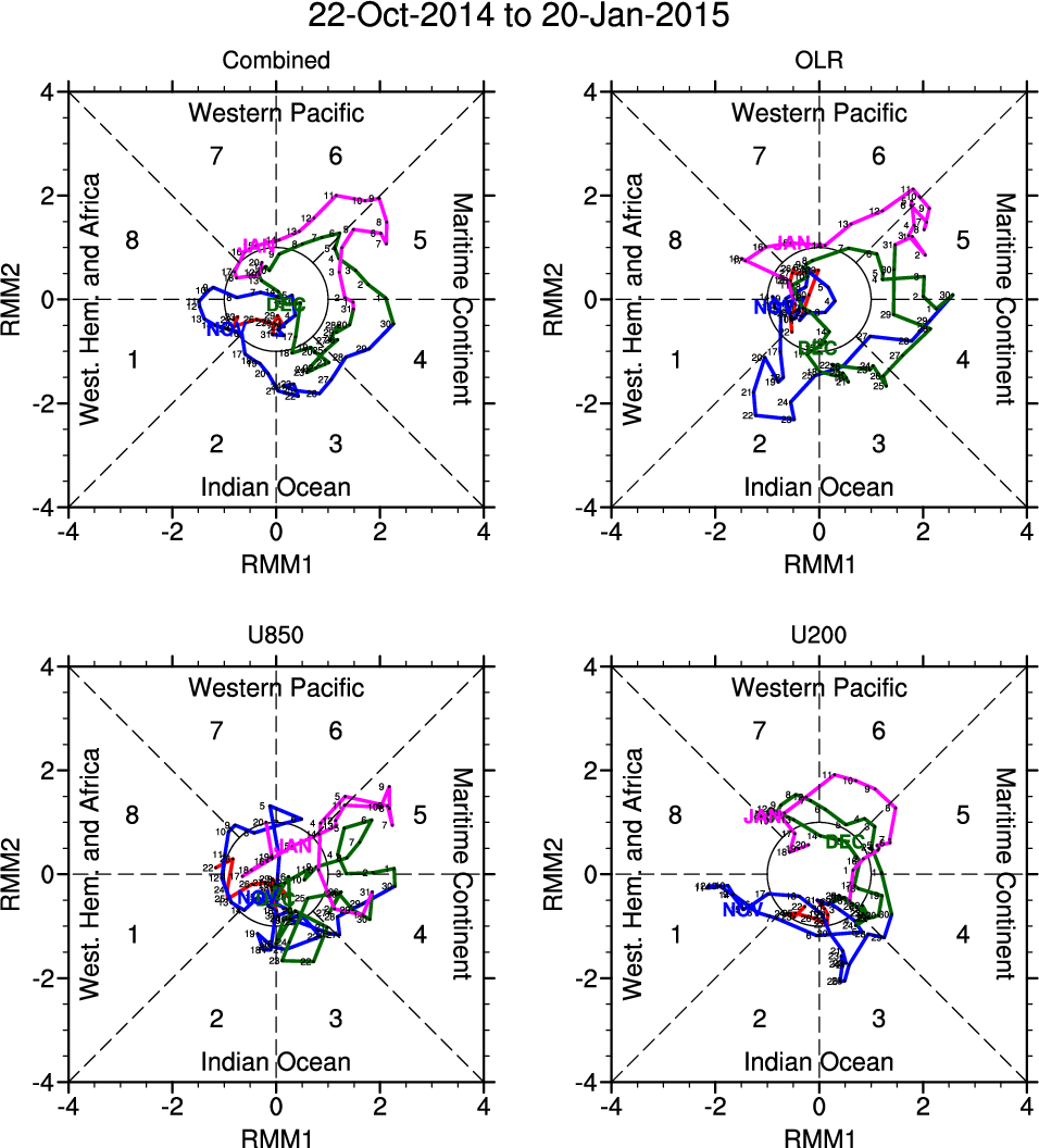 Wheeler and Hendon (2004) constructed the RMM index for monitoring the MJO. This index consists of the first two principal components (PCs) of OLR, 850-hPa zonal wind, and 200-hPa zonal wind averaged 15S-15N.