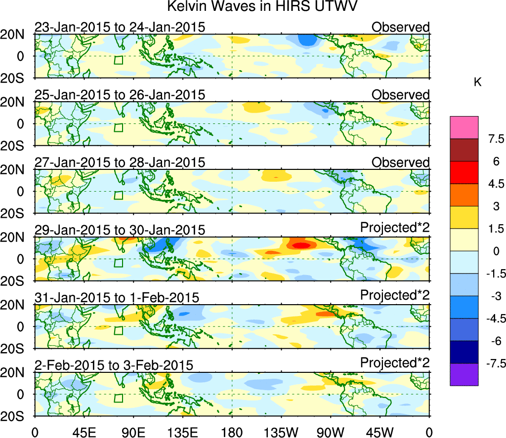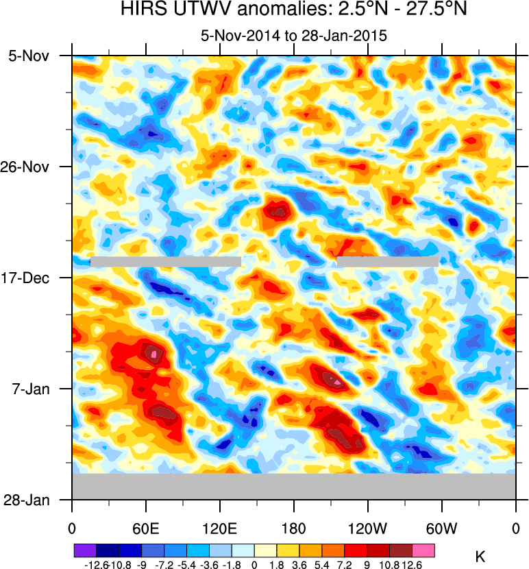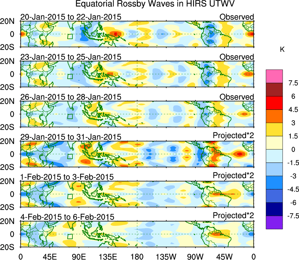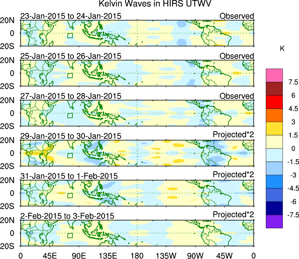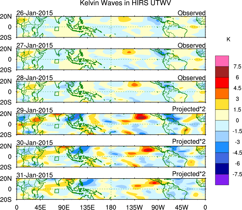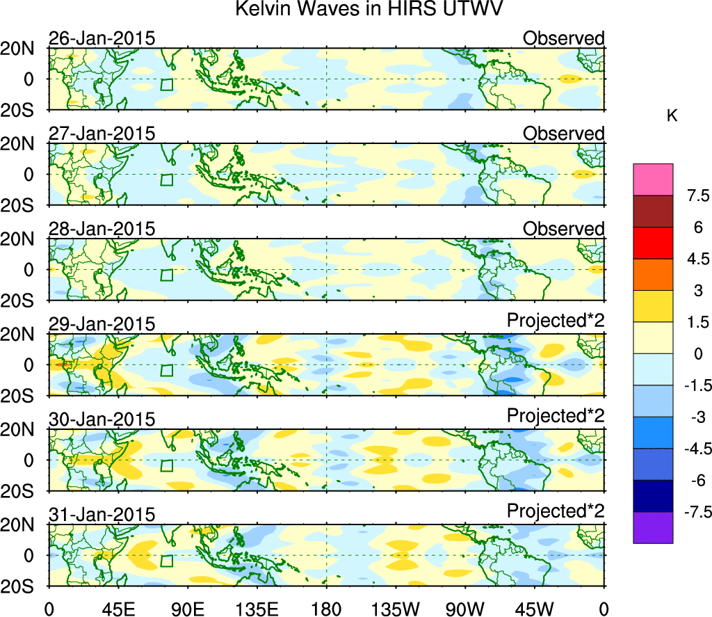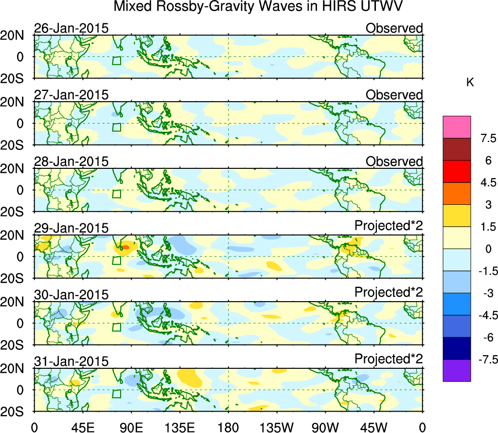 To identify tropical waves in near real-time, the OLR and UTWV data are filtered following Wheeler & Weickmann (2001 MWR). The daily anomalies are calculated using the first 3 harmonics of the seasonal cycle for 1979–2009. Missing values are then filled using linear interpolation in space and time. The most recent 365 days of anomalies are padded with 659 days of zeroes, and the result is filtered for each wave type.