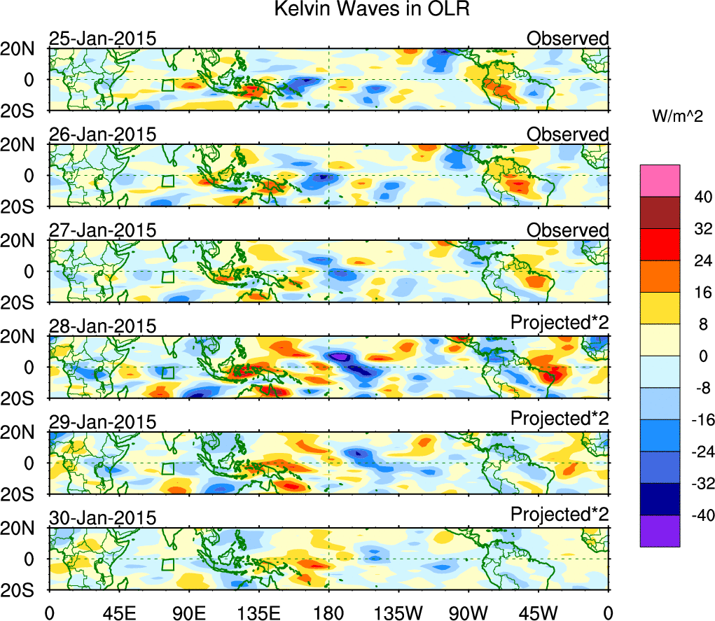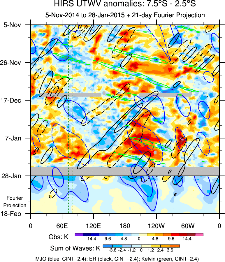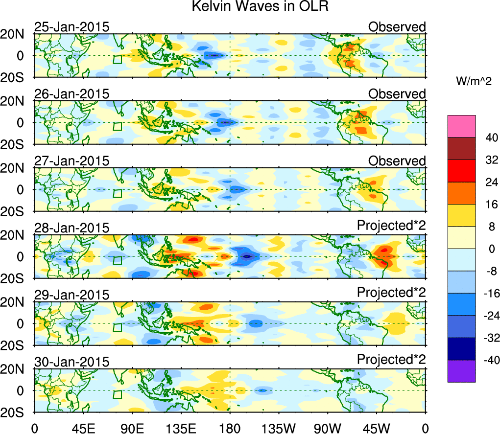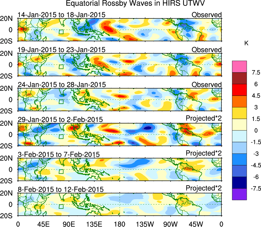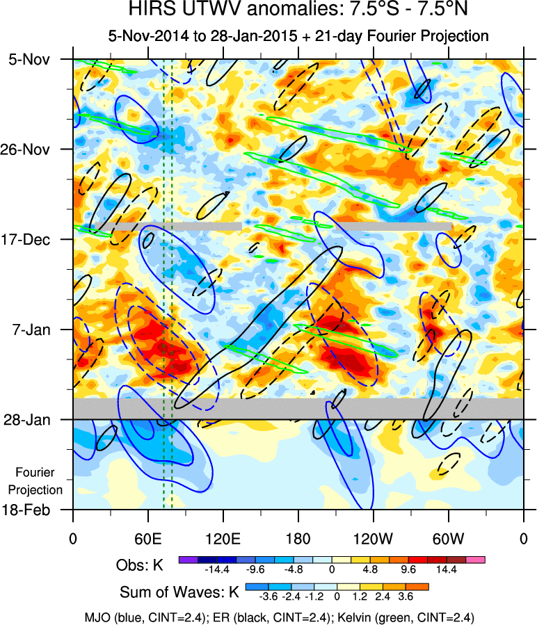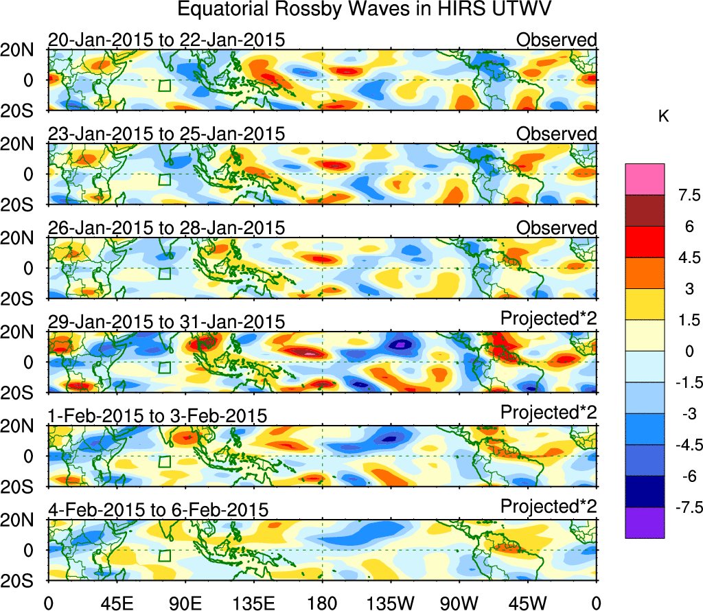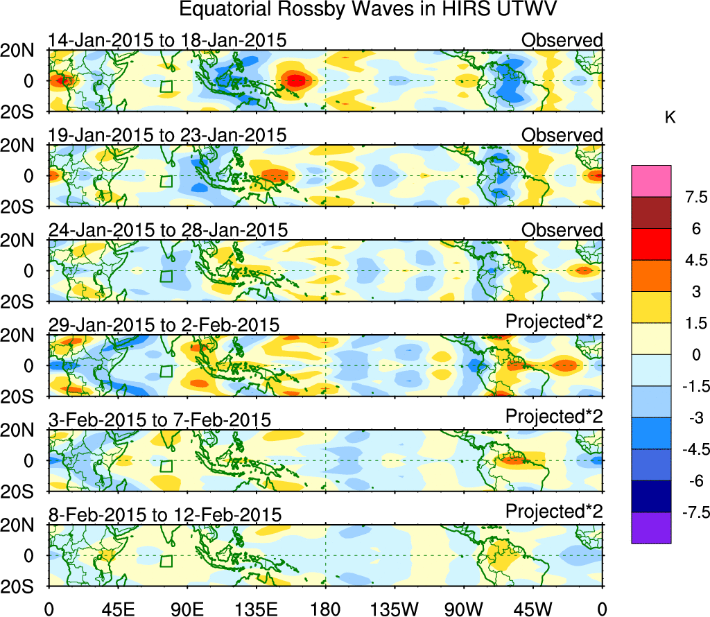 To identify tropical waves in near real-time, the OLR and UTWV data are filtered following Wheeler & Weickmann (2001 MWR). The daily anomalies are calculated using the first 3 harmonics of the seasonal cycle for 1979–2009. Missing values are then filled using linear interpolation in space and time. The most recent 365 days of anomalies are padded with 659 days of zeroes, and the result is filtered for each wave type.