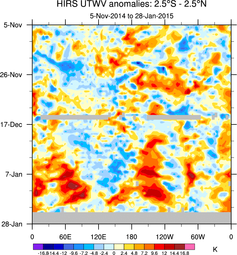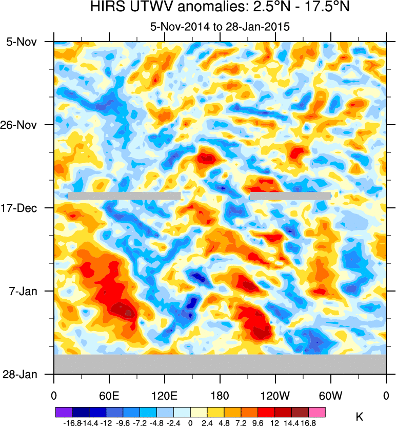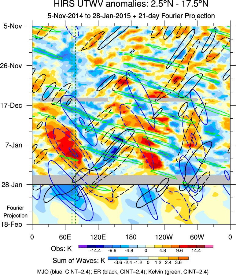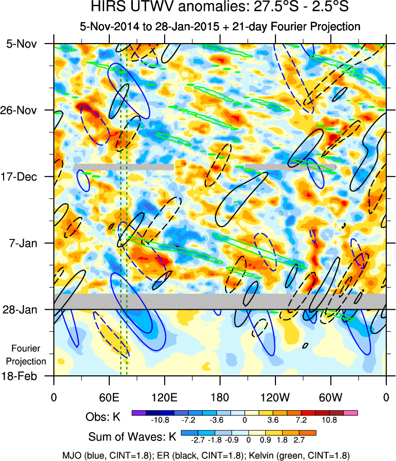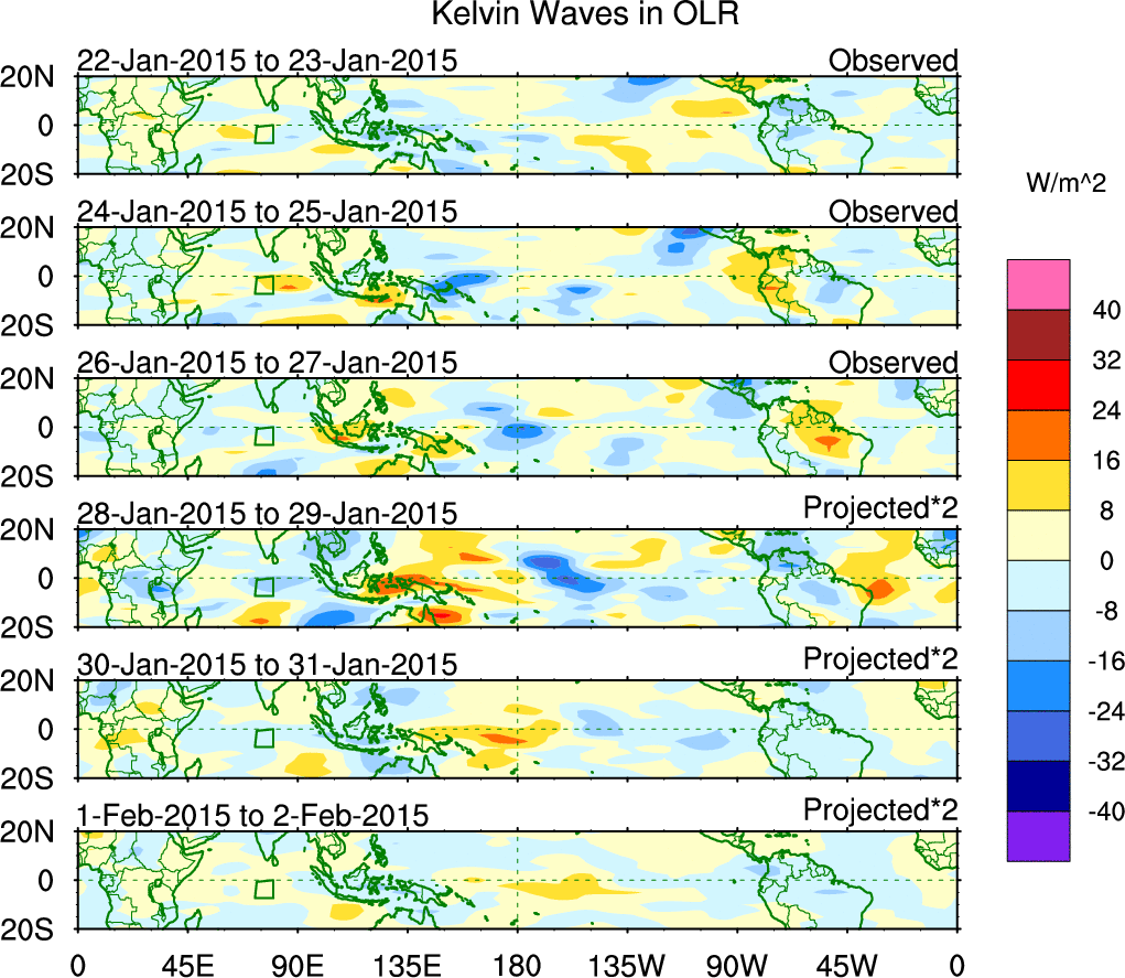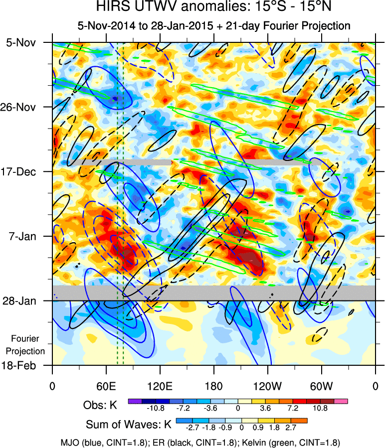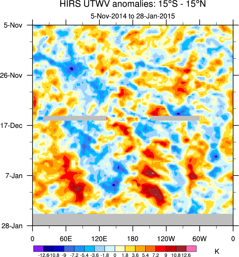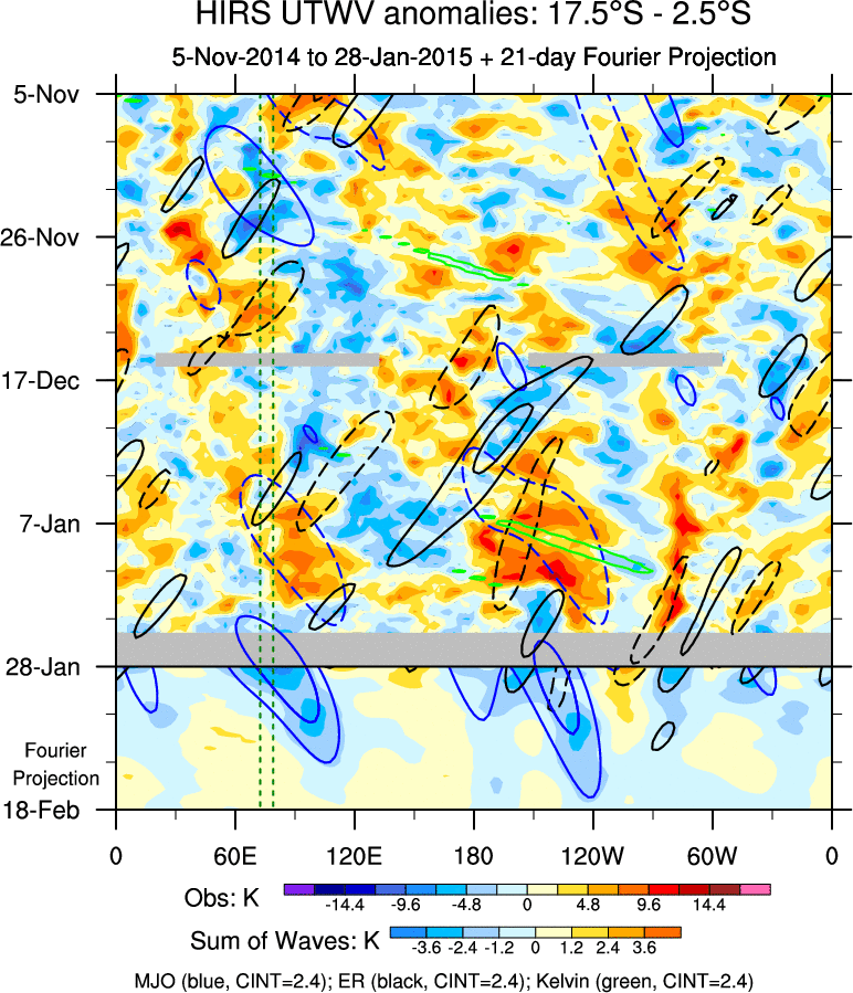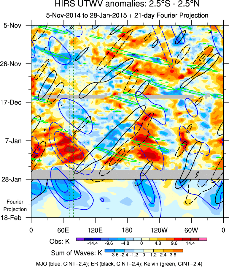 To identify tropical waves in near real-time, the OLR and UTWV data are filtered following Wheeler & Weickmann (2001 MWR). The daily anomalies are calculated using the first 3 harmonics of the seasonal cycle for 1979–2009. Missing values are then filled using linear interpolation in space and time. The most recent 365 days of anomalies are padded with 659 days of zeroes, and the result is filtered for each wave type.