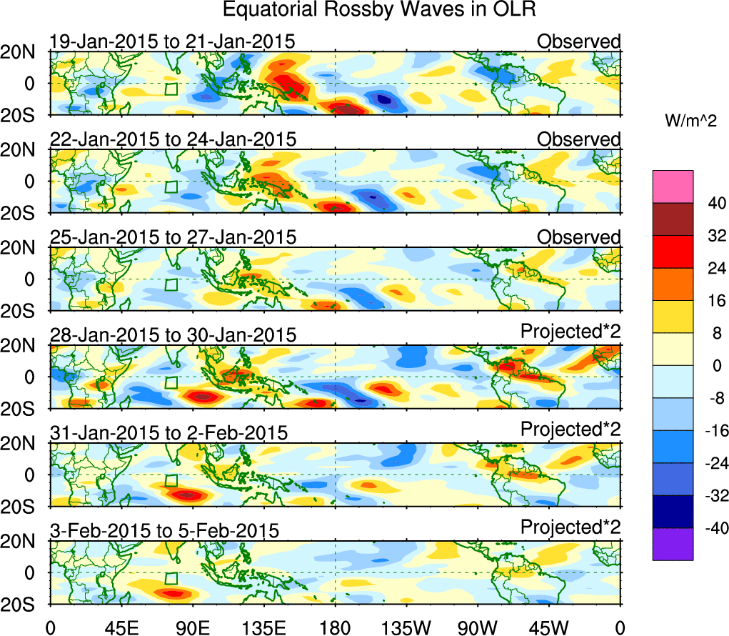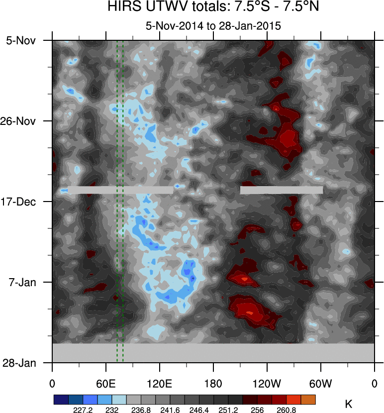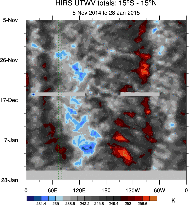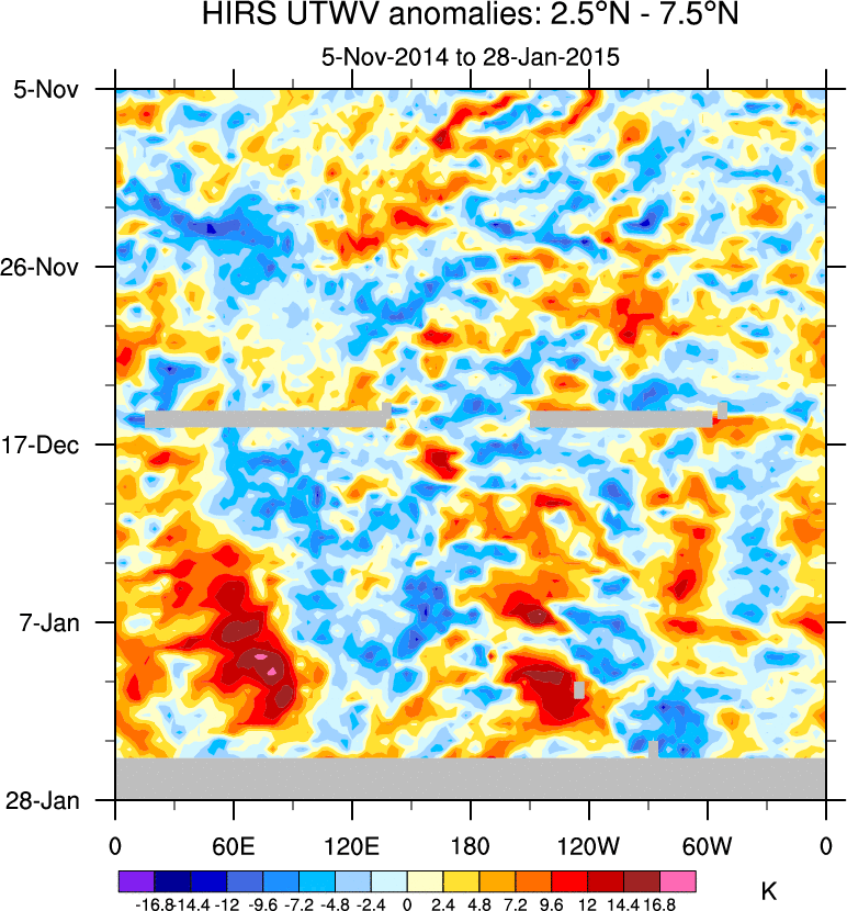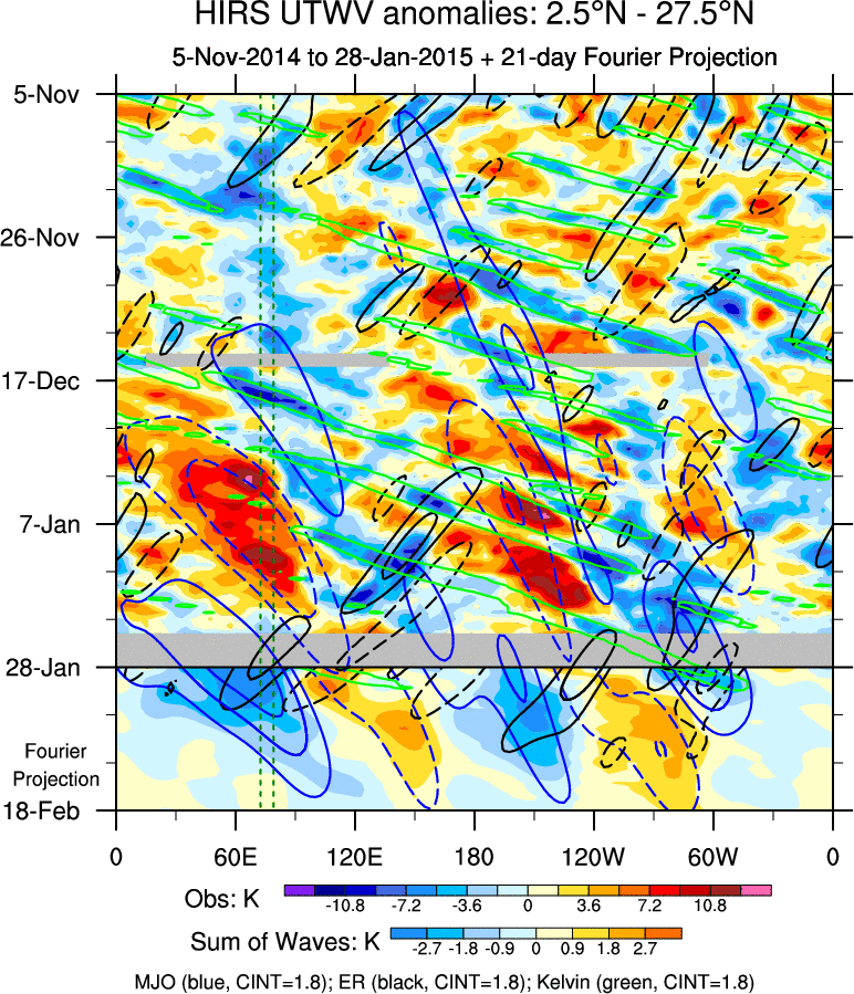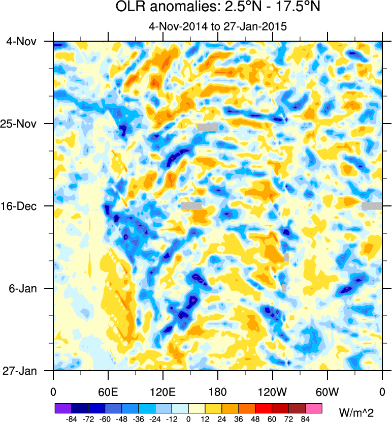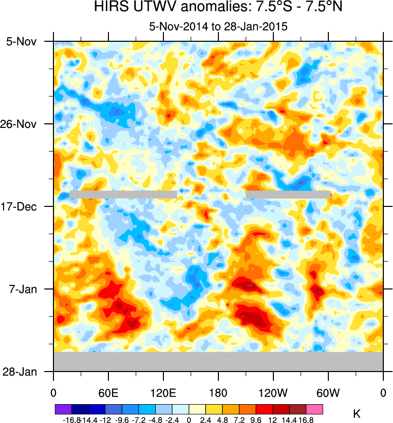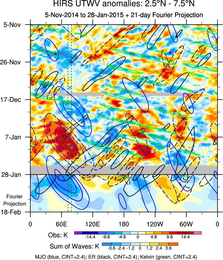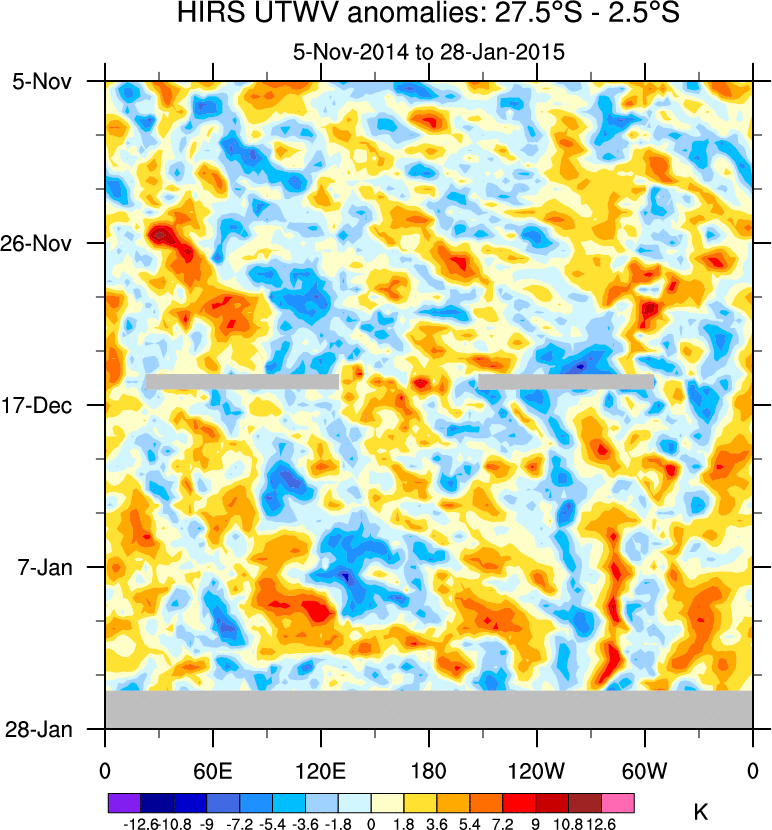 To identify tropical waves in near real-time, the OLR and UTWV data are filtered following Wheeler & Weickmann (2001 MWR). The daily anomalies are calculated using the first 3 harmonics of the seasonal cycle for 1979–2009. Missing values are then filled using linear interpolation in space and time. The most recent 365 days of anomalies are padded with 659 days of zeroes, and the result is filtered for each wave type.
