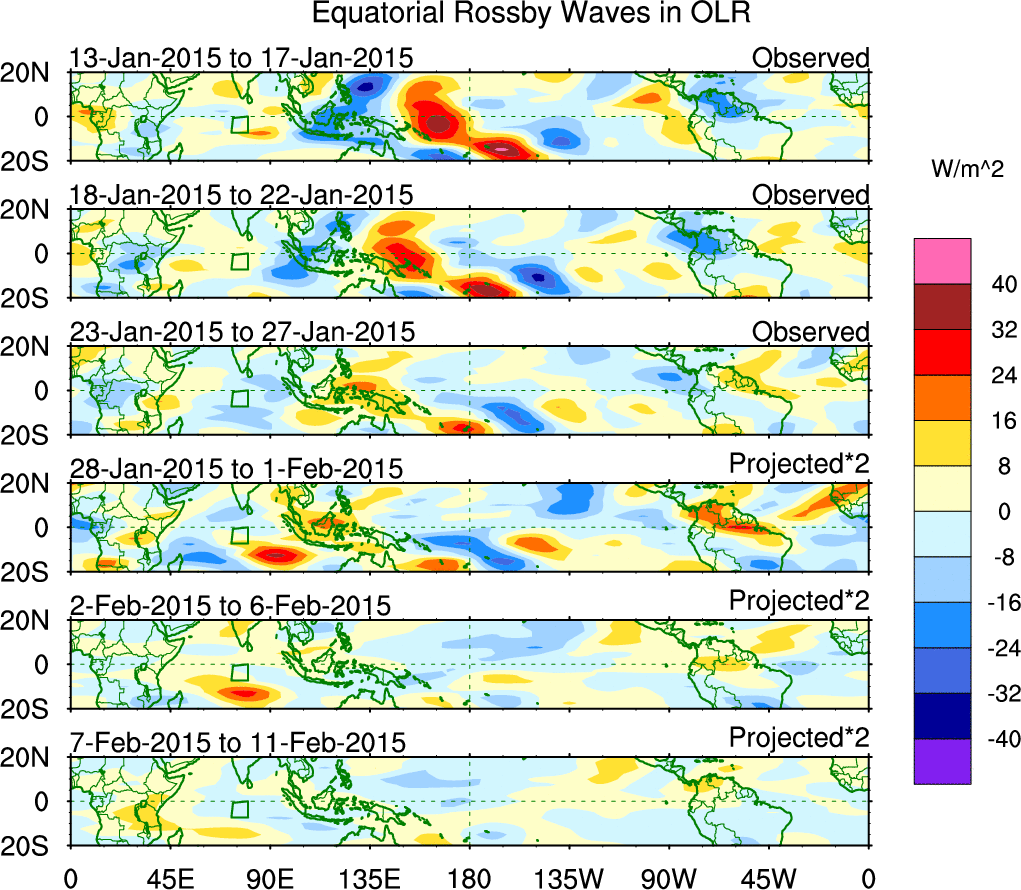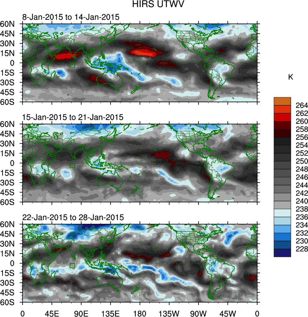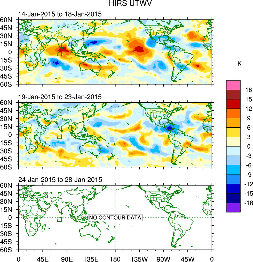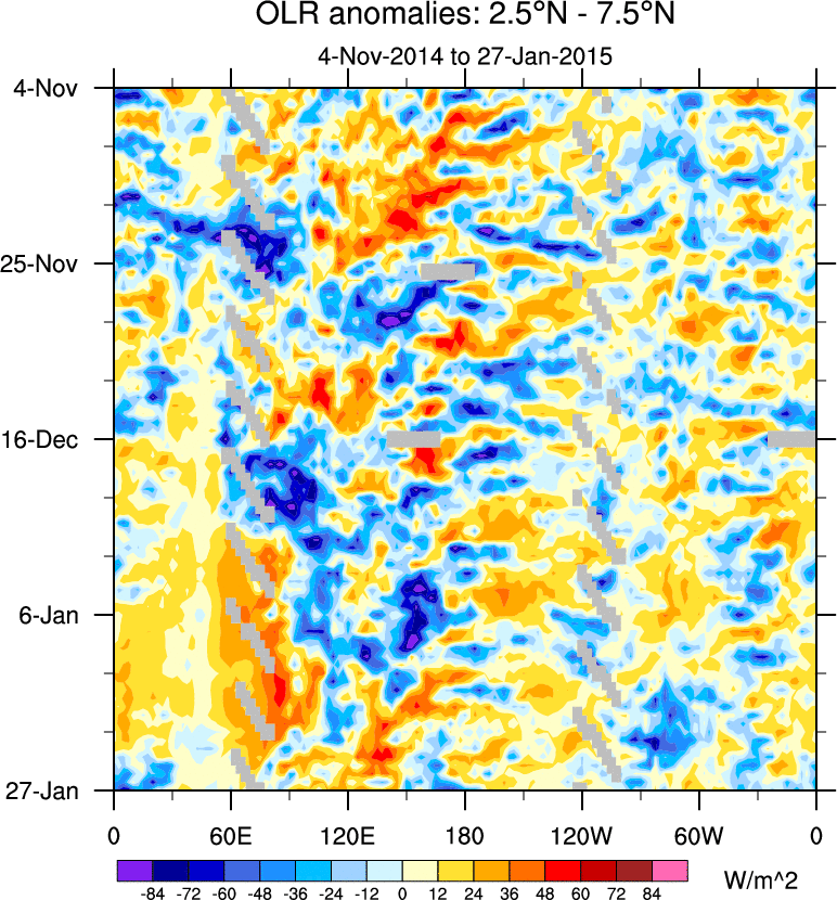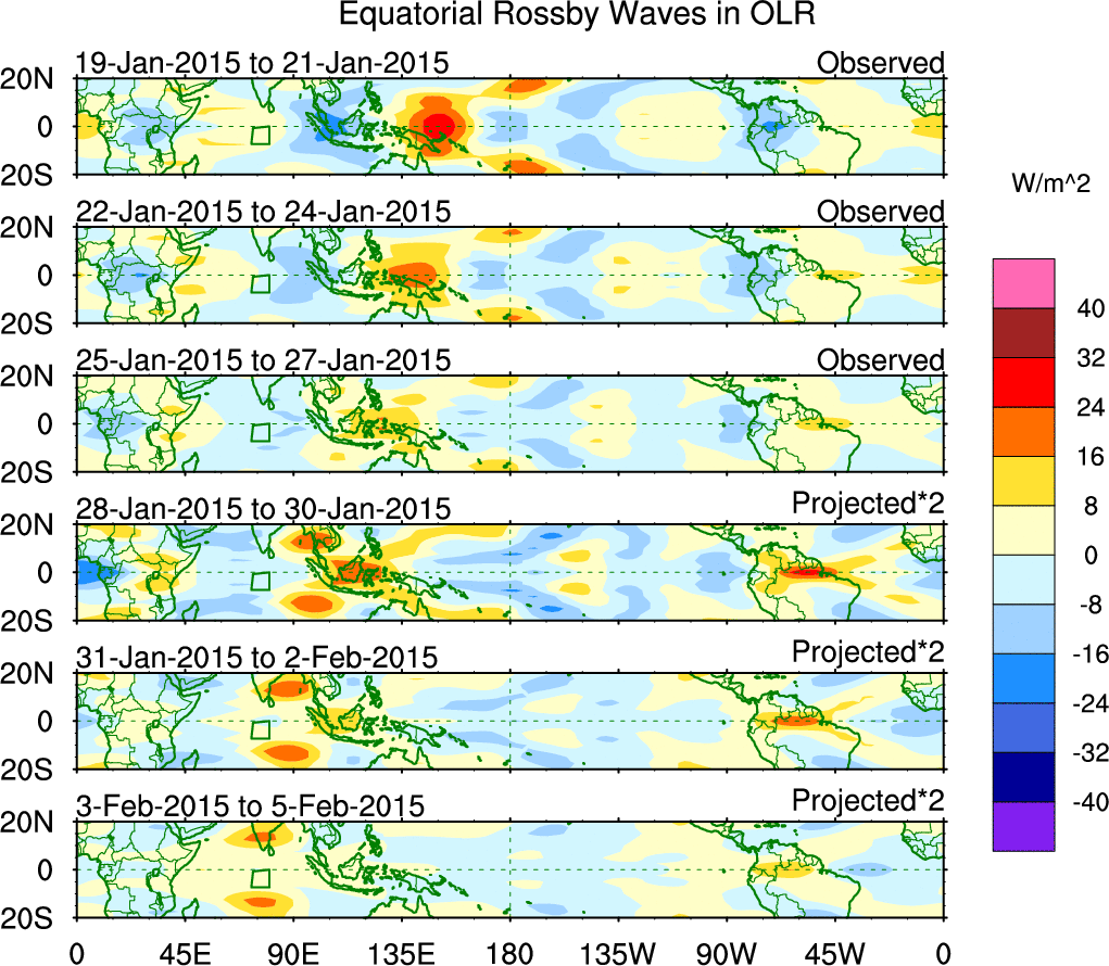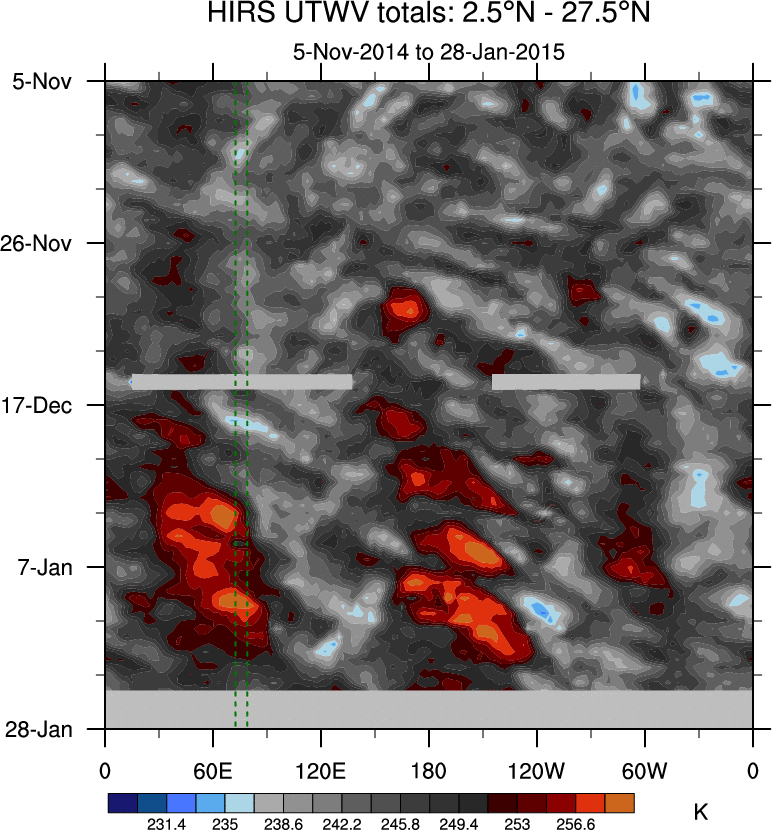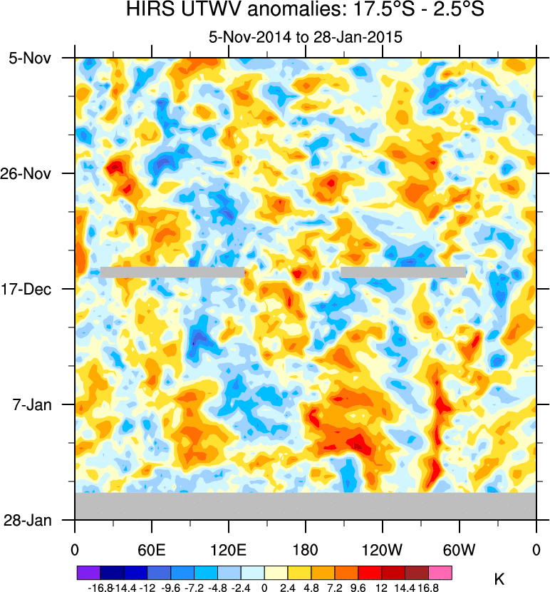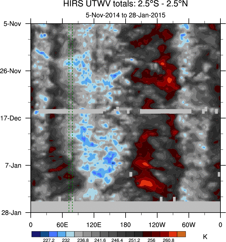 To identify tropical waves in near real-time, the OLR and UTWV data are filtered following Wheeler & Weickmann (2001 MWR). The daily anomalies are calculated using the first 3 harmonics of the seasonal cycle for 1979–2009. Missing values are then filled using linear interpolation in space and time. The most recent 365 days of anomalies are padded with 659 days of zeroes, and the result is filtered for each wave type.