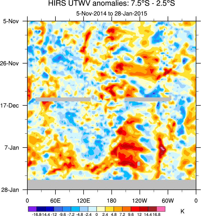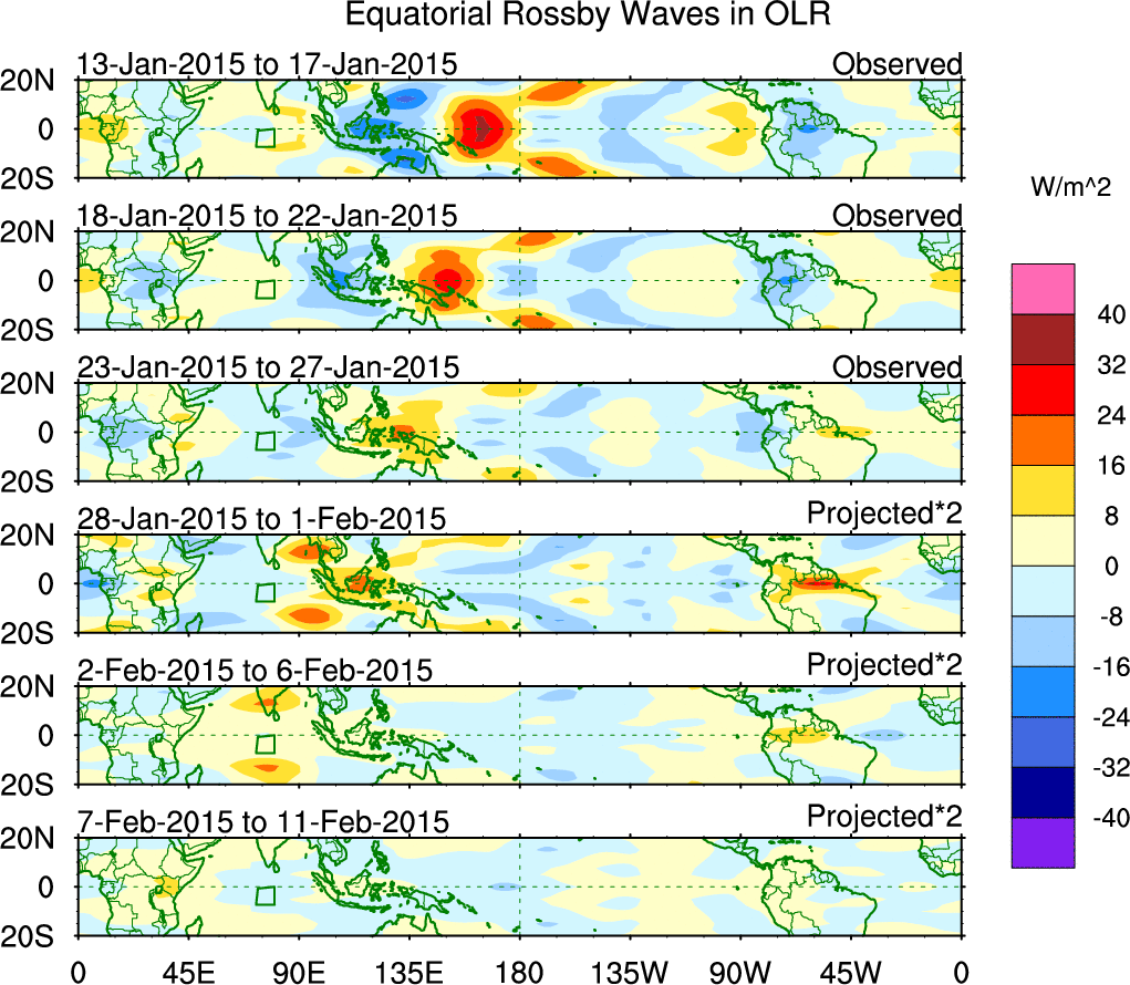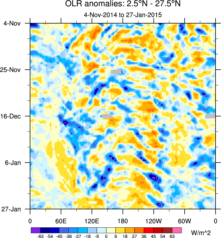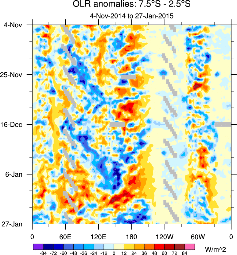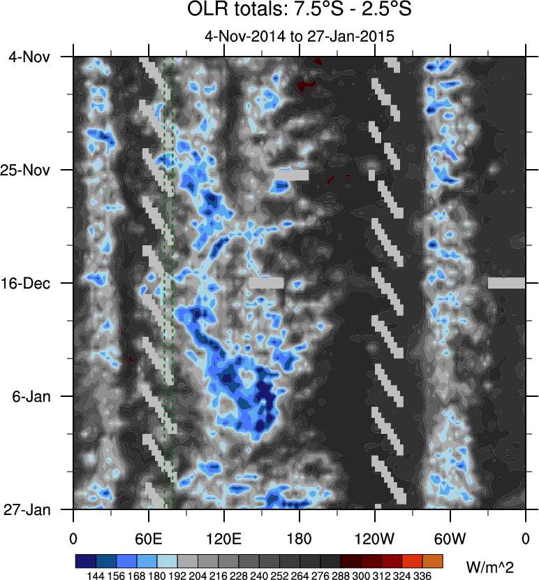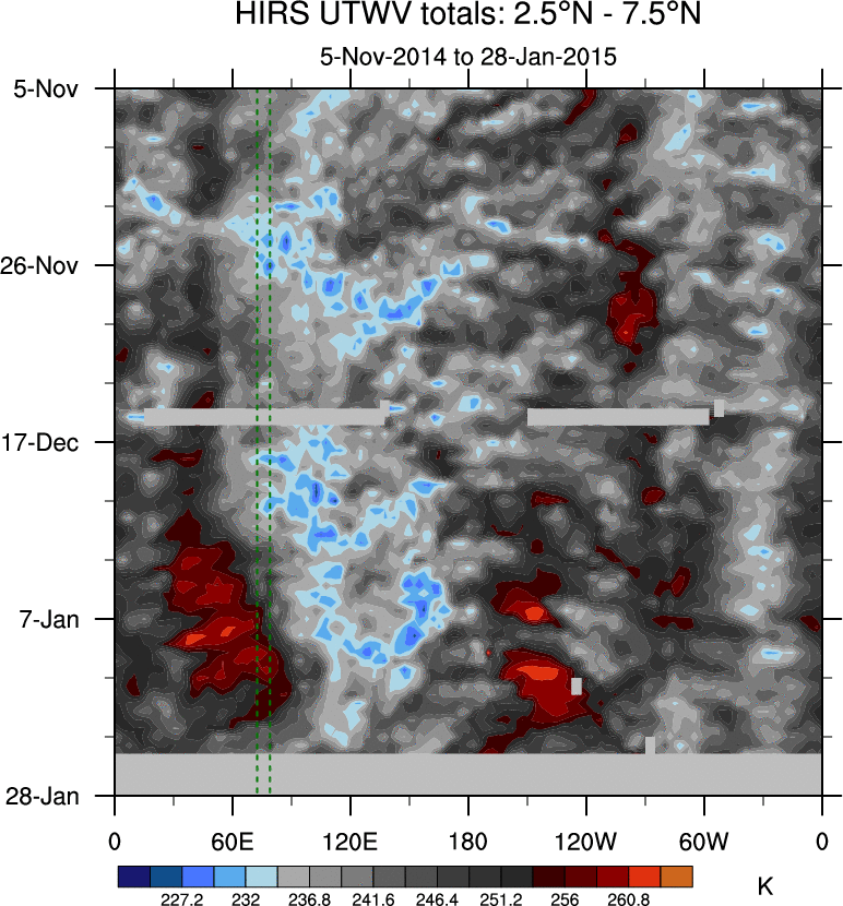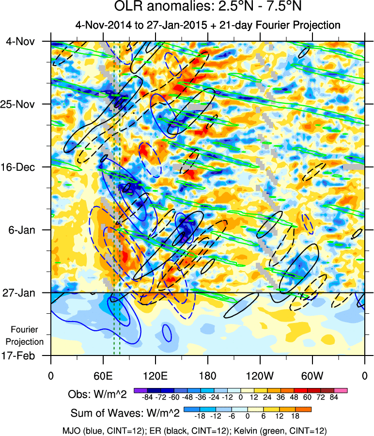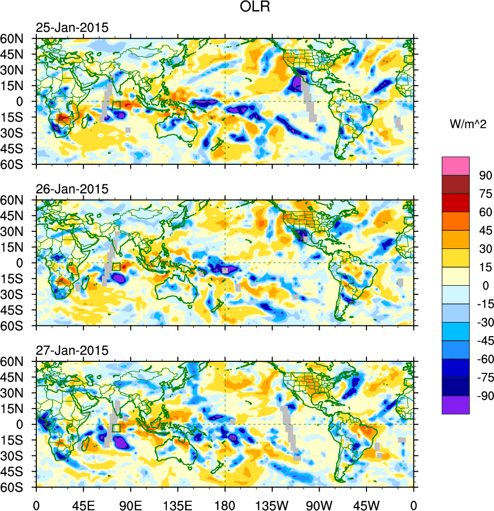 To identify tropical waves in near real-time, the OLR and UTWV data are filtered following Wheeler & Weickmann (2001 MWR). The daily anomalies are calculated using the first 3 harmonics of the seasonal cycle for 1979–2009. Missing values are then filled using linear interpolation in space and time. The most recent 365 days of anomalies are padded with 659 days of zeroes, and the result is filtered for each wave type.