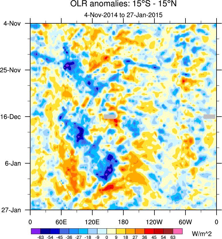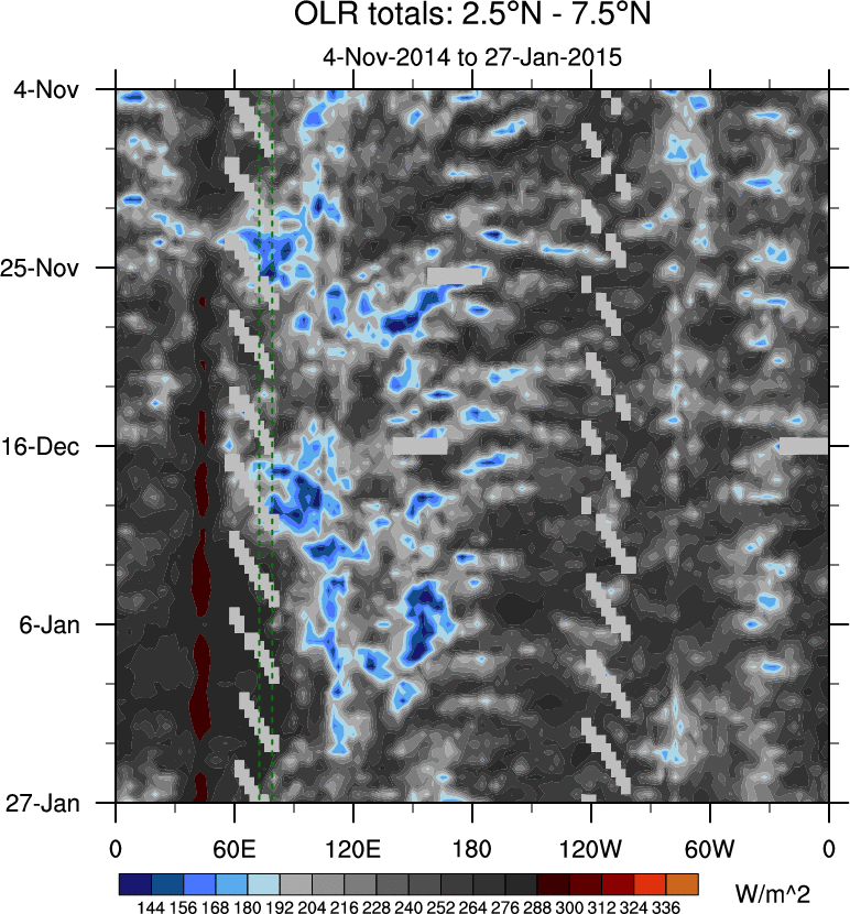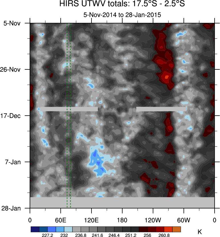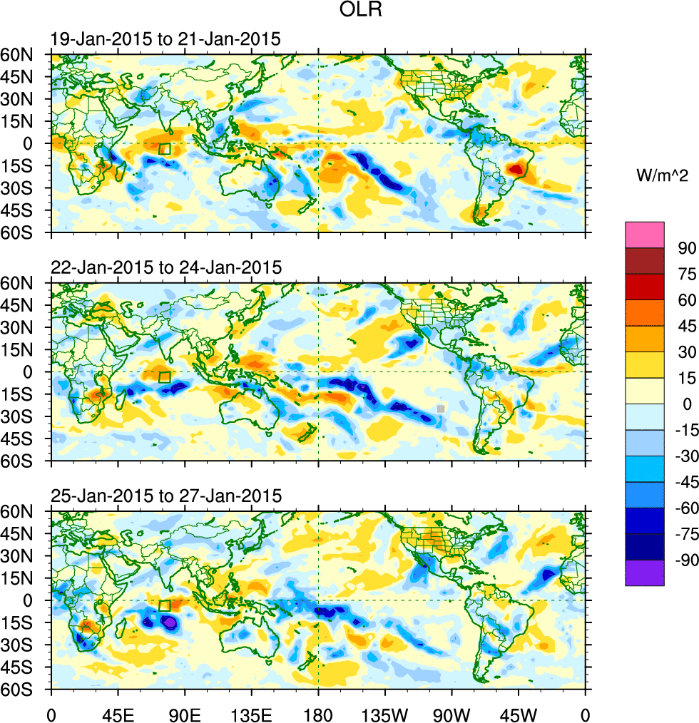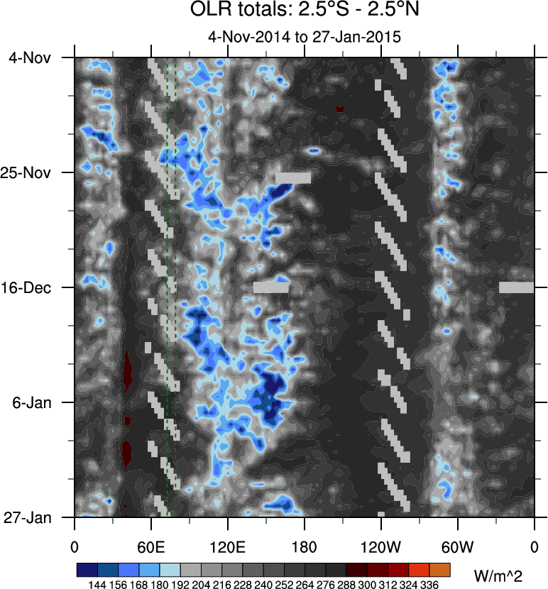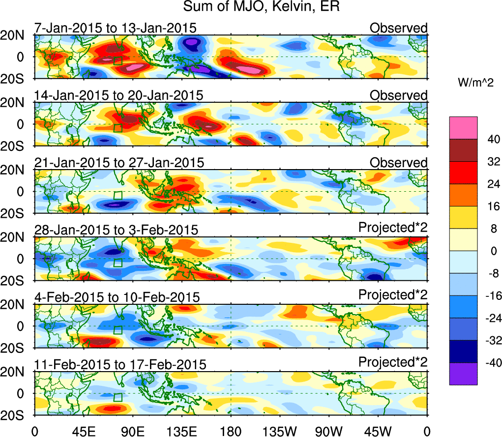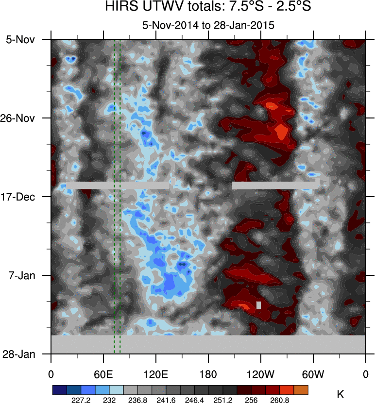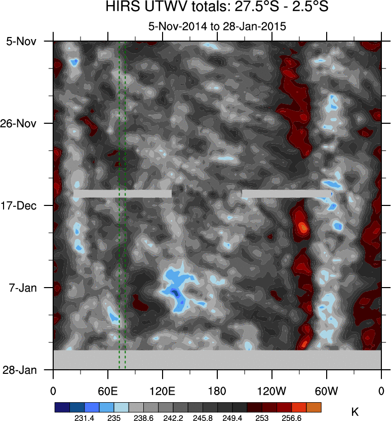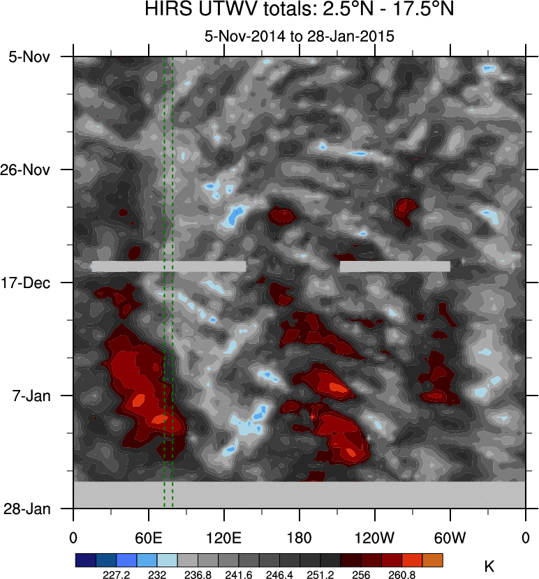 To identify tropical waves in near real-time, the OLR and UTWV data are filtered following Wheeler & Weickmann (2001 MWR). The daily anomalies are calculated using the first 3 harmonics of the seasonal cycle for 1979–2009. Missing values are then filled using linear interpolation in space and time. The most recent 365 days of anomalies are padded with 659 days of zeroes, and the result is filtered for each wave type.