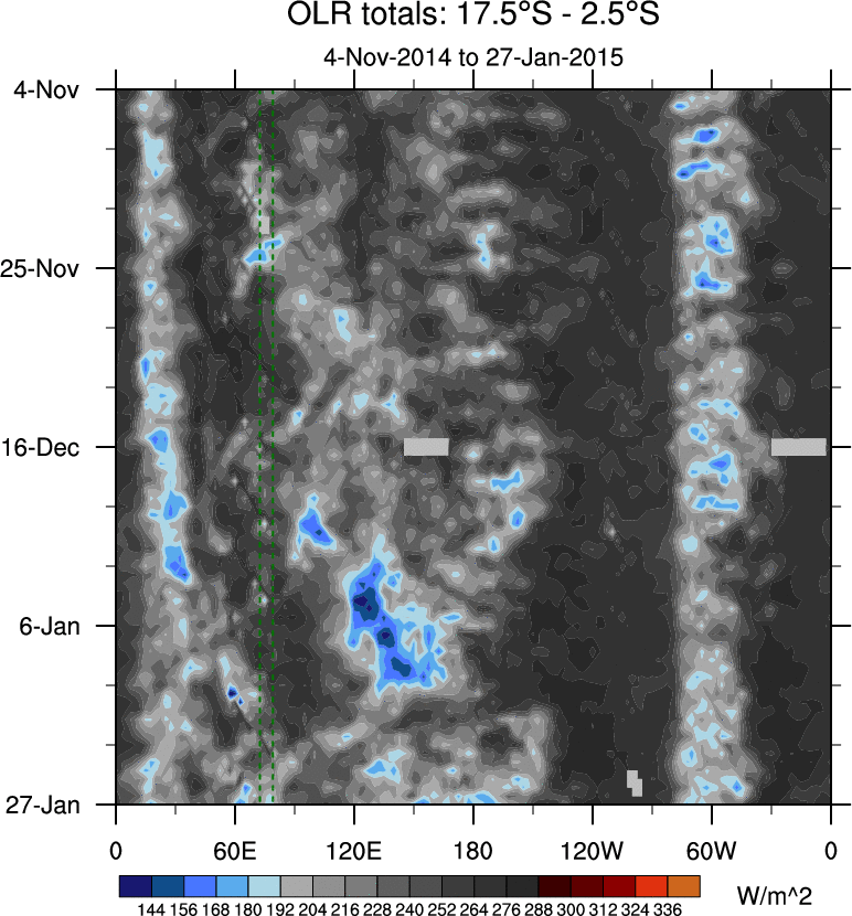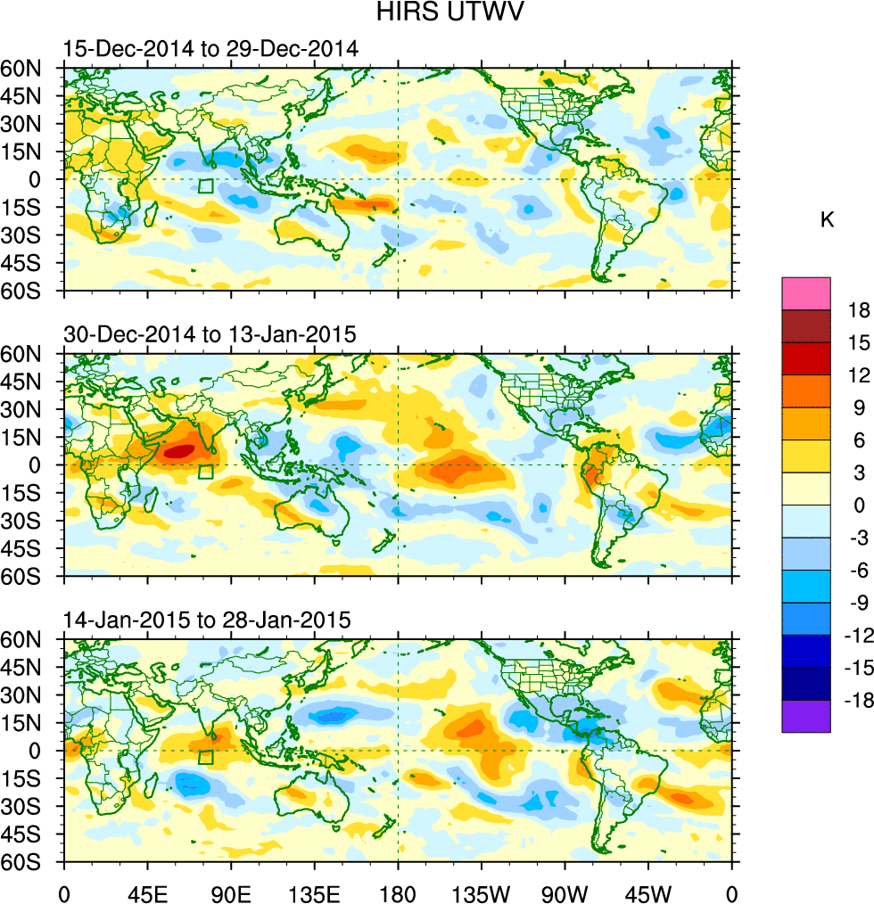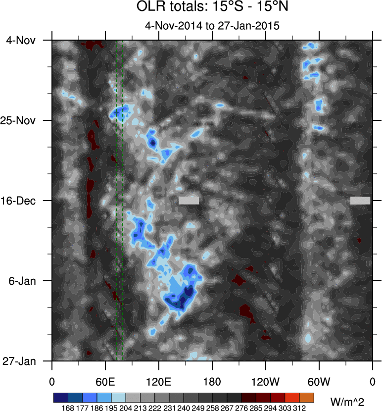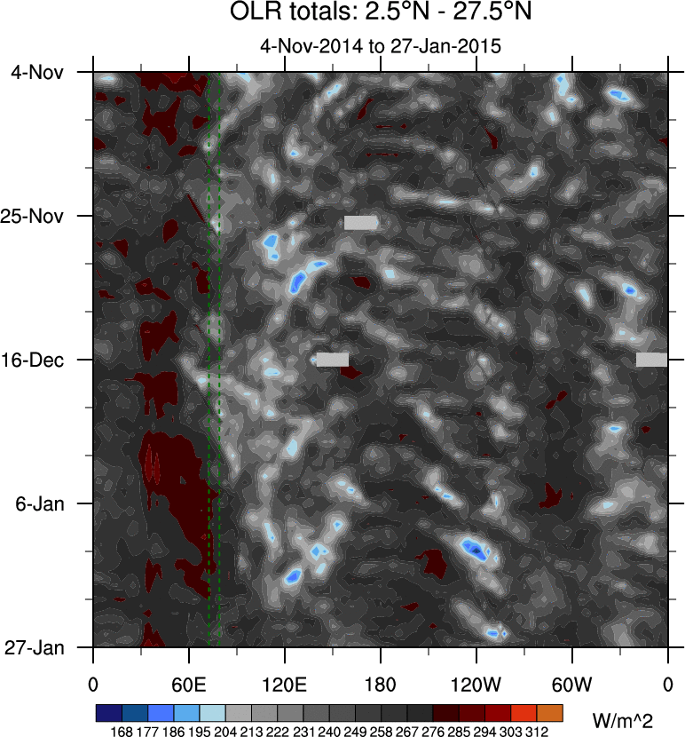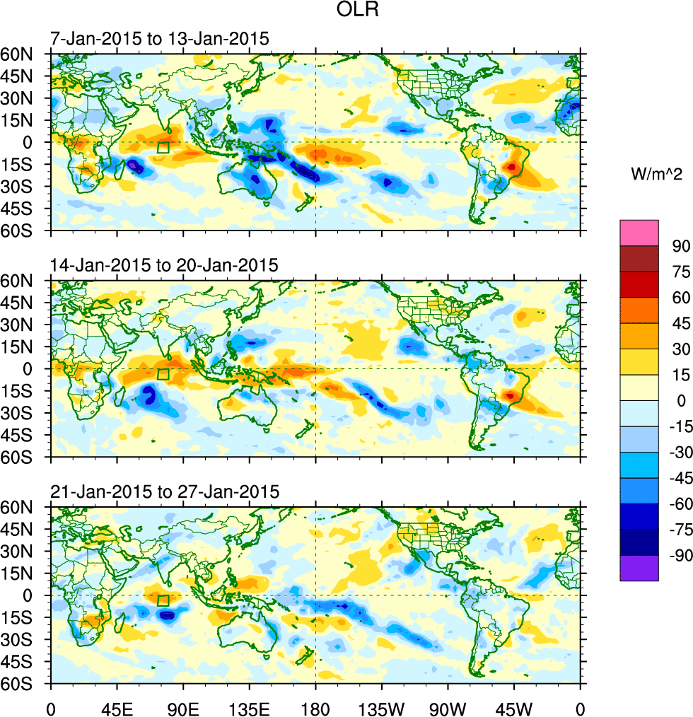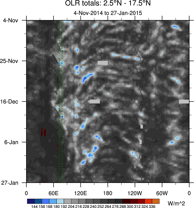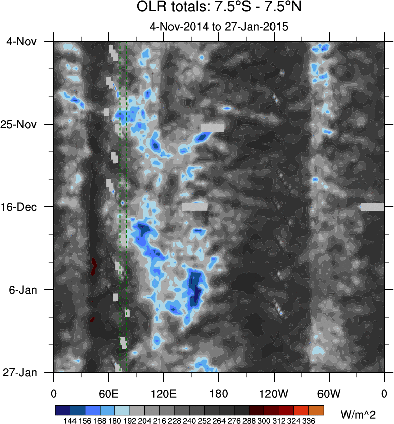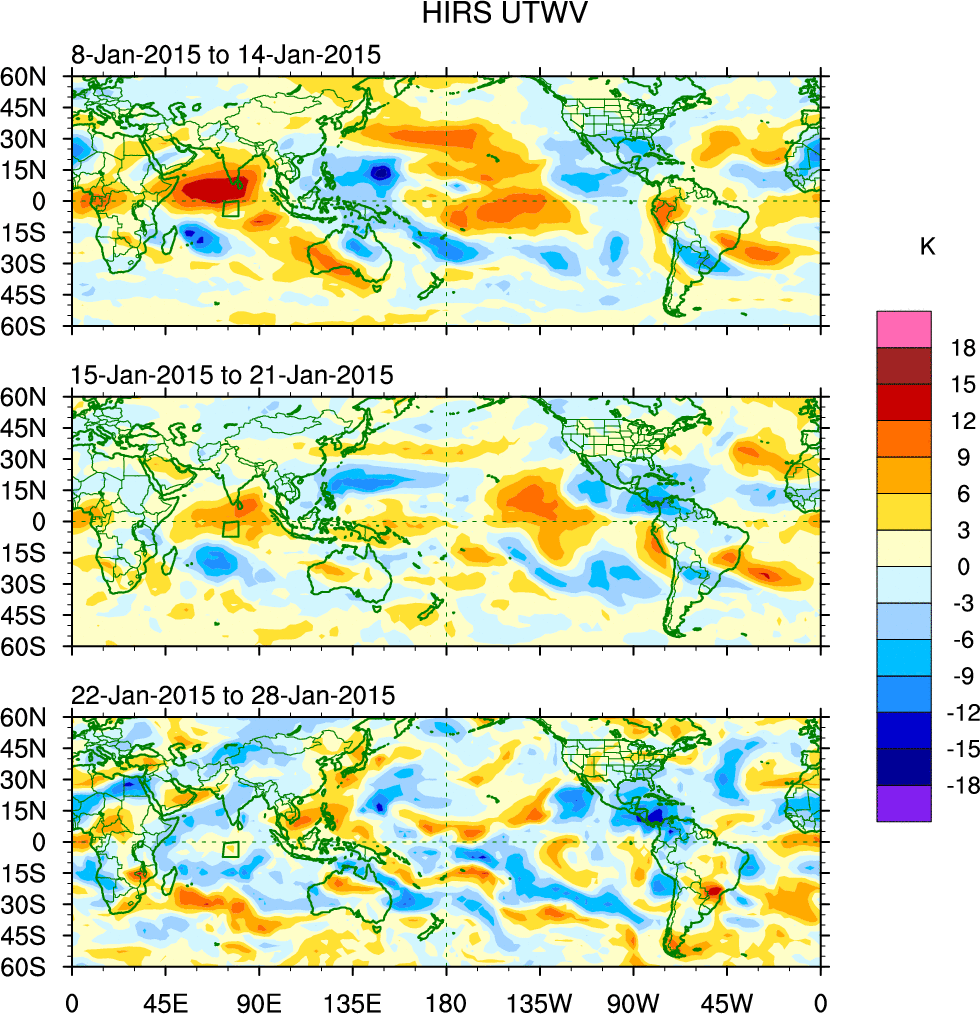 To identify tropical waves in near real-time, the OLR and UTWV data are filtered following Wheeler & Weickmann (2001 MWR). The daily anomalies are calculated using the first 3 harmonics of the seasonal cycle for 1979–2009. Missing values are then filled using linear interpolation in space and time. The most recent 365 days of anomalies are padded with 659 days of zeroes, and the result is filtered for each wave type.