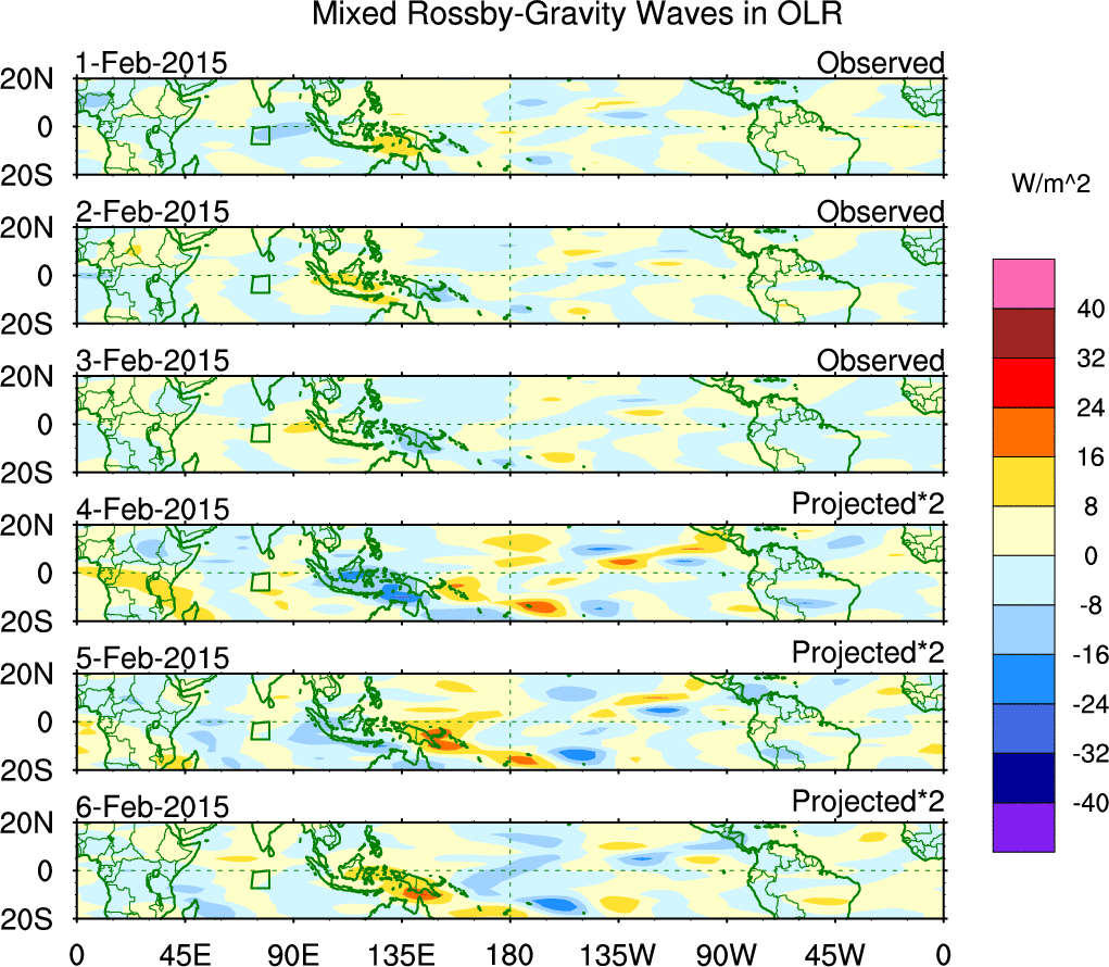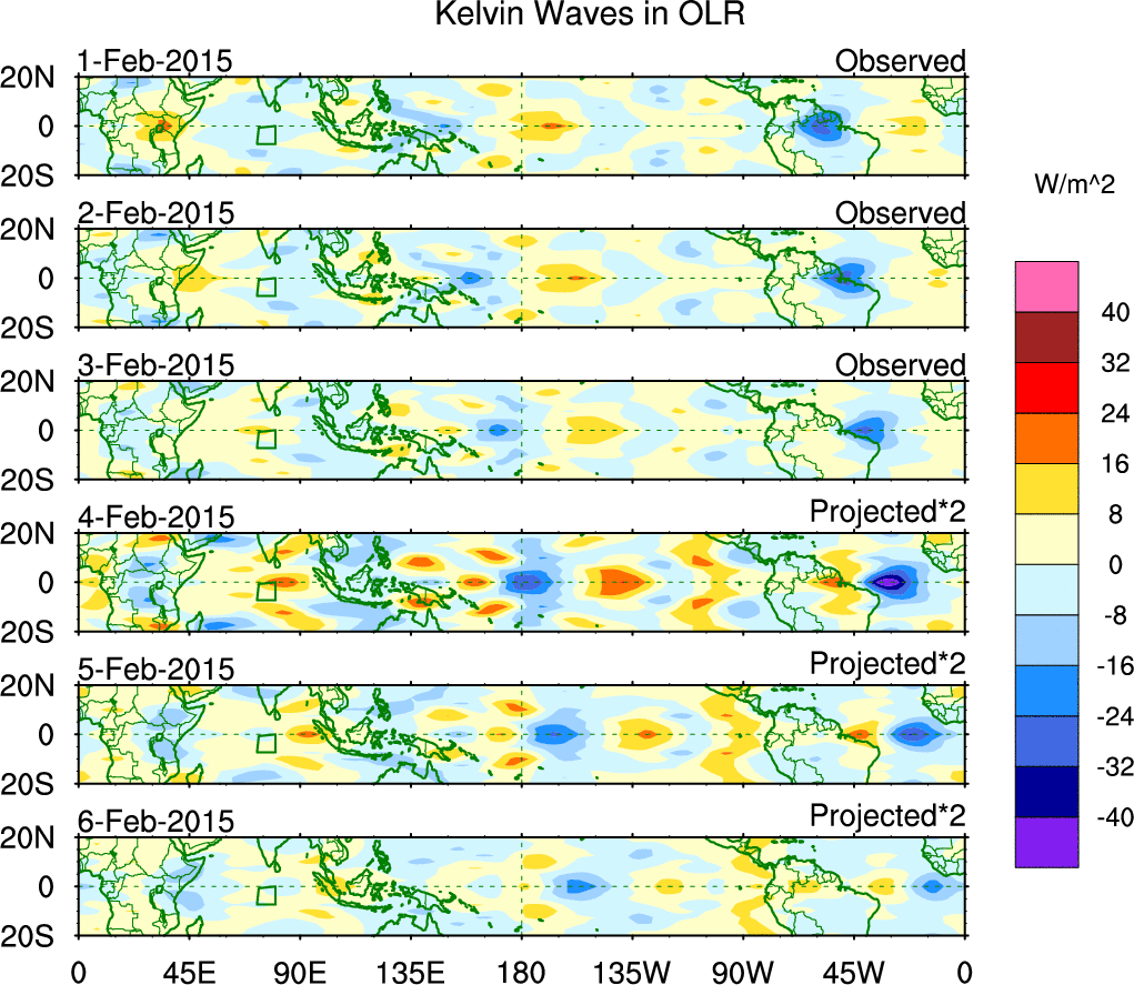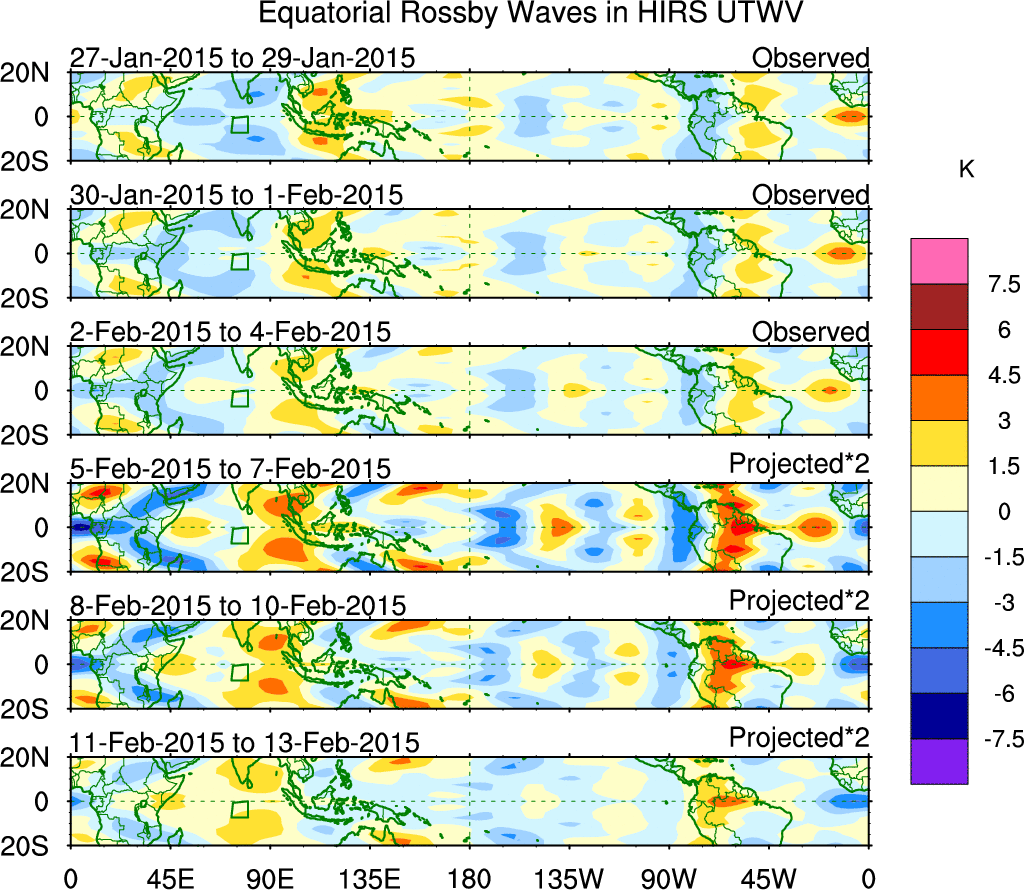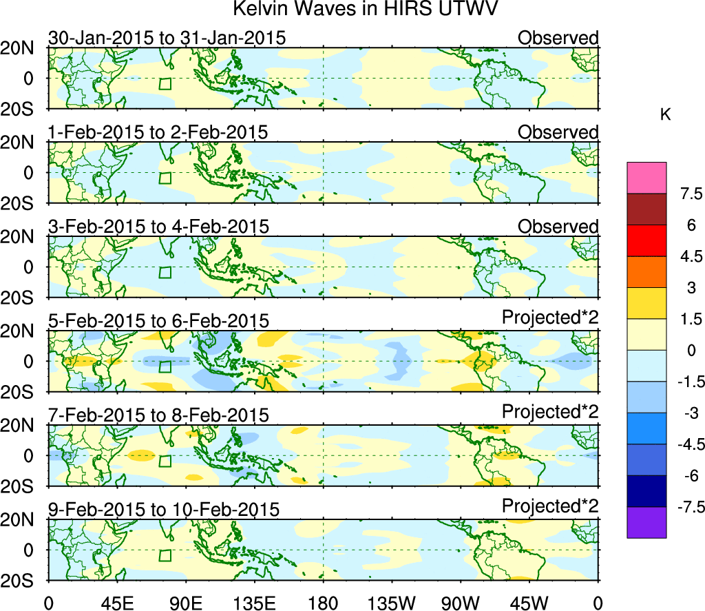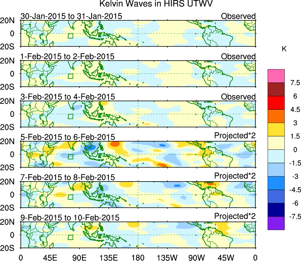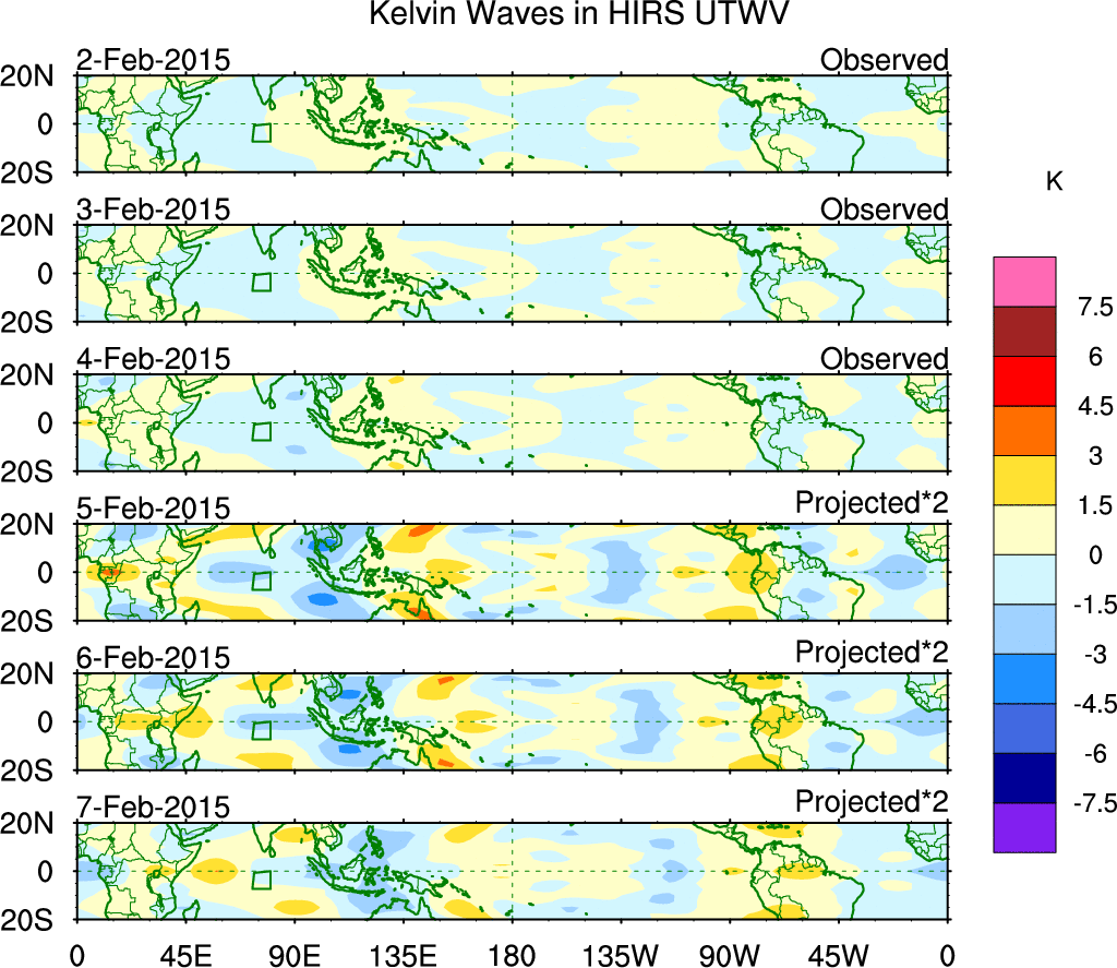 To identify tropical waves in near real-time, the OLR and UTWV data are filtered following Wheeler & Weickmann (2001 MWR). The daily anomalies are calculated using the first 3 harmonics of the seasonal cycle for 1979–2009. Missing values are then filled using linear interpolation in space and time. The most recent 365 days of anomalies are padded with 659 days of zeroes, and the result is filtered for each wave type.