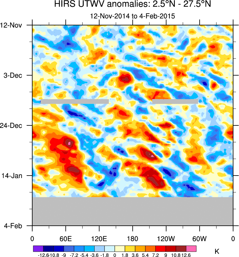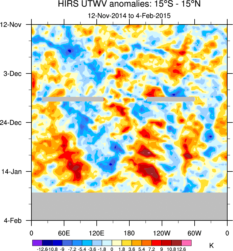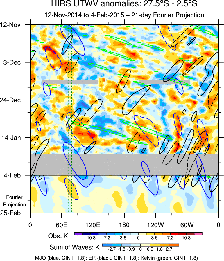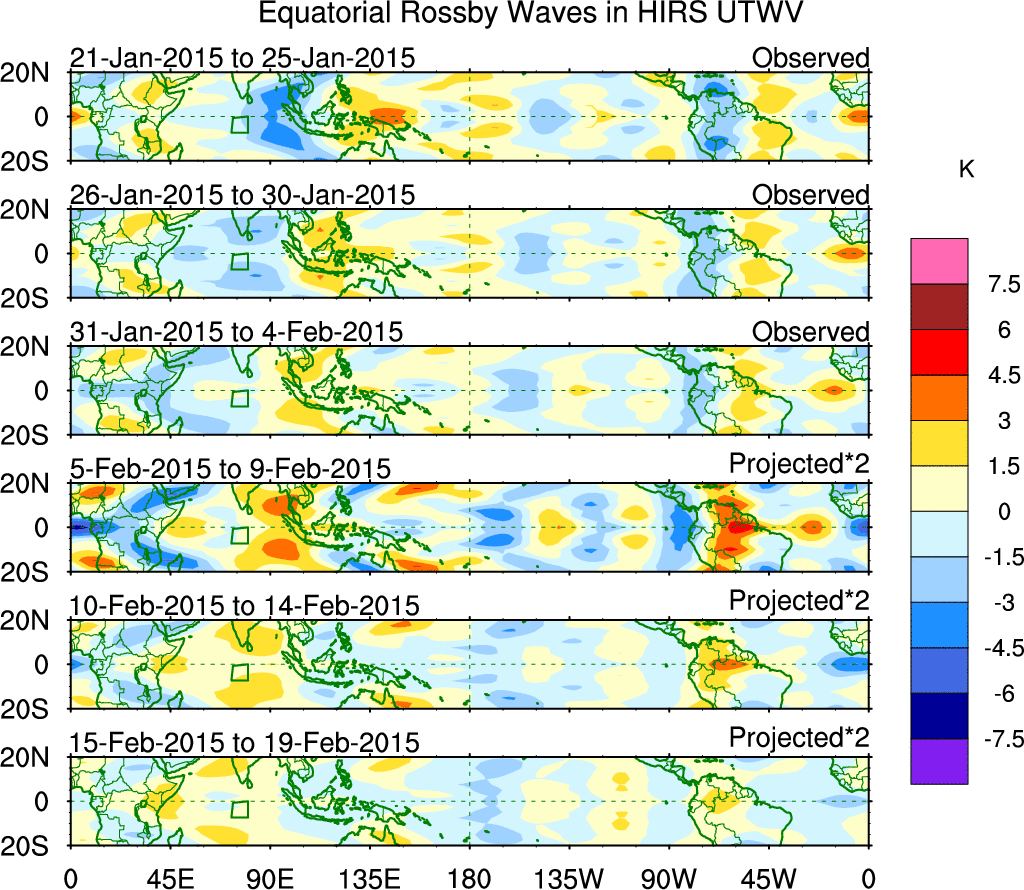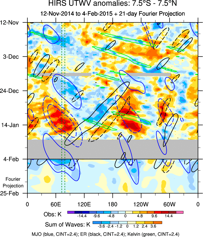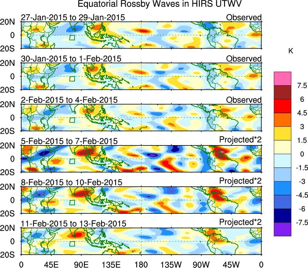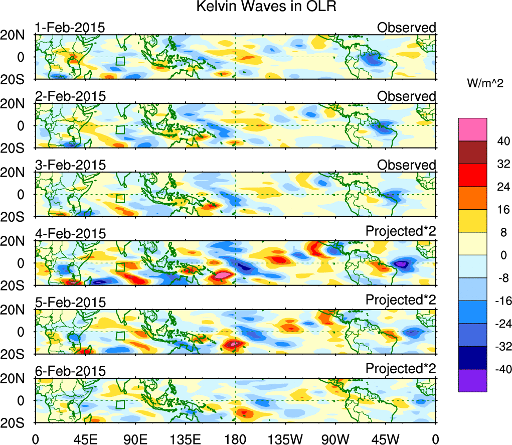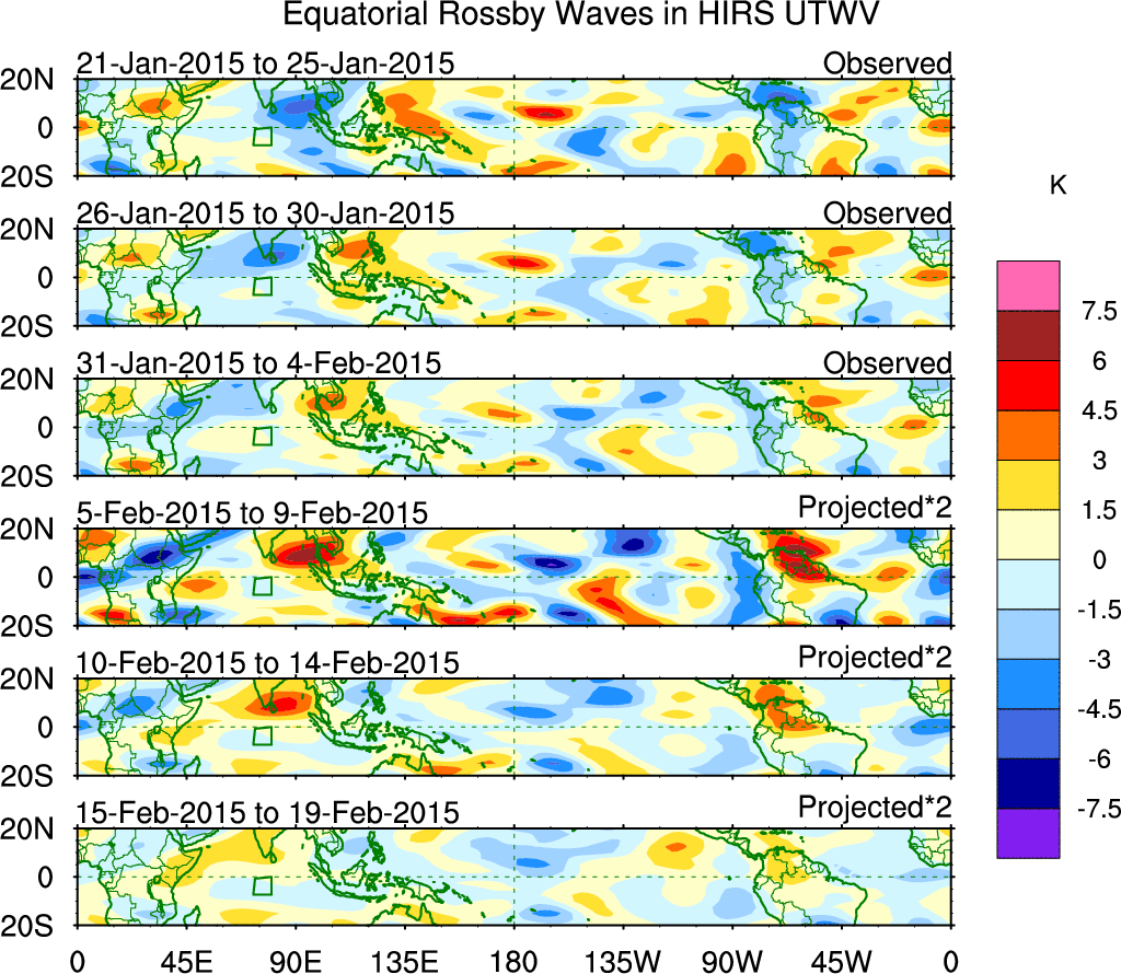 To identify tropical waves in near real-time, the OLR and UTWV data are filtered following Wheeler & Weickmann (2001 MWR). The daily anomalies are calculated using the first 3 harmonics of the seasonal cycle for 1979–2009. Missing values are then filled using linear interpolation in space and time. The most recent 365 days of anomalies are padded with 659 days of zeroes, and the result is filtered for each wave type.