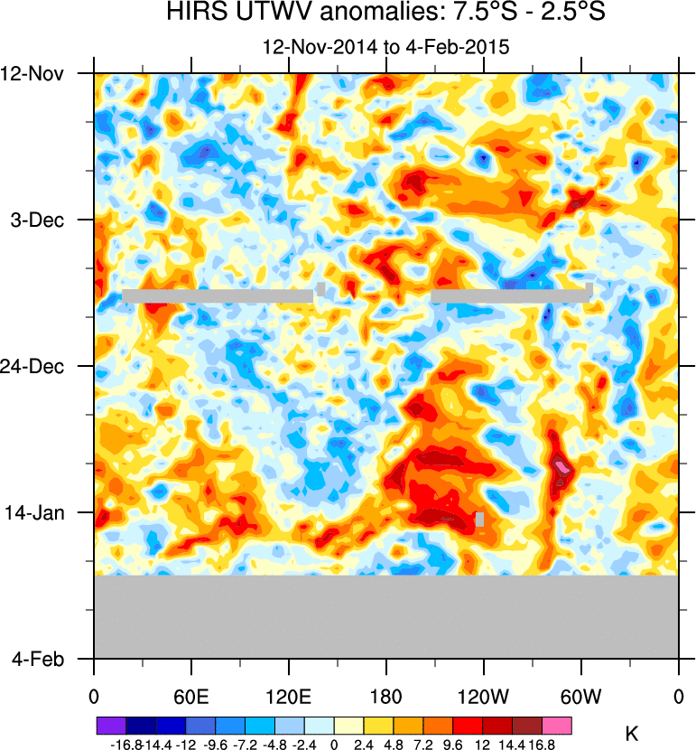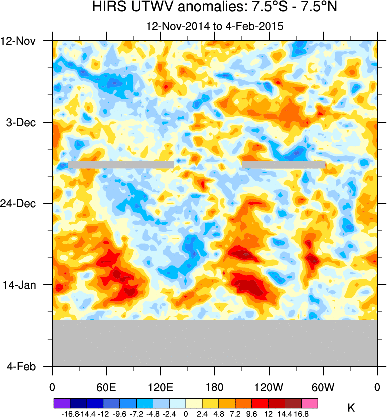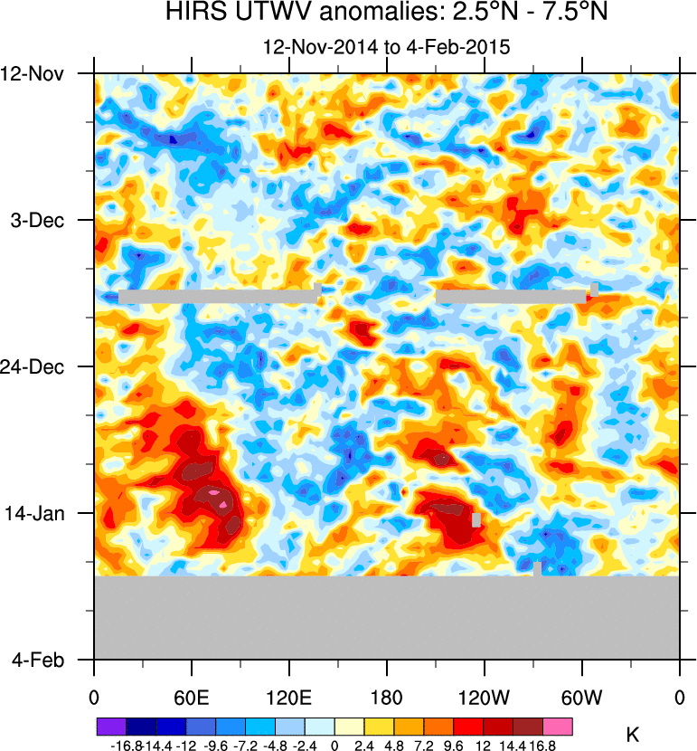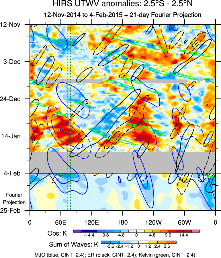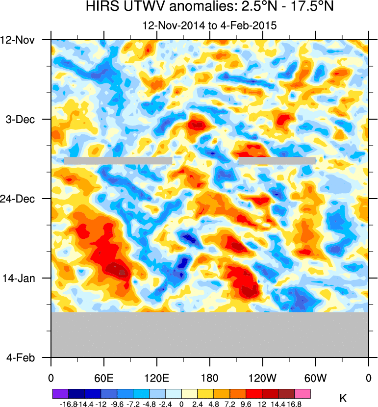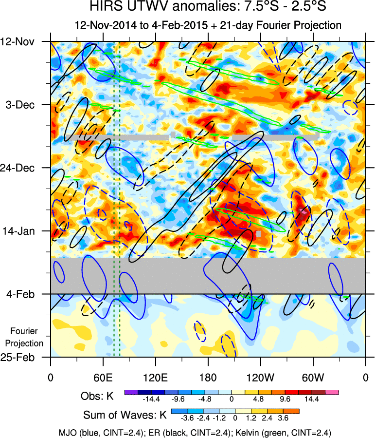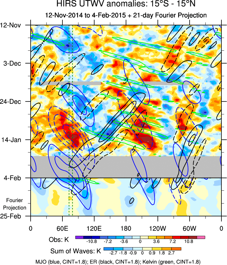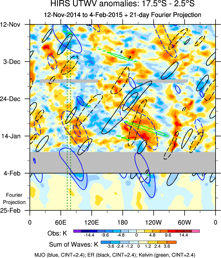 To identify tropical waves in near real-time, the OLR and UTWV data are filtered following Wheeler & Weickmann (2001 MWR). The daily anomalies are calculated using the first 3 harmonics of the seasonal cycle for 1979–2009. Missing values are then filled using linear interpolation in space and time. The most recent 365 days of anomalies are padded with 659 days of zeroes, and the result is filtered for each wave type.