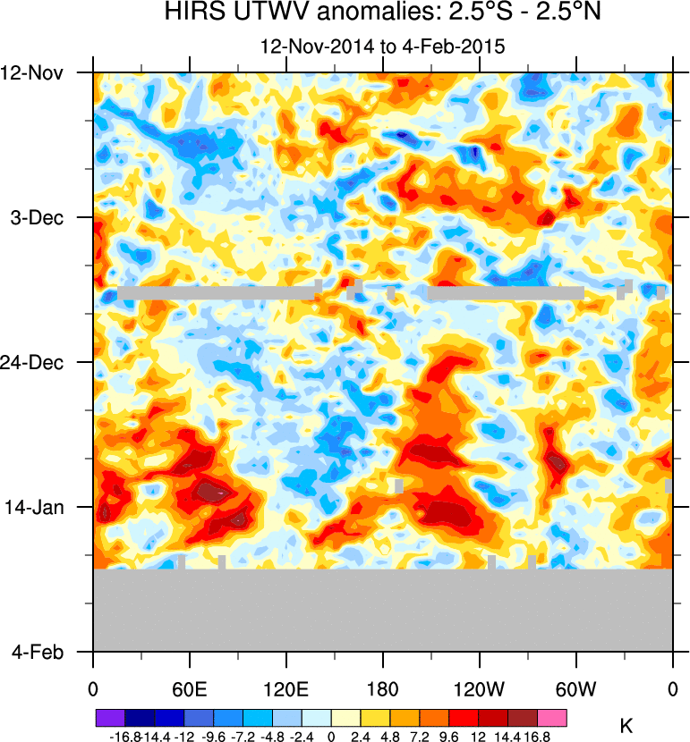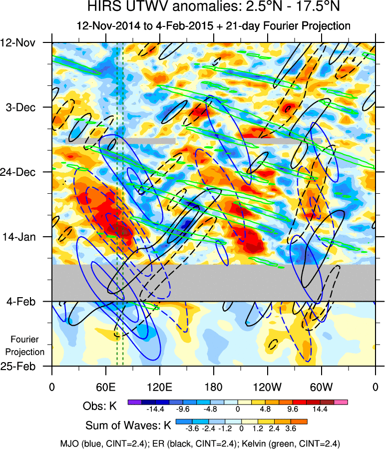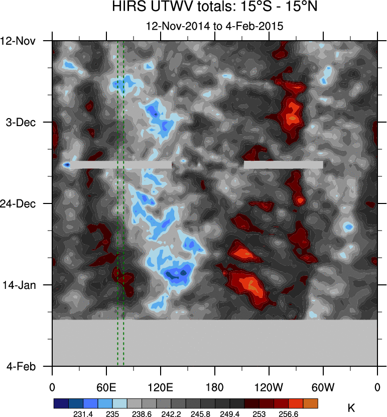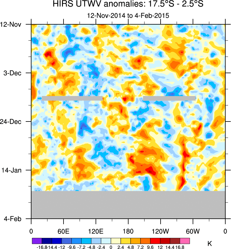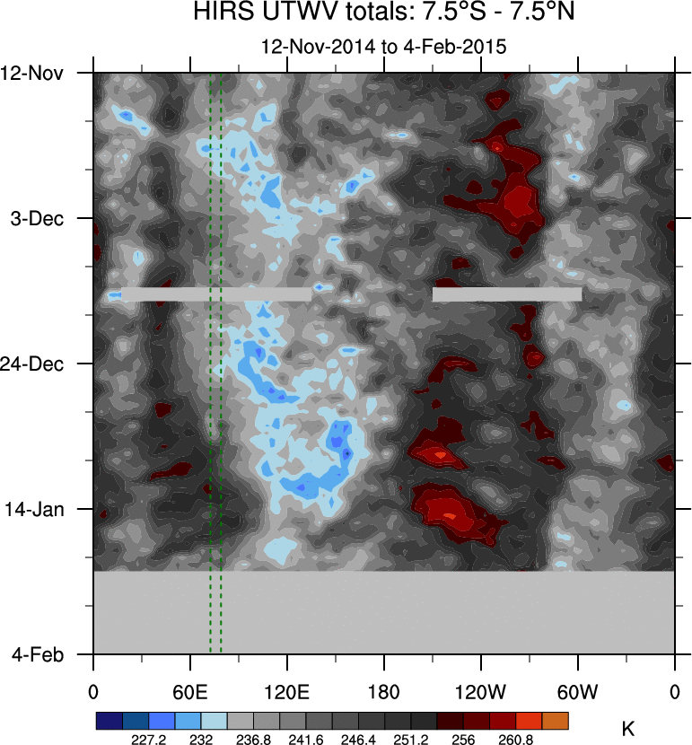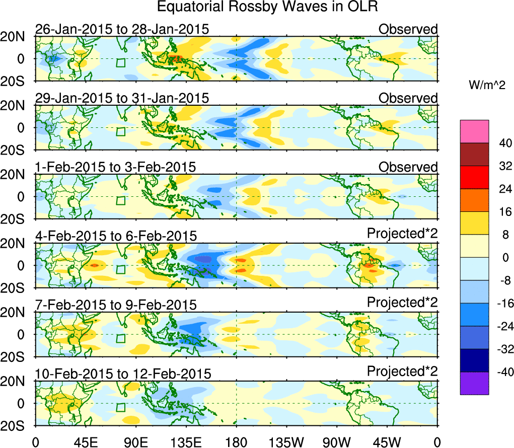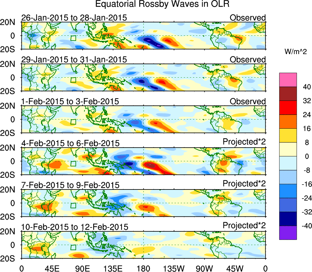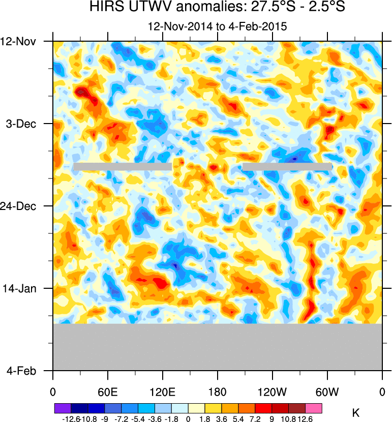 To identify tropical waves in near real-time, the OLR and UTWV data are filtered following Wheeler & Weickmann (2001 MWR). The daily anomalies are calculated using the first 3 harmonics of the seasonal cycle for 1979–2009. Missing values are then filled using linear interpolation in space and time. The most recent 365 days of anomalies are padded with 659 days of zeroes, and the result is filtered for each wave type.