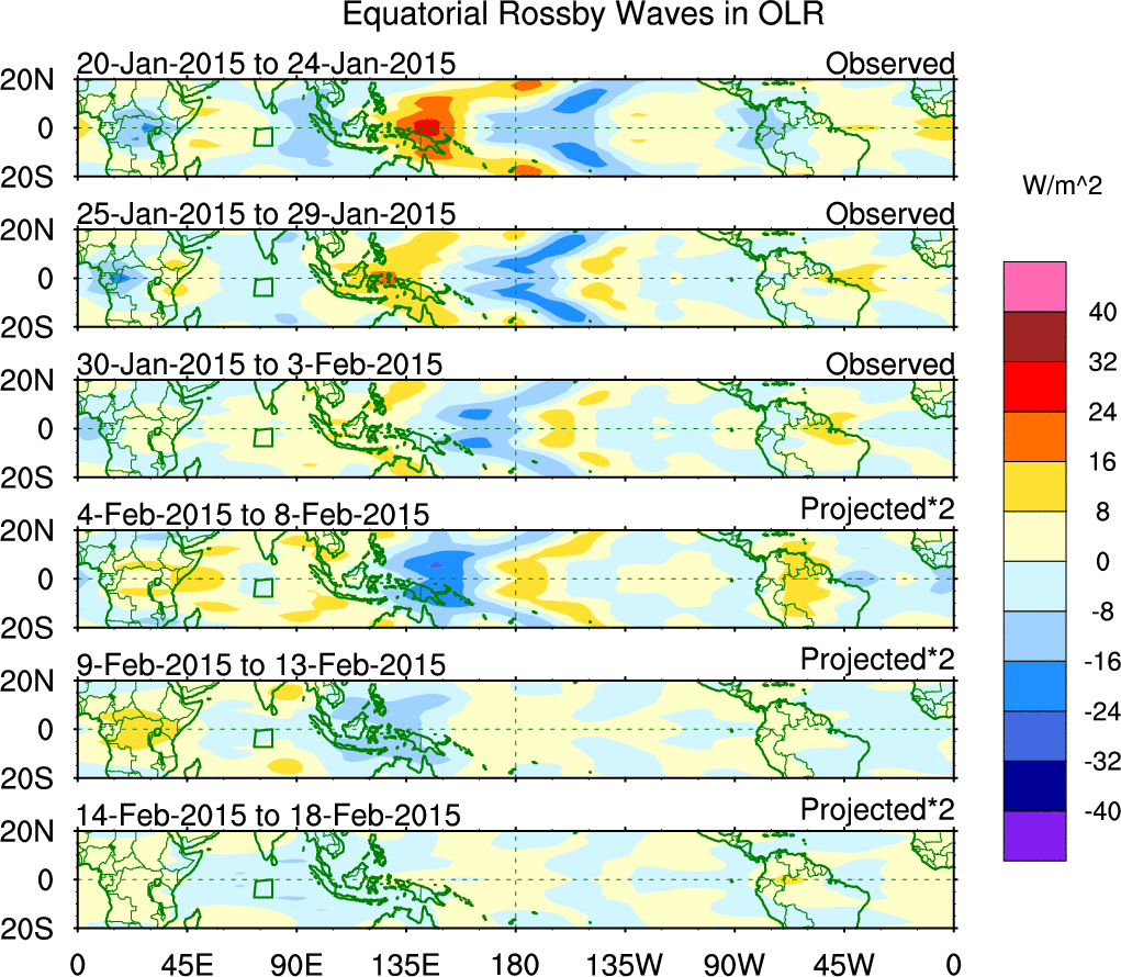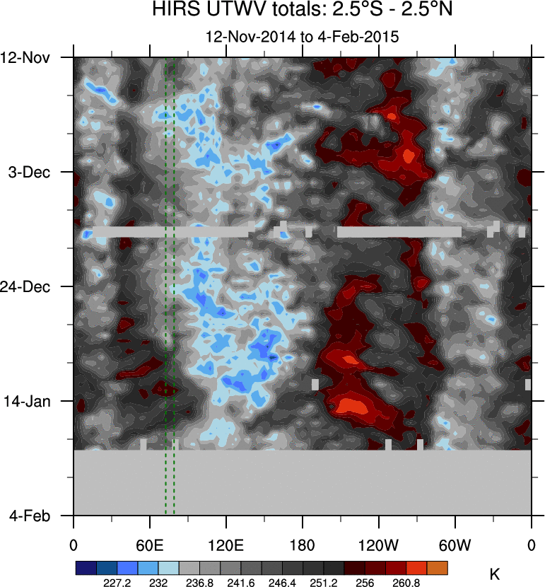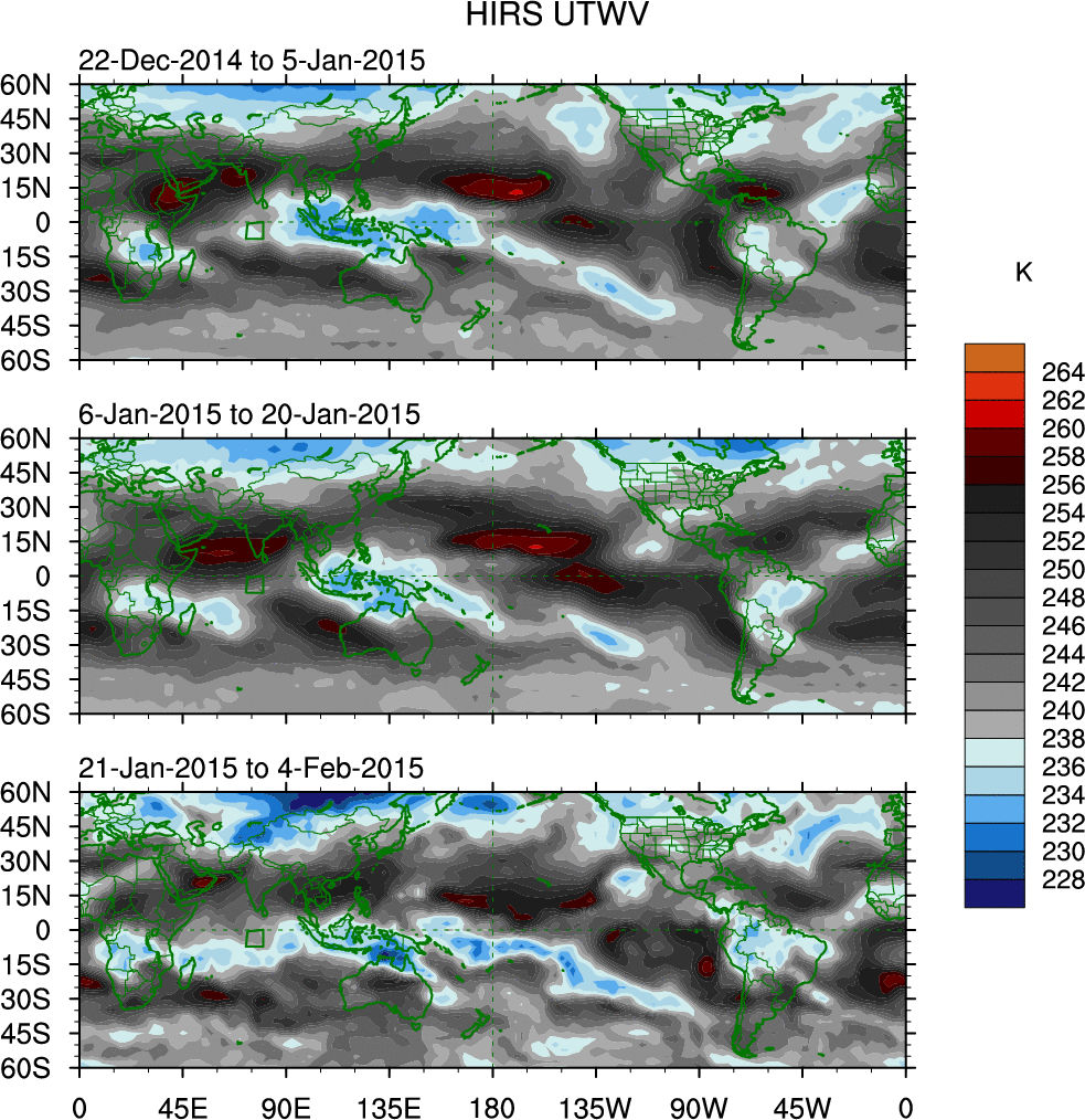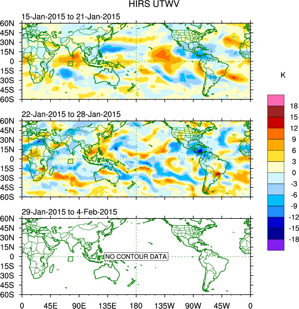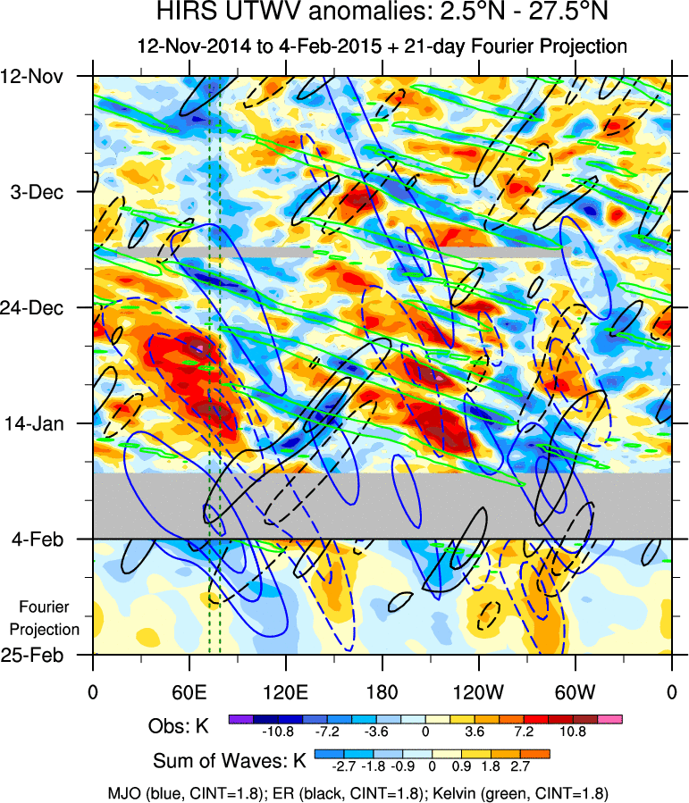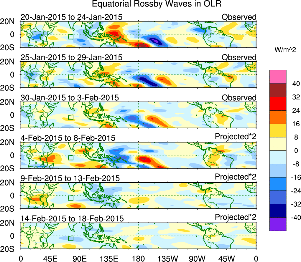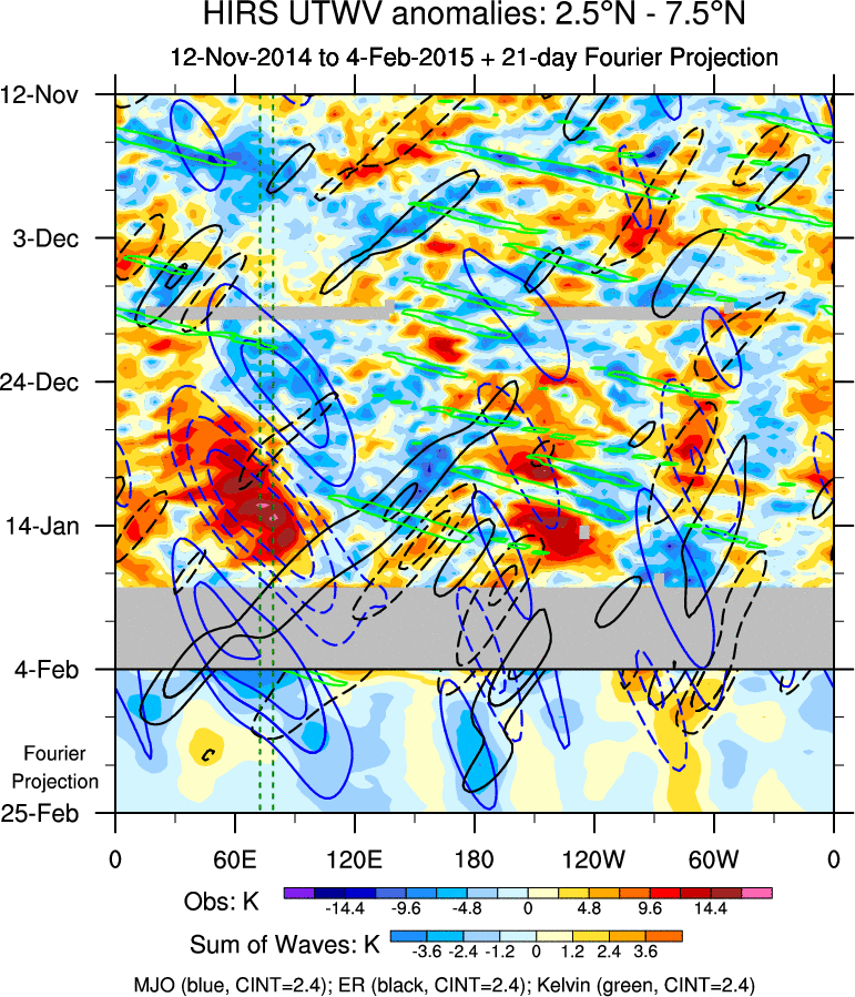 To identify tropical waves in near real-time, the OLR and UTWV data are filtered following Wheeler & Weickmann (2001 MWR). The daily anomalies are calculated using the first 3 harmonics of the seasonal cycle for 1979–2009. Missing values are then filled using linear interpolation in space and time. The most recent 365 days of anomalies are padded with 659 days of zeroes, and the result is filtered for each wave type.