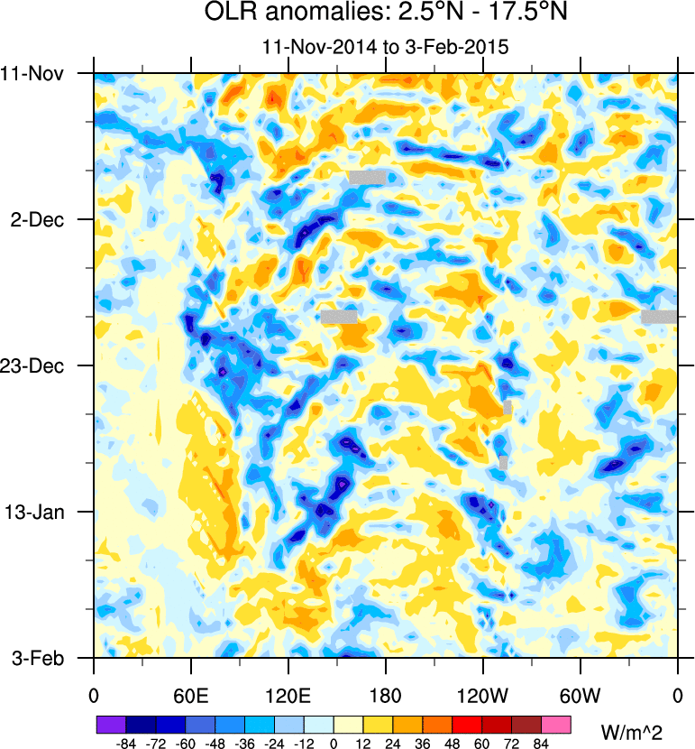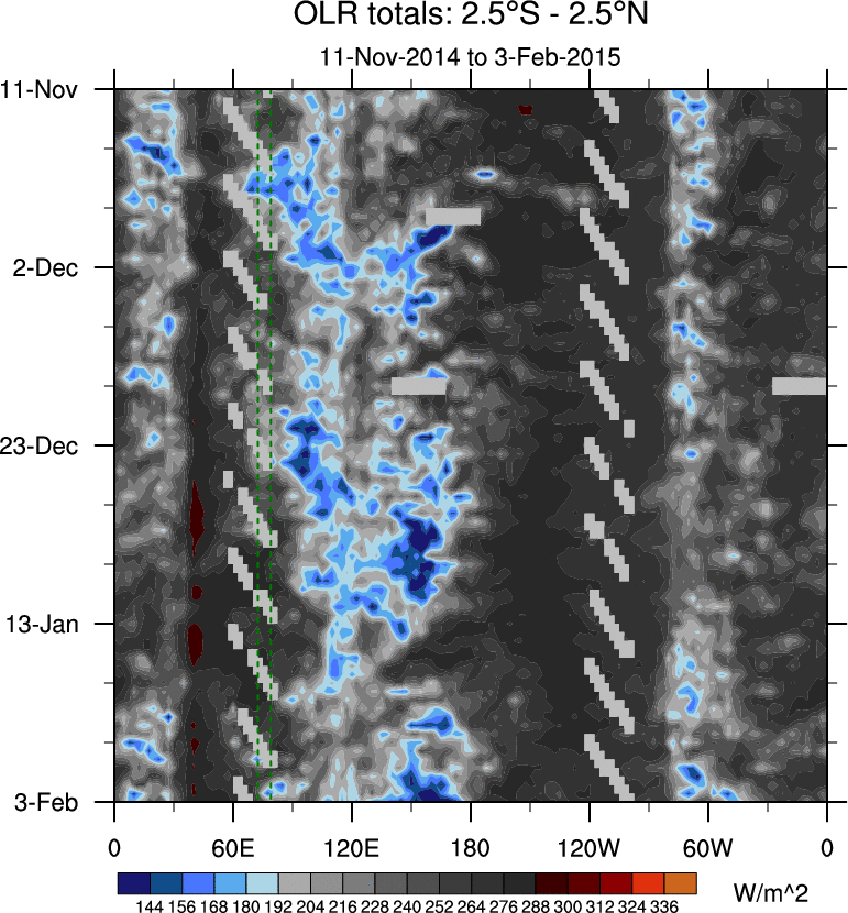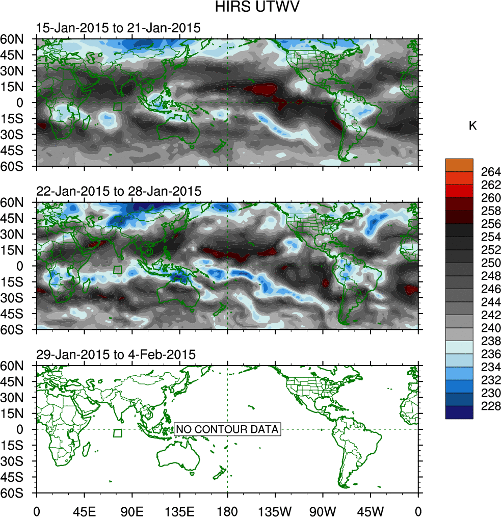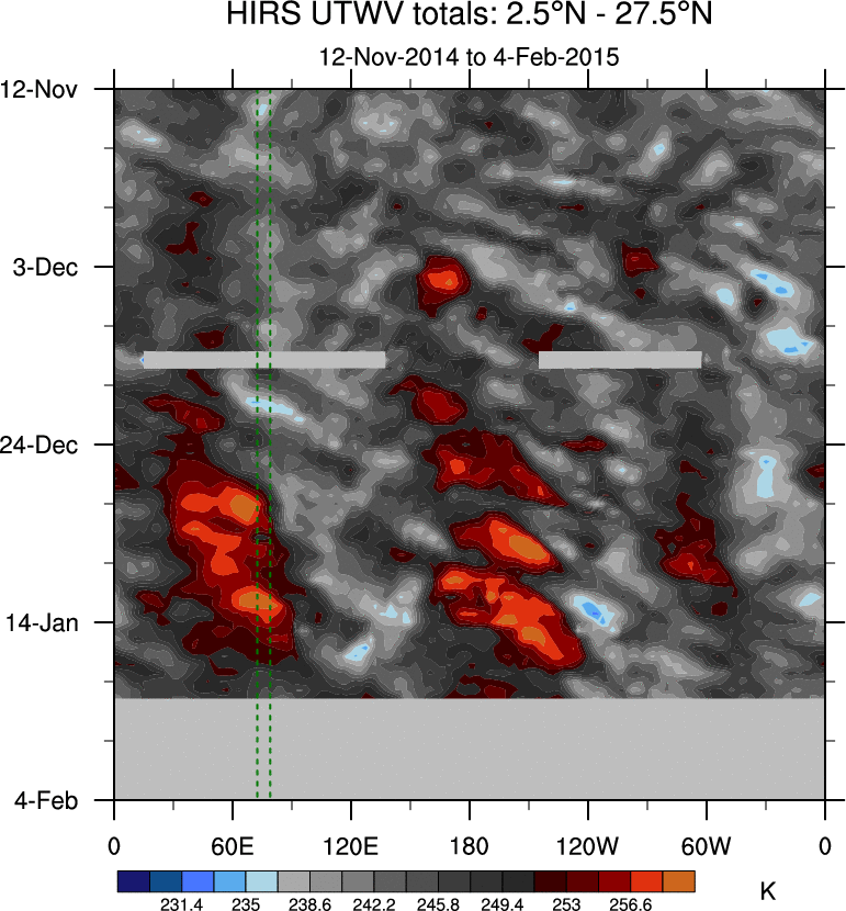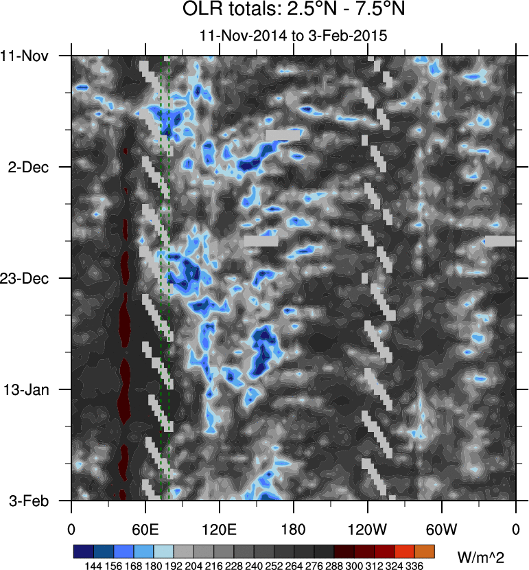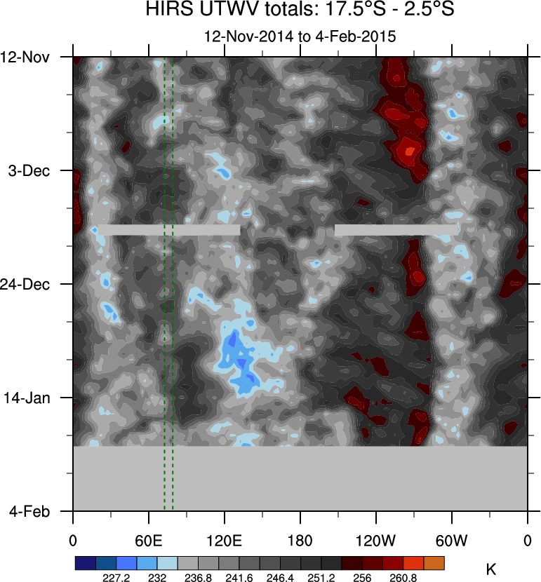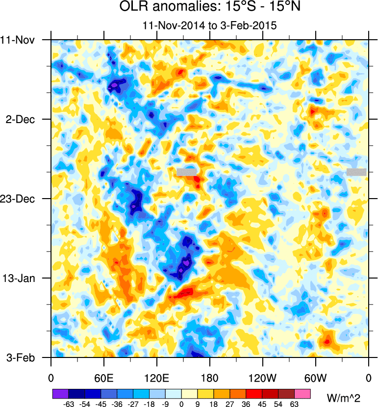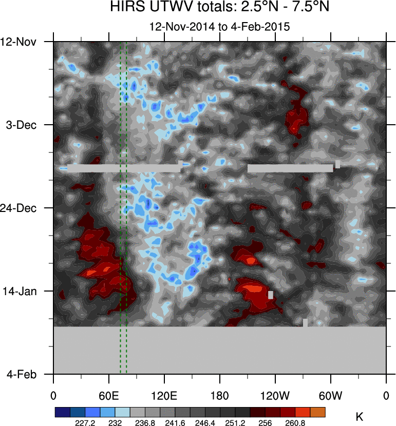 To identify tropical waves in near real-time, the OLR and UTWV data are filtered following Wheeler & Weickmann (2001 MWR). The daily anomalies are calculated using the first 3 harmonics of the seasonal cycle for 1979–2009. Missing values are then filled using linear interpolation in space and time. The most recent 365 days of anomalies are padded with 659 days of zeroes, and the result is filtered for each wave type.