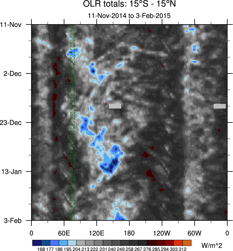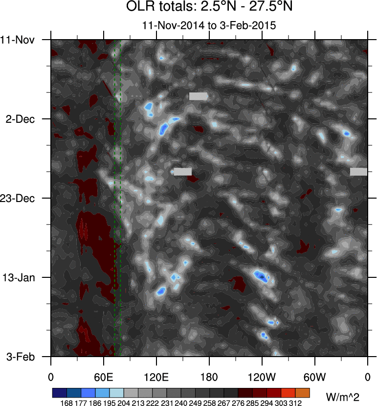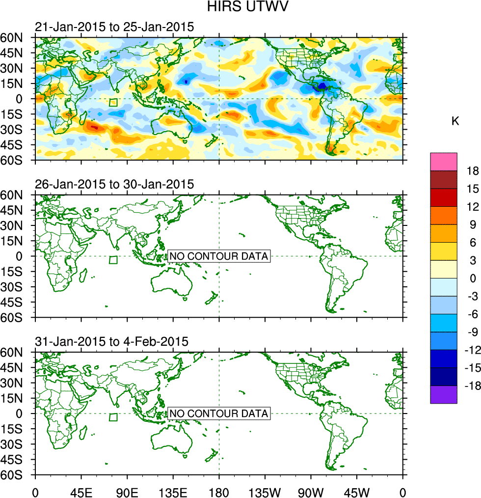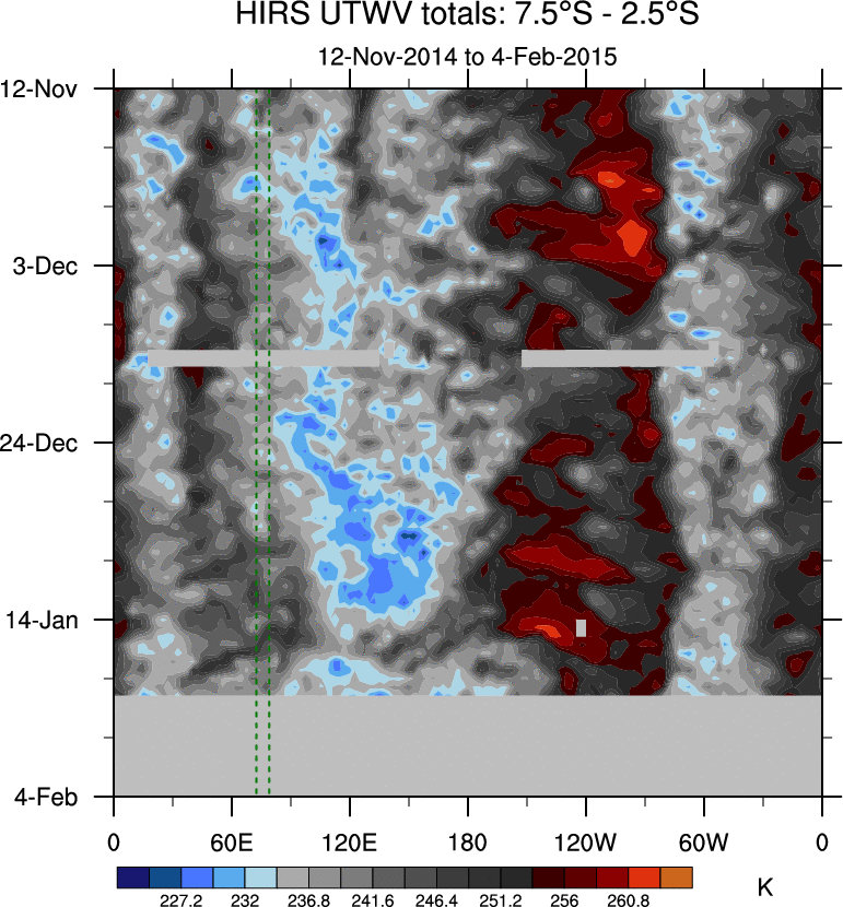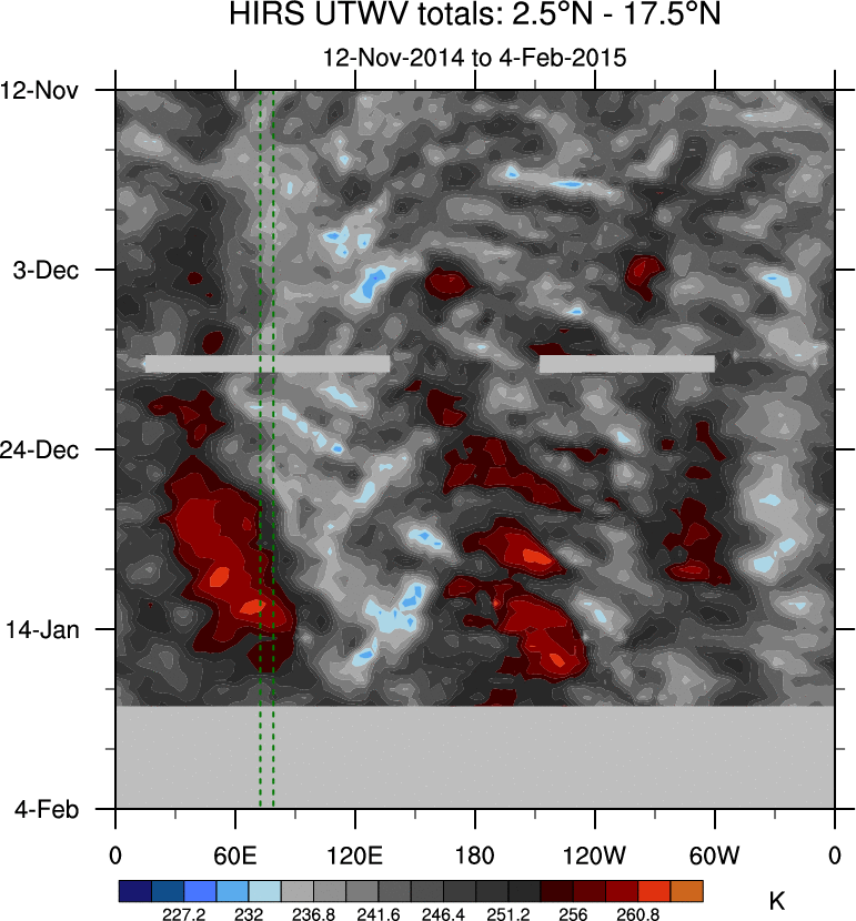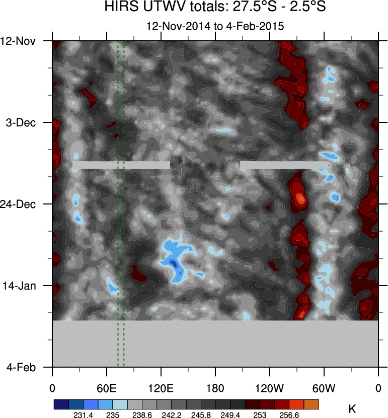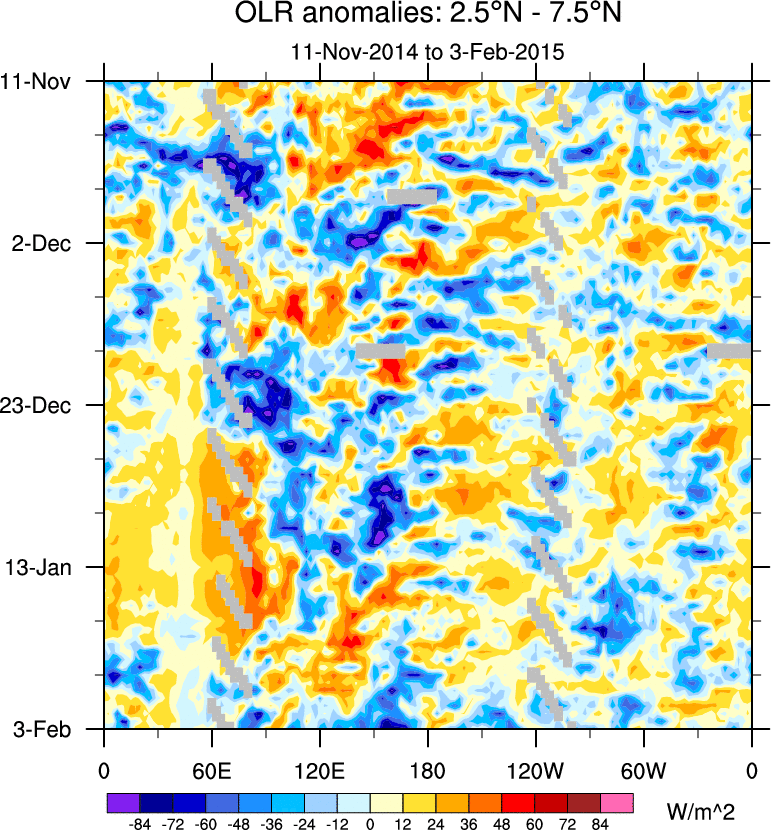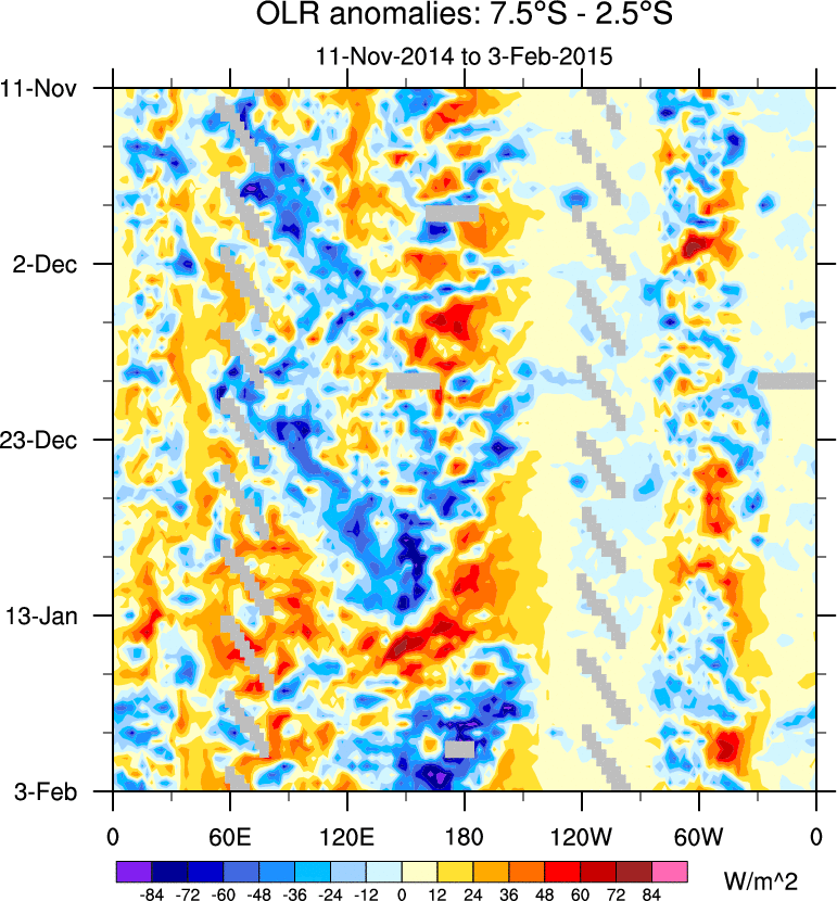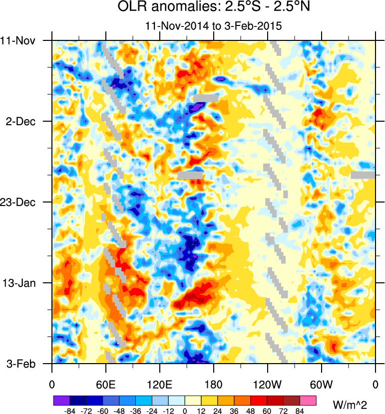 To identify tropical waves in near real-time, the OLR and UTWV data are filtered following Wheeler & Weickmann (2001 MWR). The daily anomalies are calculated using the first 3 harmonics of the seasonal cycle for 1979–2009. Missing values are then filled using linear interpolation in space and time. The most recent 365 days of anomalies are padded with 659 days of zeroes, and the result is filtered for each wave type.