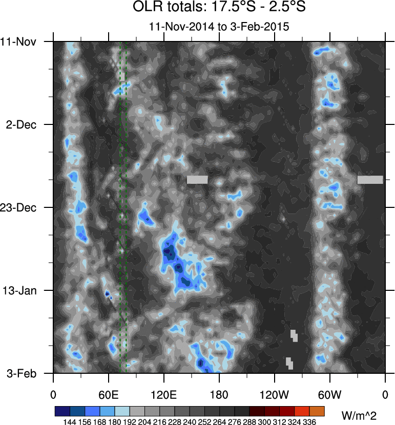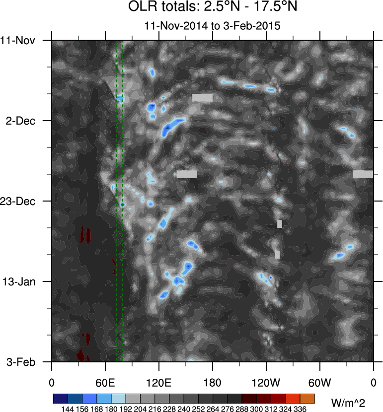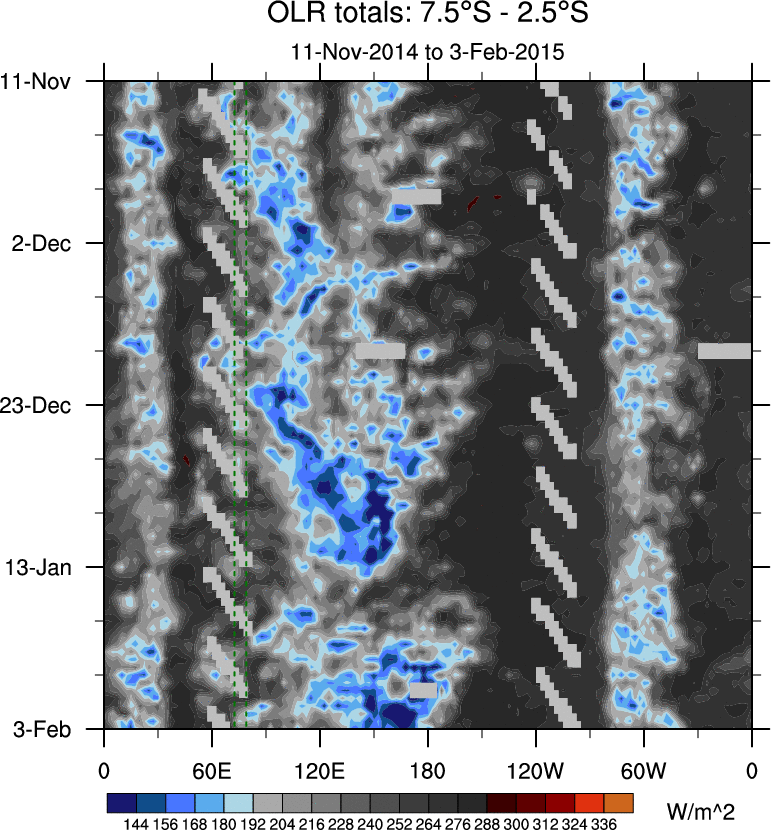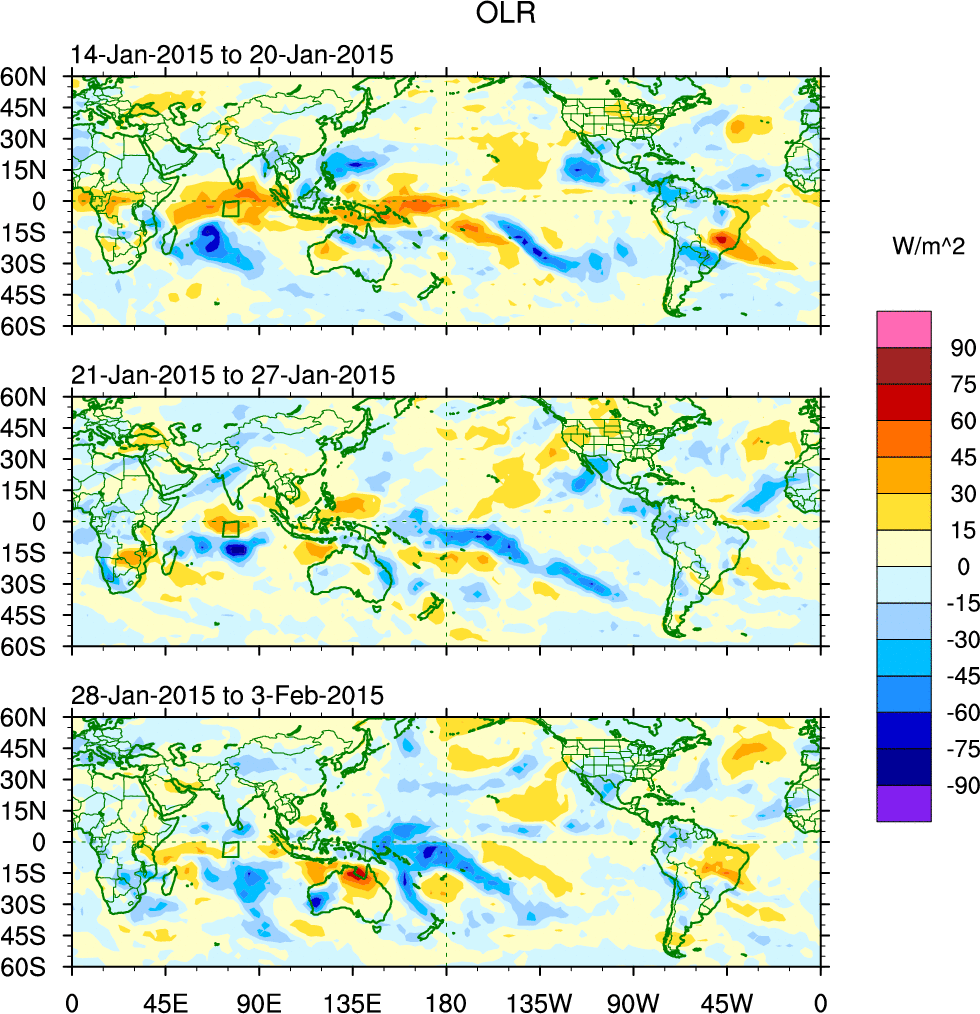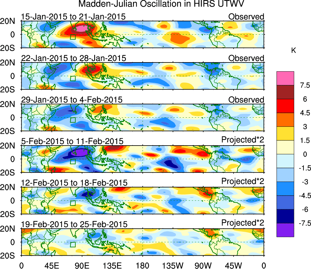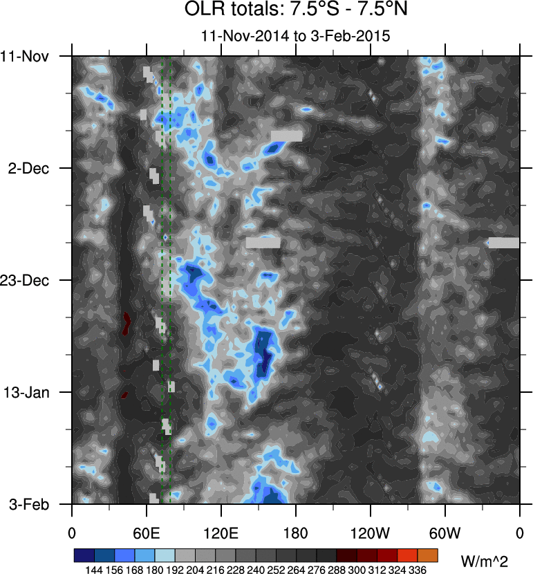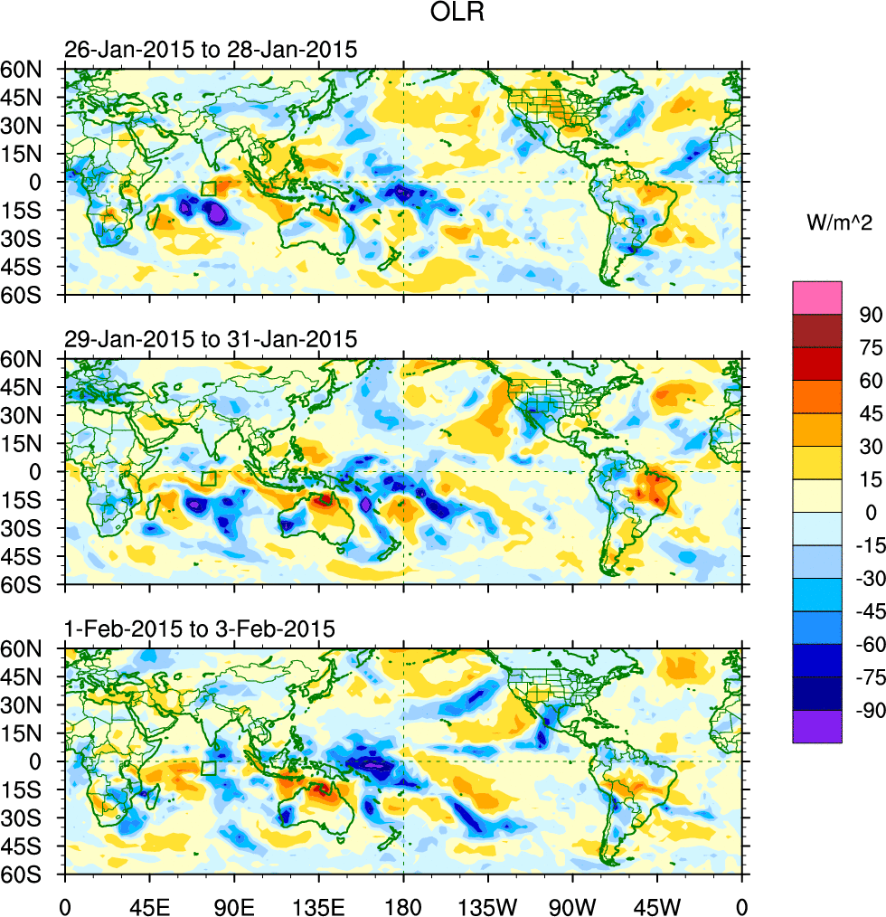 To identify tropical waves in near real-time, the OLR and UTWV data are filtered following Wheeler & Weickmann (2001 MWR). The daily anomalies are calculated using the first 3 harmonics of the seasonal cycle for 1979–2009. Missing values are then filled using linear interpolation in space and time. The most recent 365 days of anomalies are padded with 659 days of zeroes, and the result is filtered for each wave type.