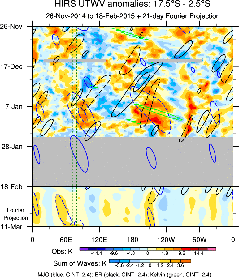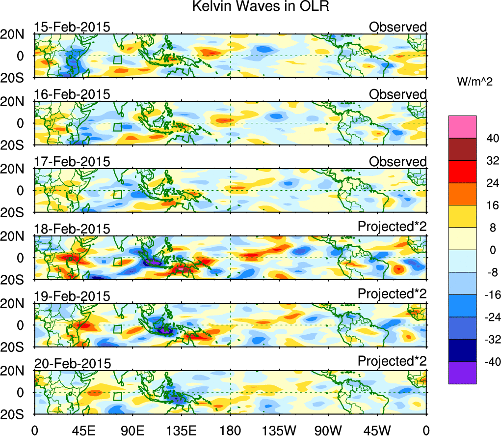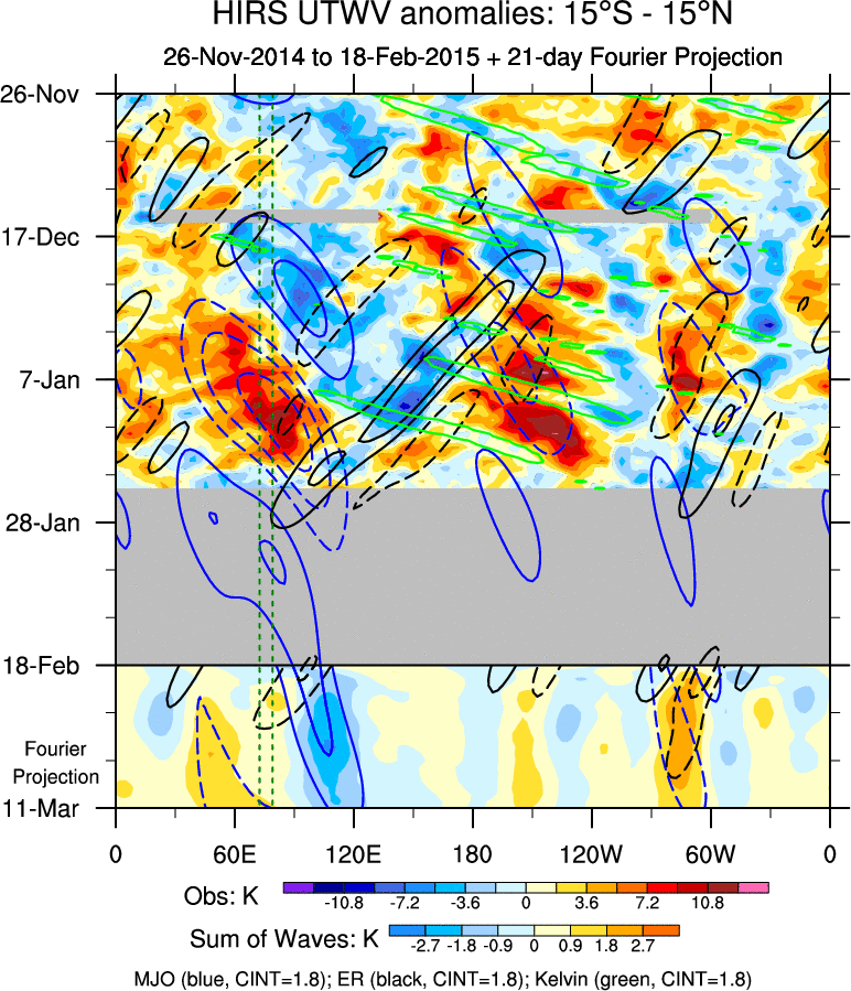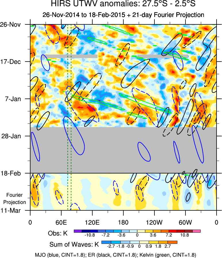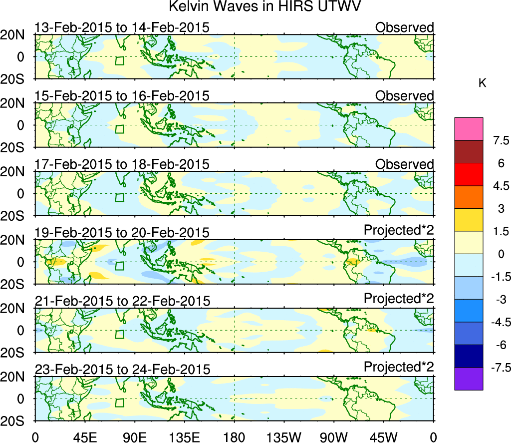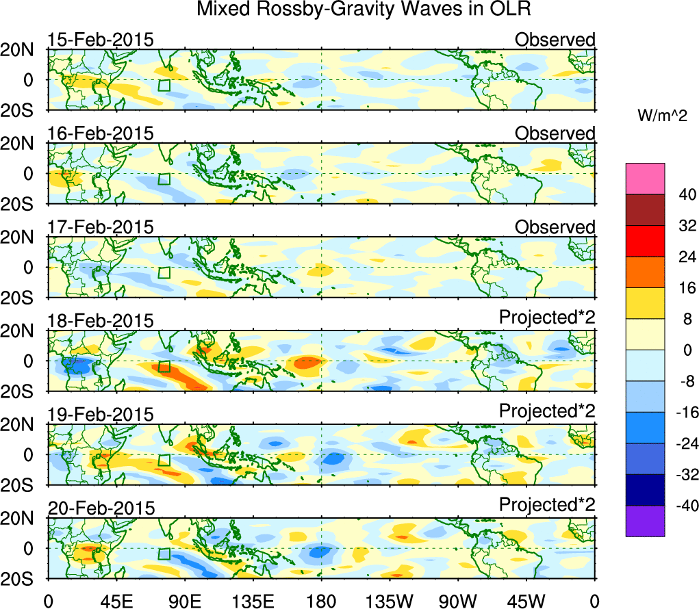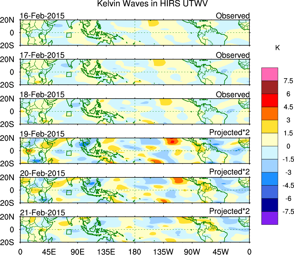 To identify tropical waves in near real-time, the OLR and UTWV data are filtered following Wheeler & Weickmann (2001 MWR). The daily anomalies are calculated using the first 3 harmonics of the seasonal cycle for 1979–2009. Missing values are then filled using linear interpolation in space and time. The most recent 365 days of anomalies are padded with 659 days of zeroes, and the result is filtered for each wave type.