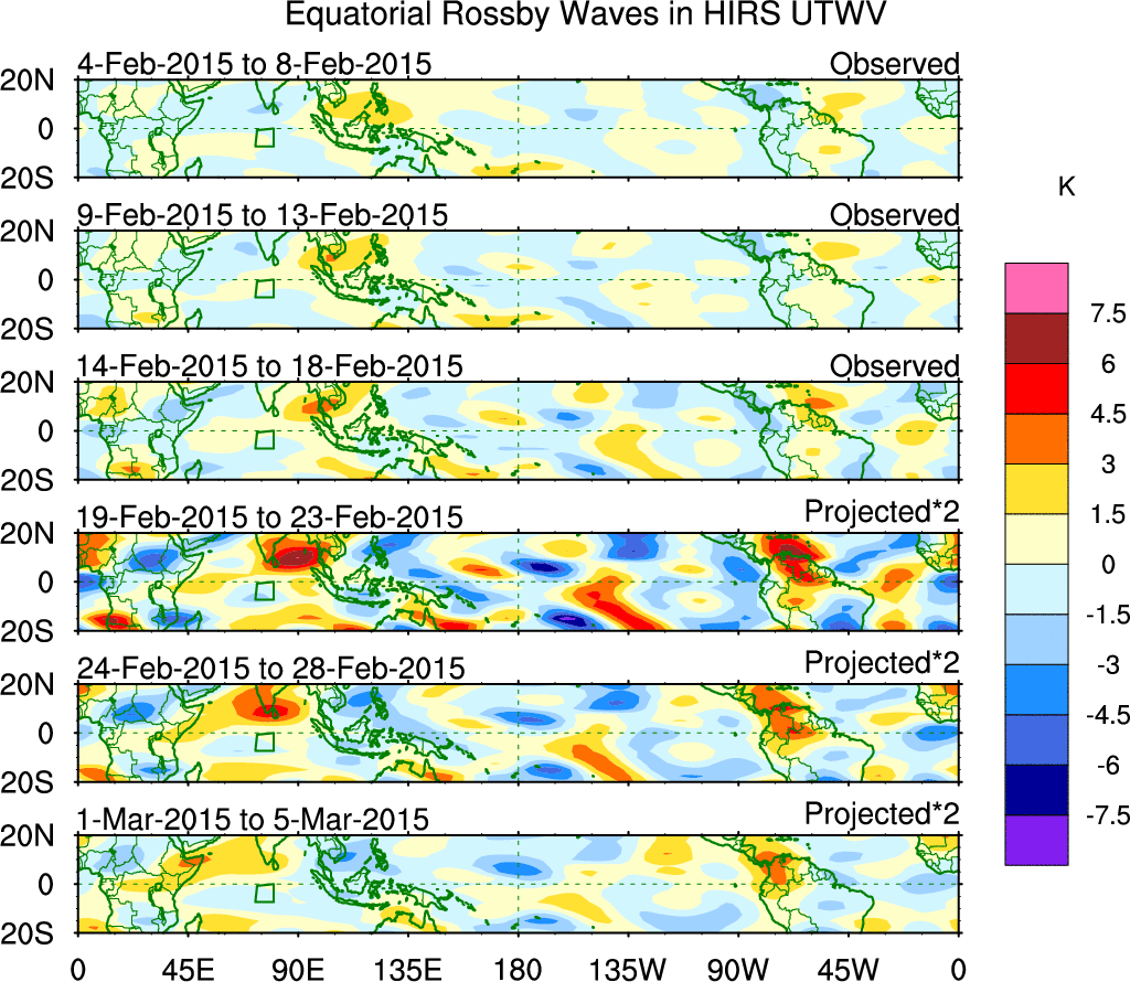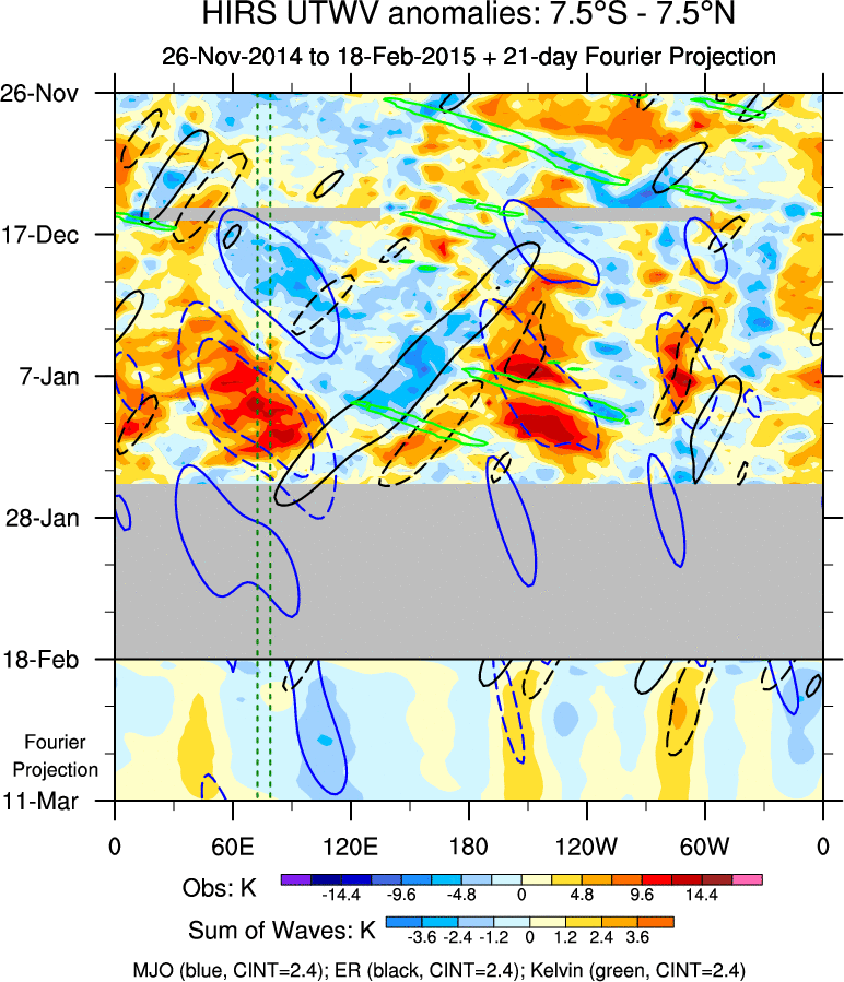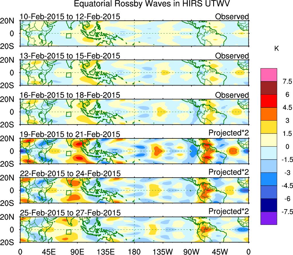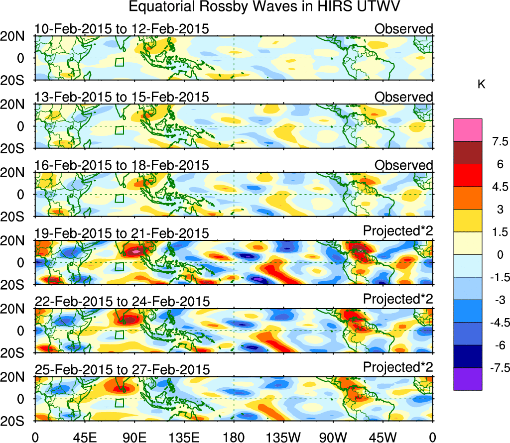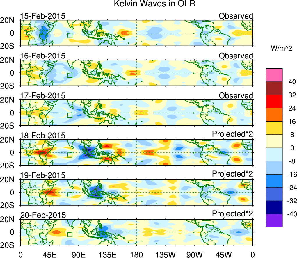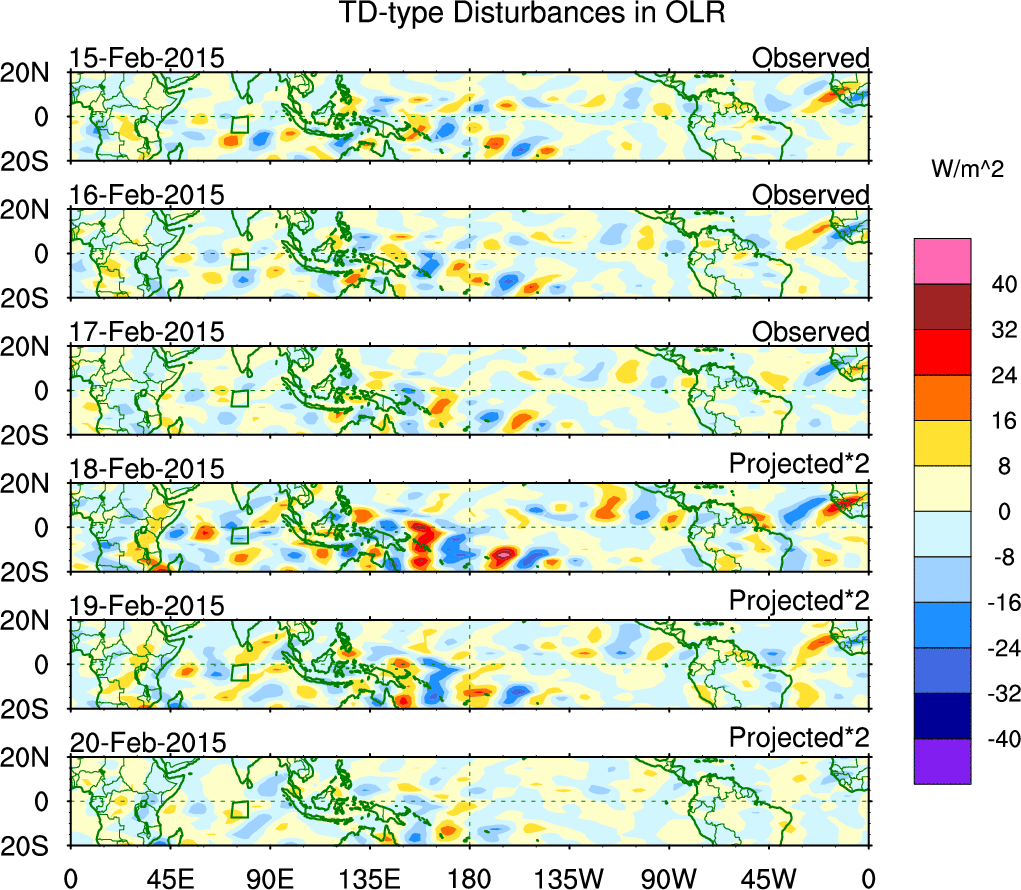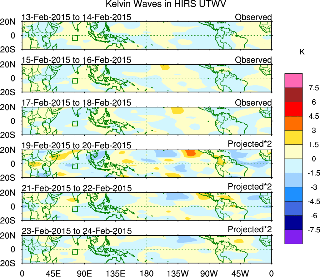 To identify tropical waves in near real-time, the OLR and UTWV data are filtered following Wheeler & Weickmann (2001 MWR). The daily anomalies are calculated using the first 3 harmonics of the seasonal cycle for 1979–2009. Missing values are then filled using linear interpolation in space and time. The most recent 365 days of anomalies are padded with 659 days of zeroes, and the result is filtered for each wave type.