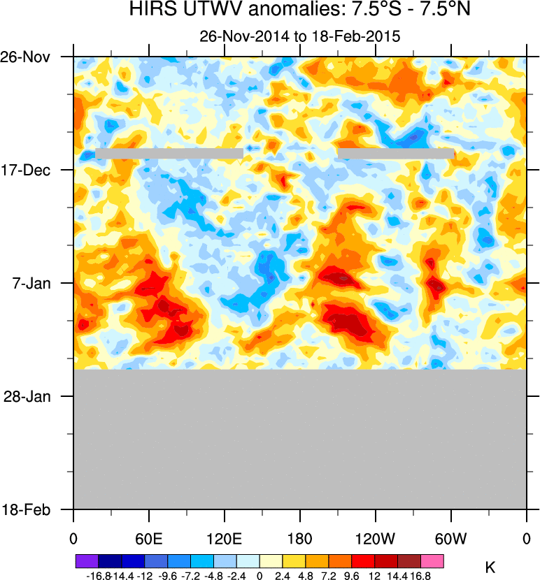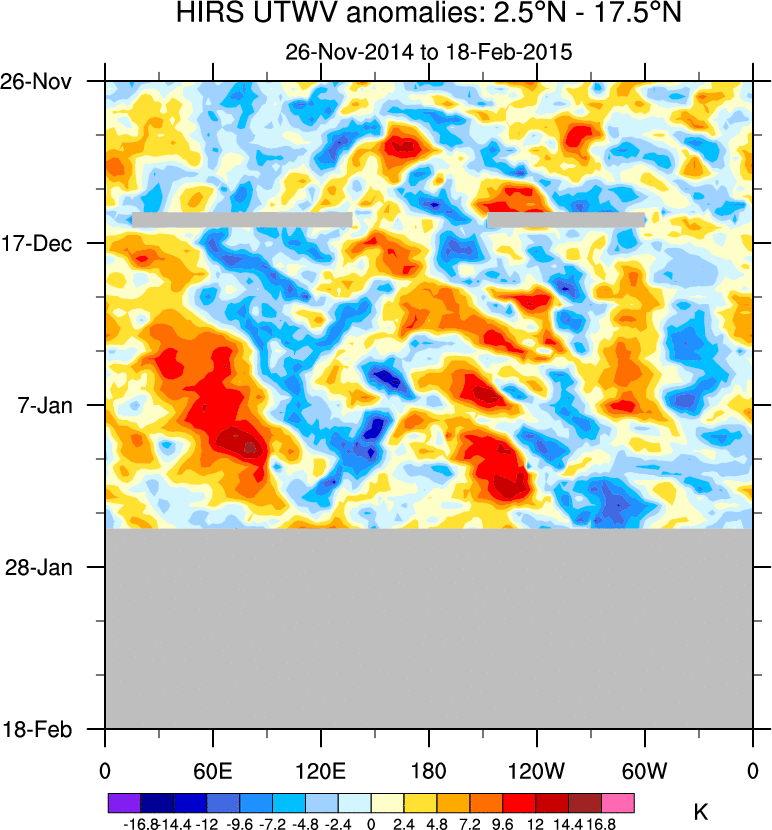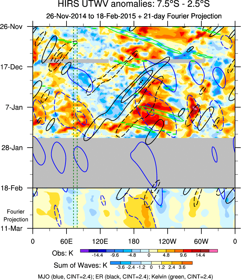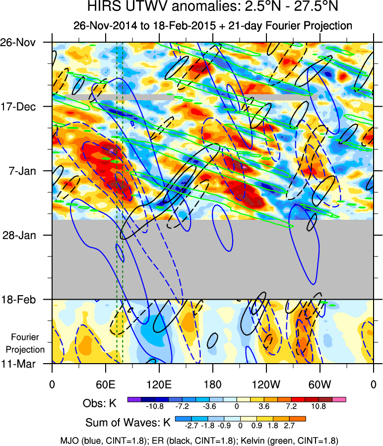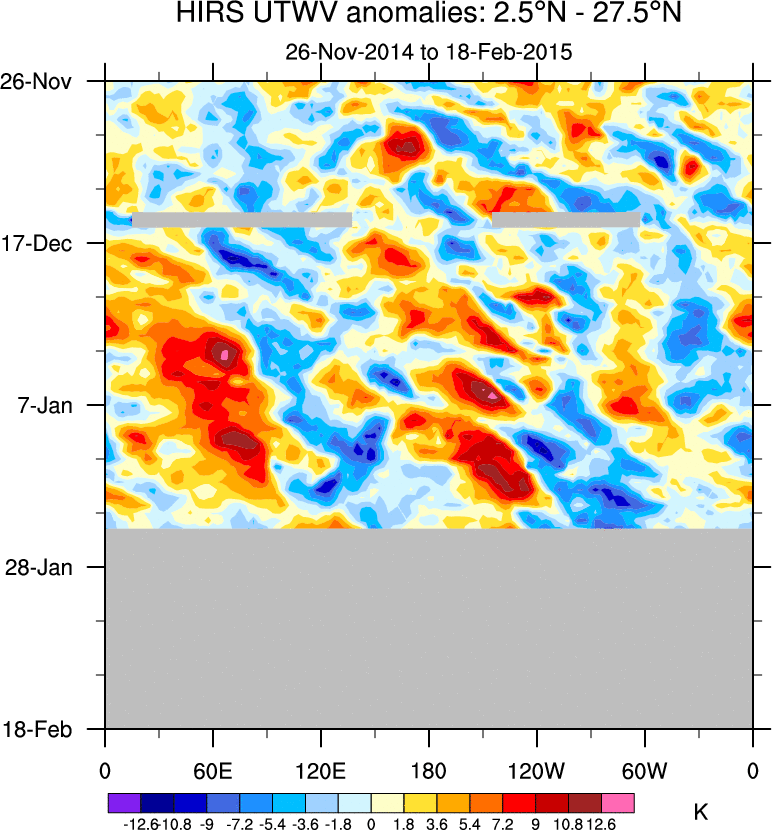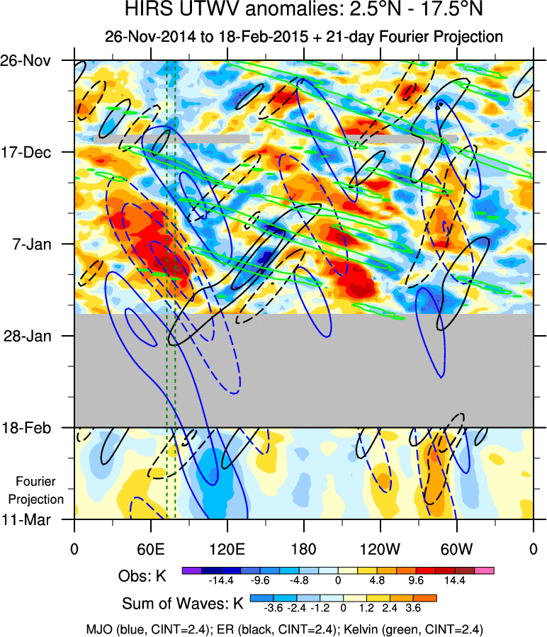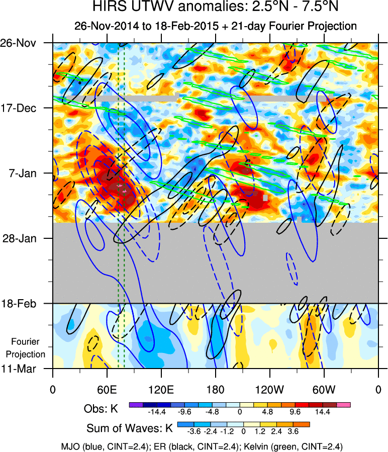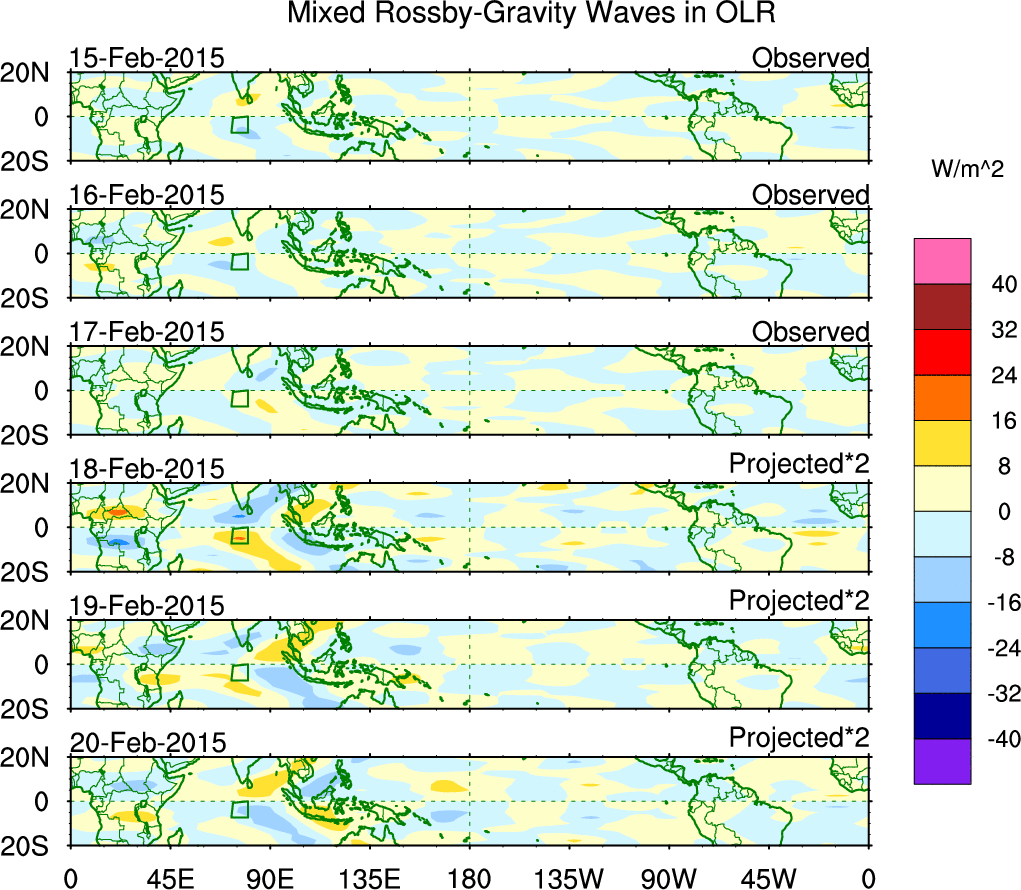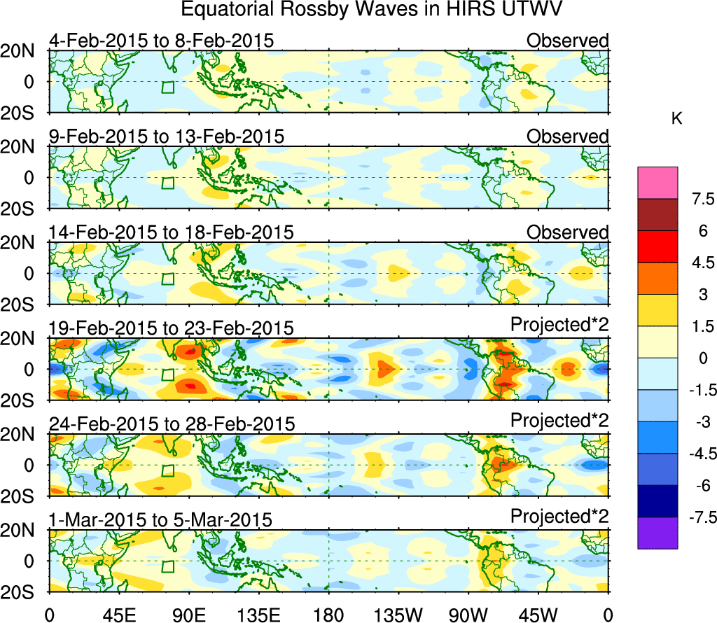 To identify tropical waves in near real-time, the OLR and UTWV data are filtered following Wheeler & Weickmann (2001 MWR). The daily anomalies are calculated using the first 3 harmonics of the seasonal cycle for 1979–2009. Missing values are then filled using linear interpolation in space and time. The most recent 365 days of anomalies are padded with 659 days of zeroes, and the result is filtered for each wave type.