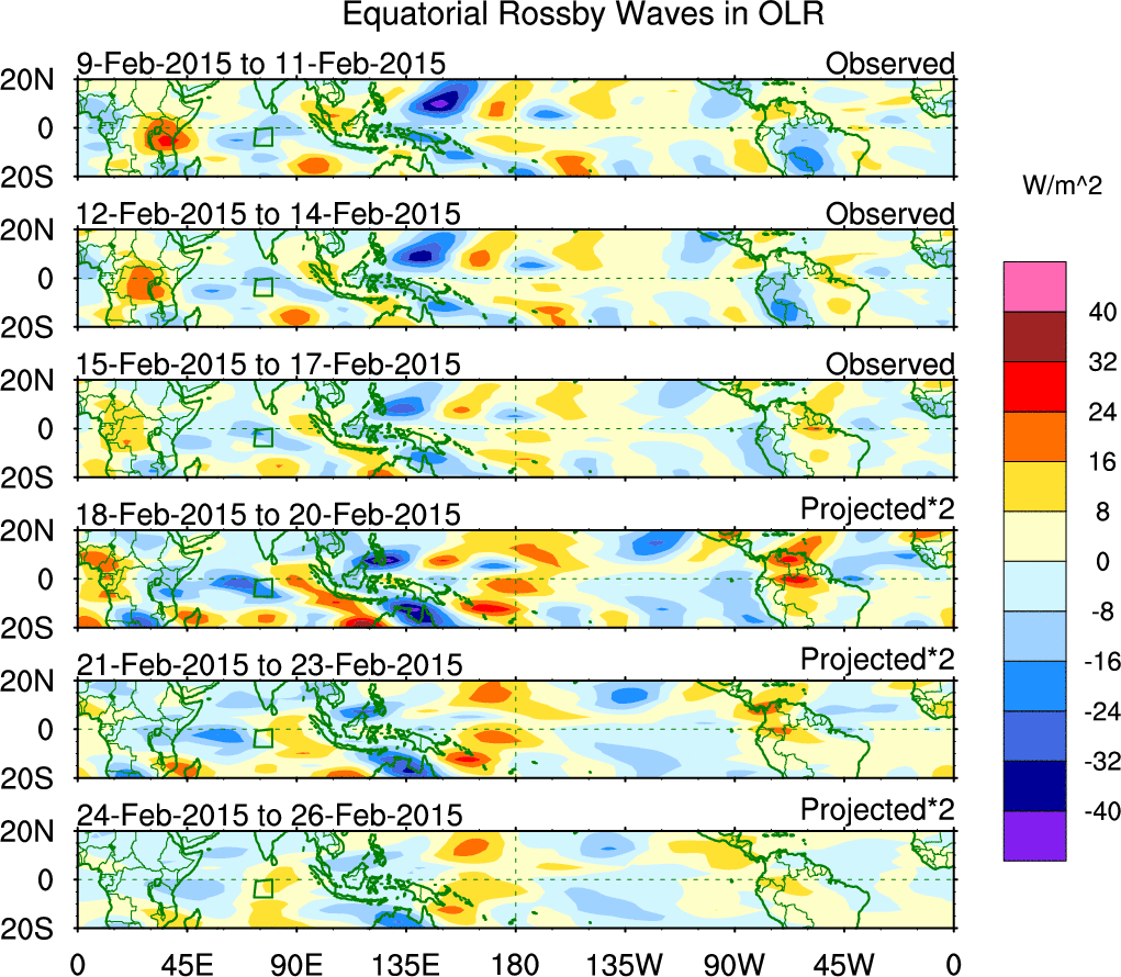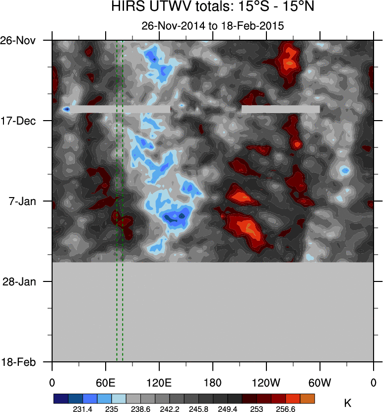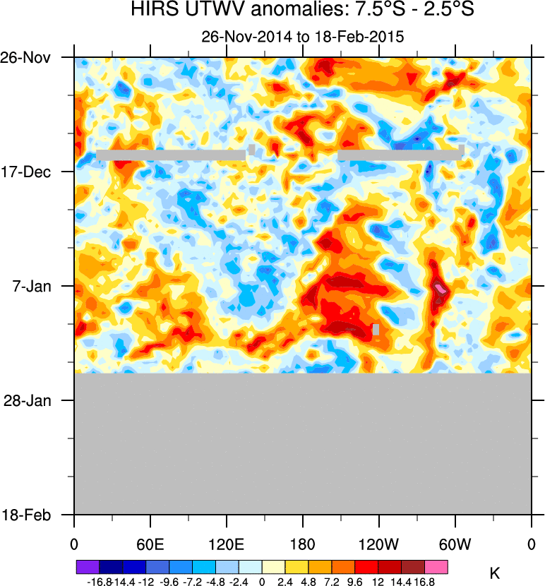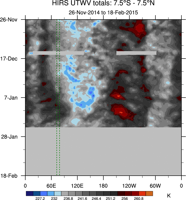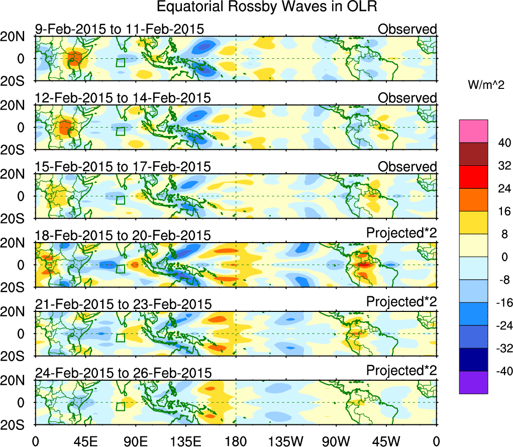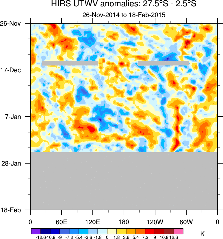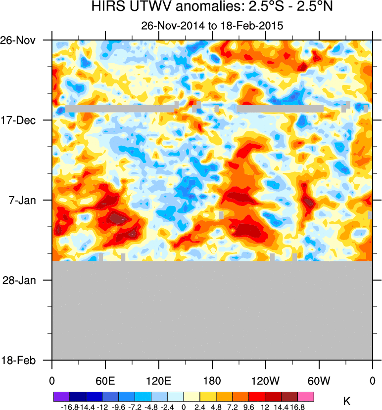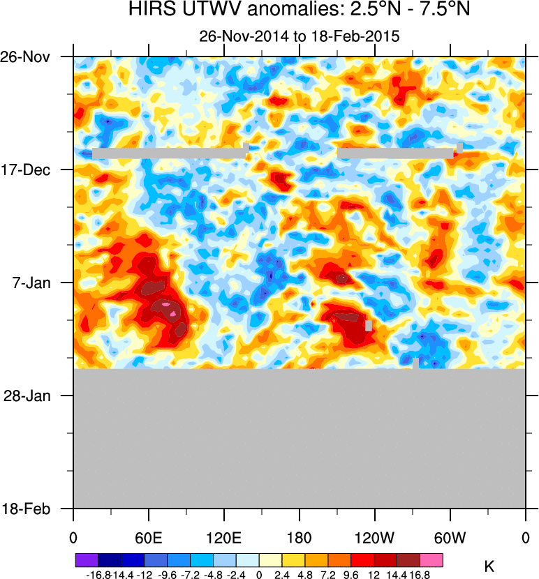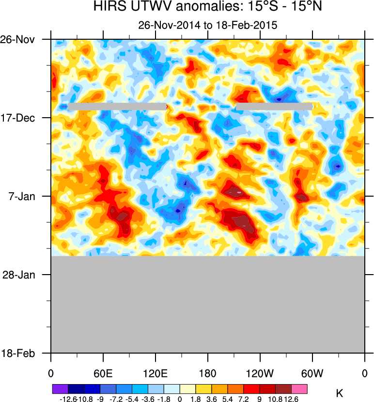 To identify tropical waves in near real-time, the OLR and UTWV data are filtered following Wheeler & Weickmann (2001 MWR). The daily anomalies are calculated using the first 3 harmonics of the seasonal cycle for 1979–2009. Missing values are then filled using linear interpolation in space and time. The most recent 365 days of anomalies are padded with 659 days of zeroes, and the result is filtered for each wave type.