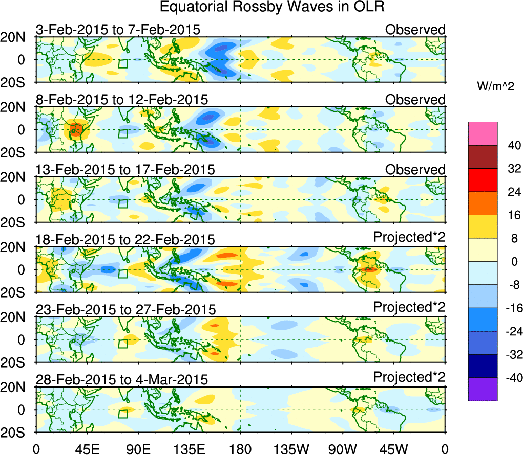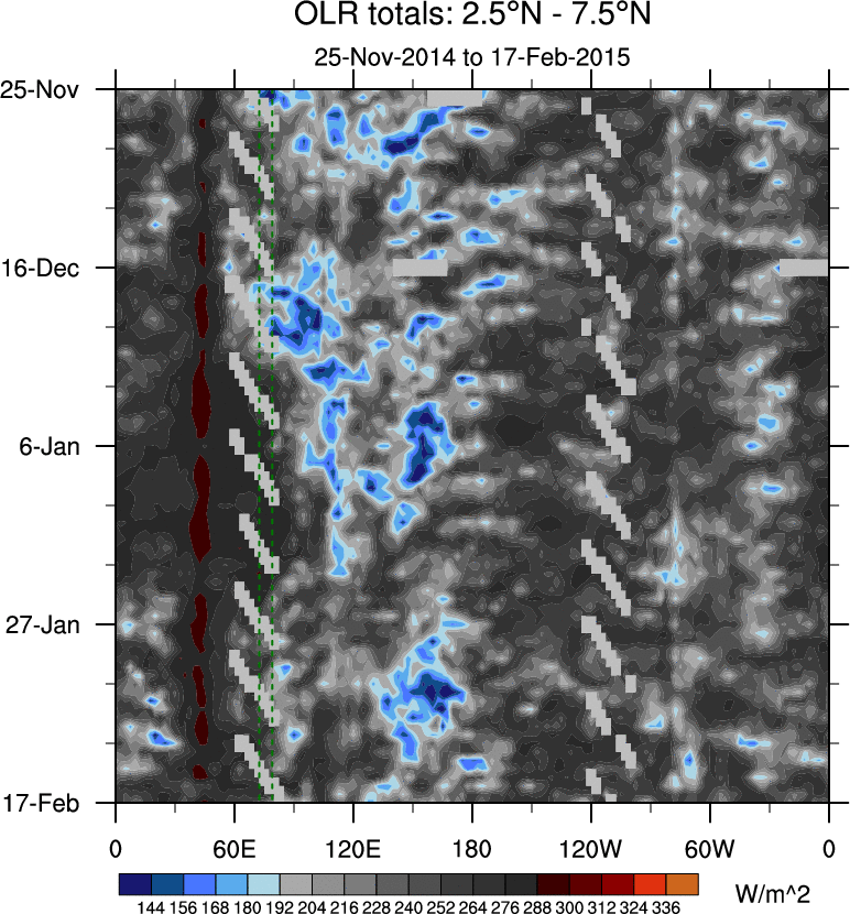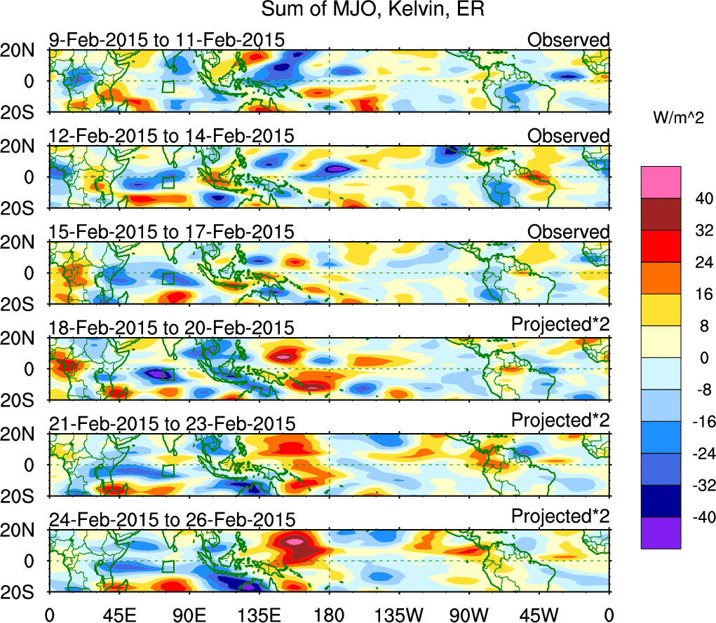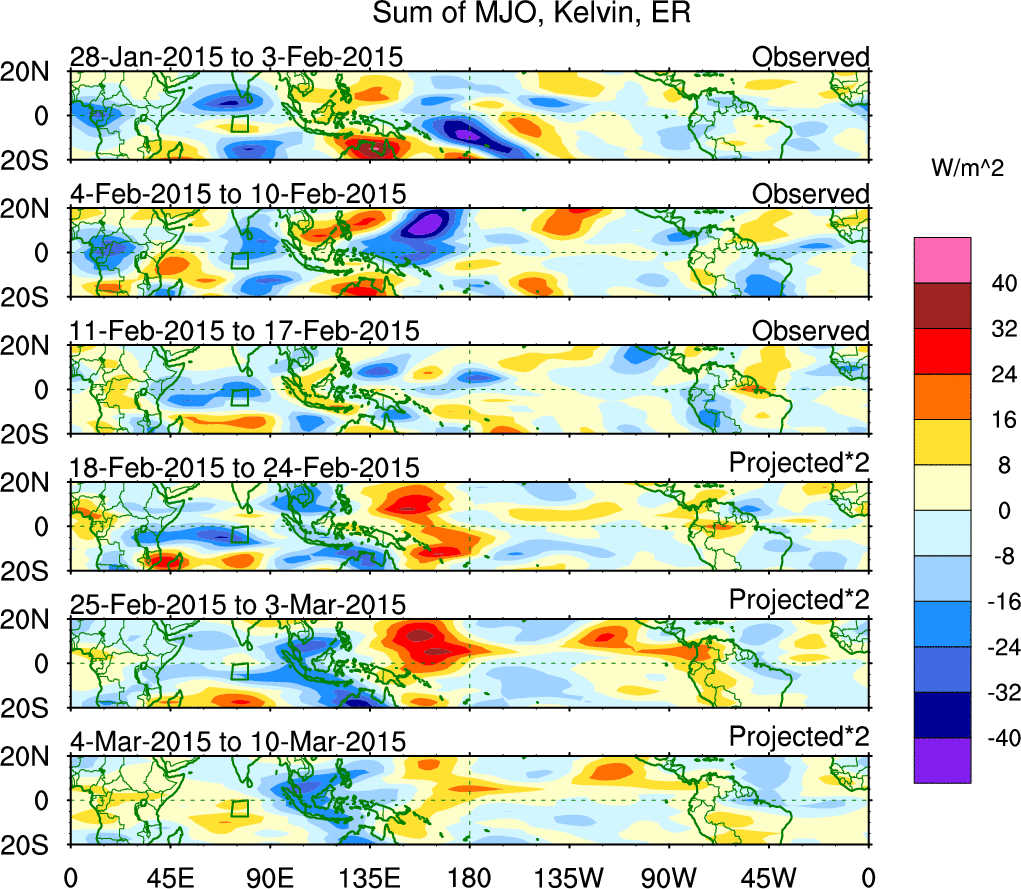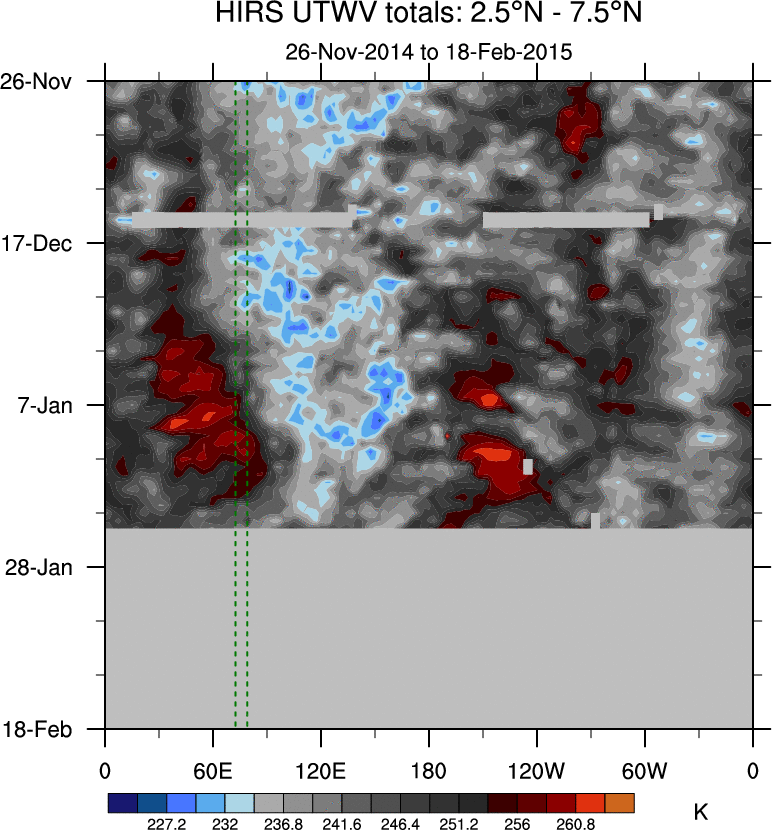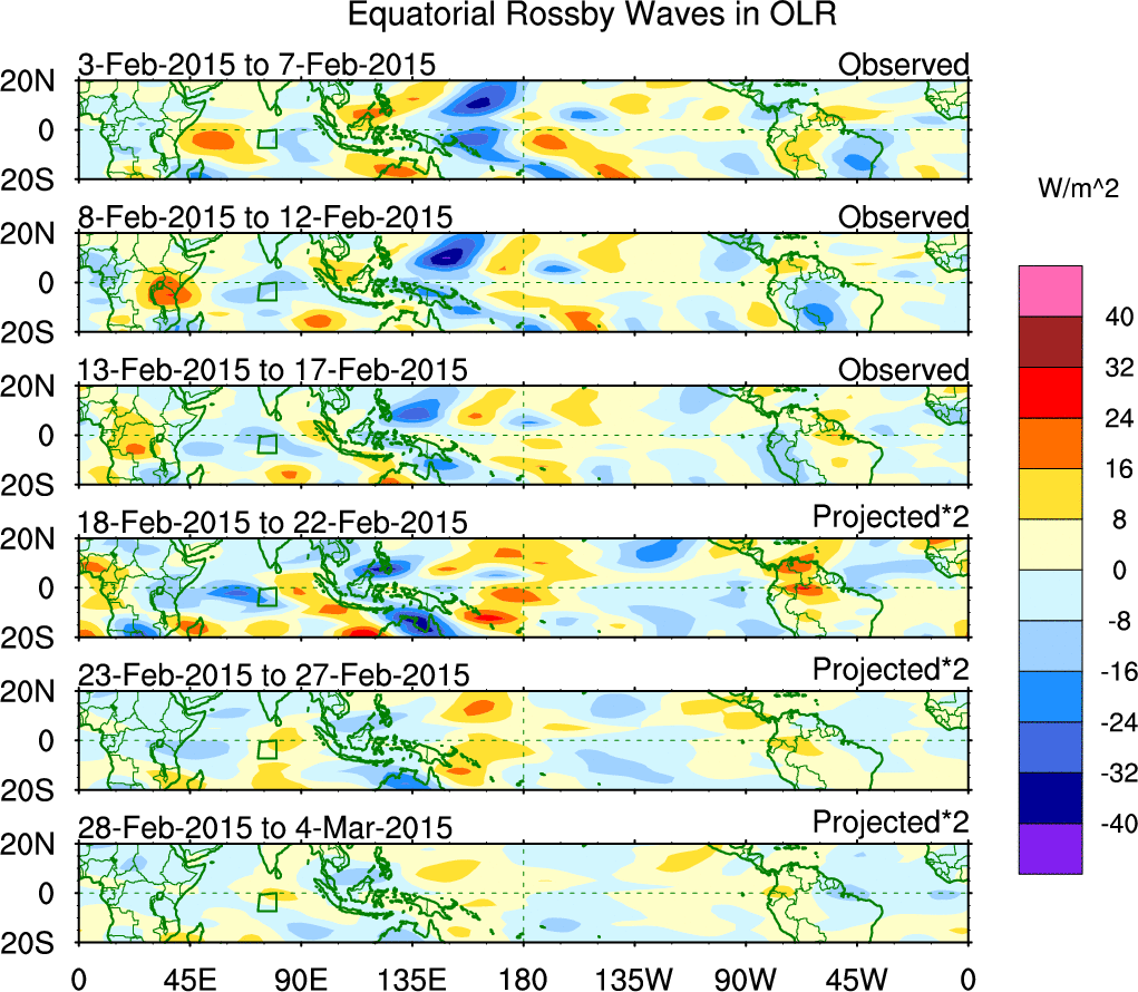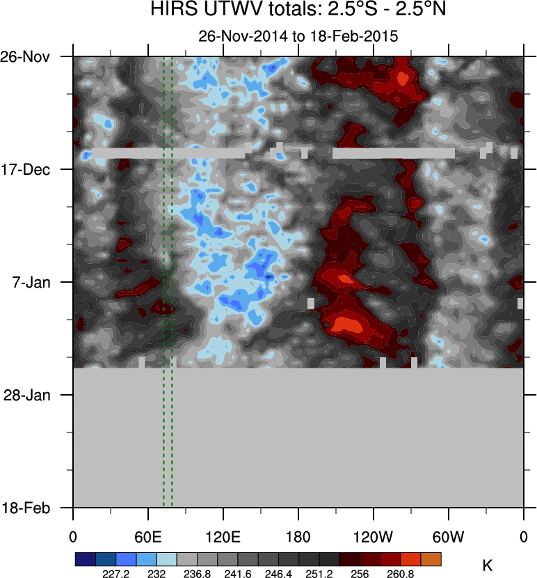 To identify tropical waves in near real-time, the OLR and UTWV data are filtered following Wheeler & Weickmann (2001 MWR). The daily anomalies are calculated using the first 3 harmonics of the seasonal cycle for 1979–2009. Missing values are then filled using linear interpolation in space and time. The most recent 365 days of anomalies are padded with 659 days of zeroes, and the result is filtered for each wave type.