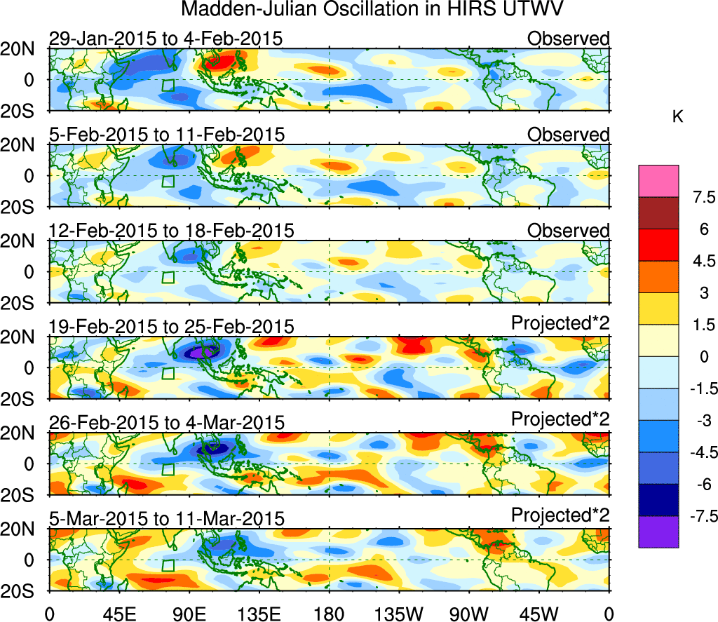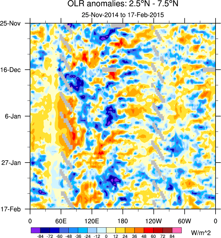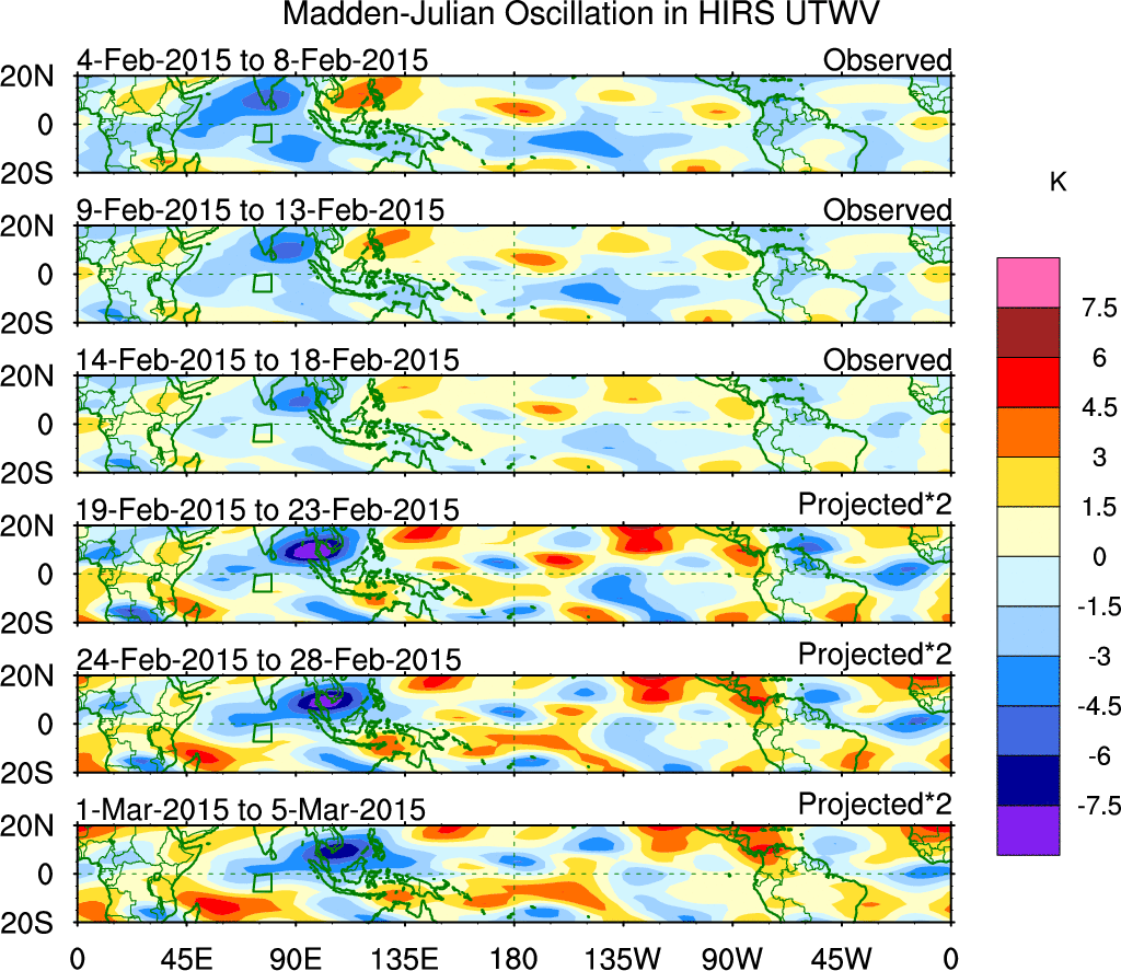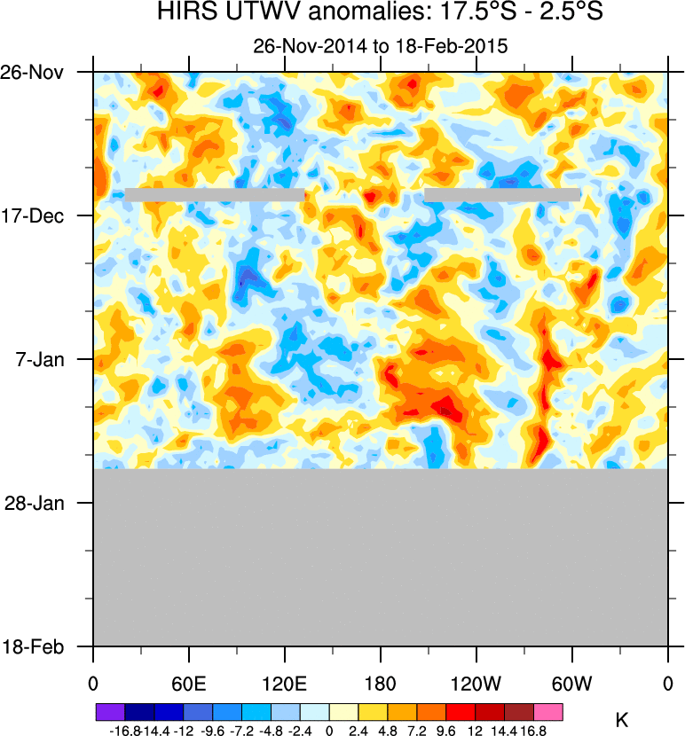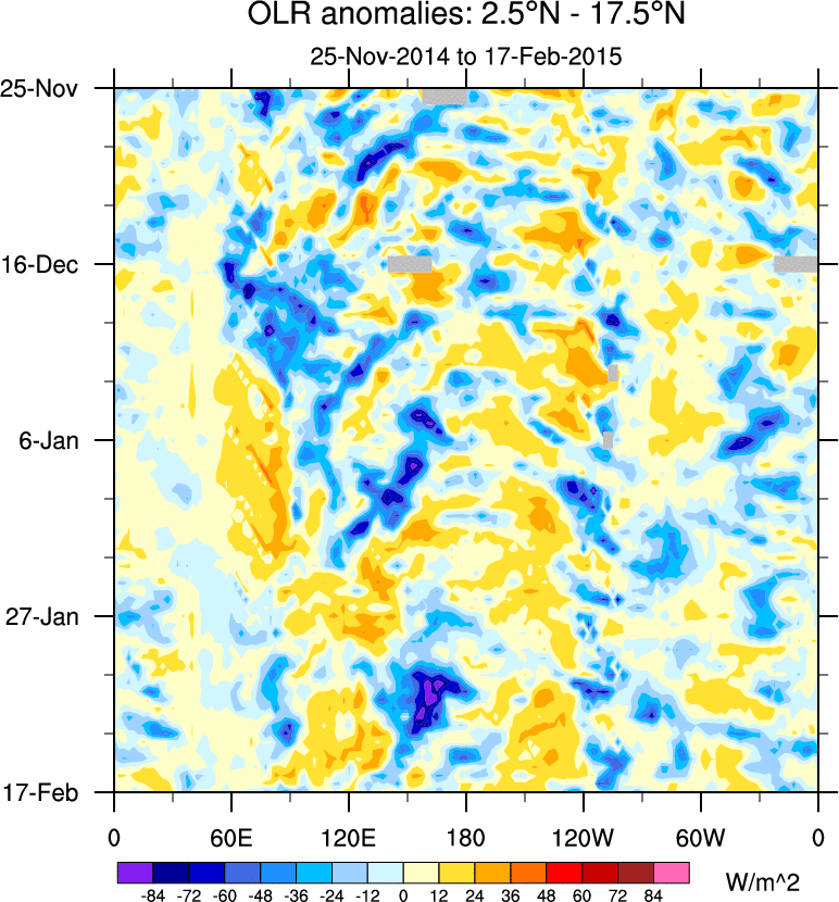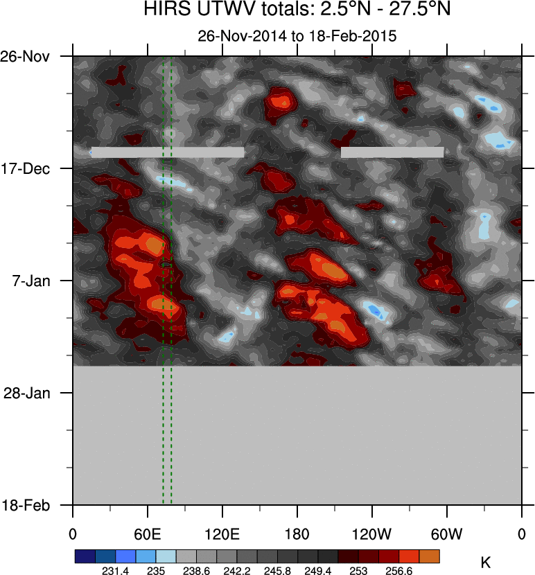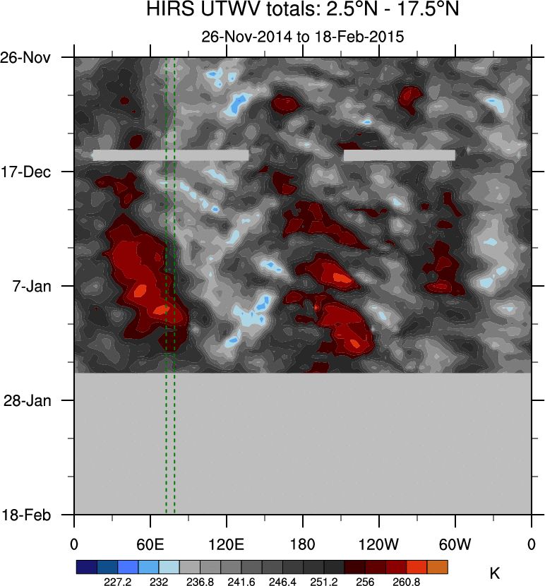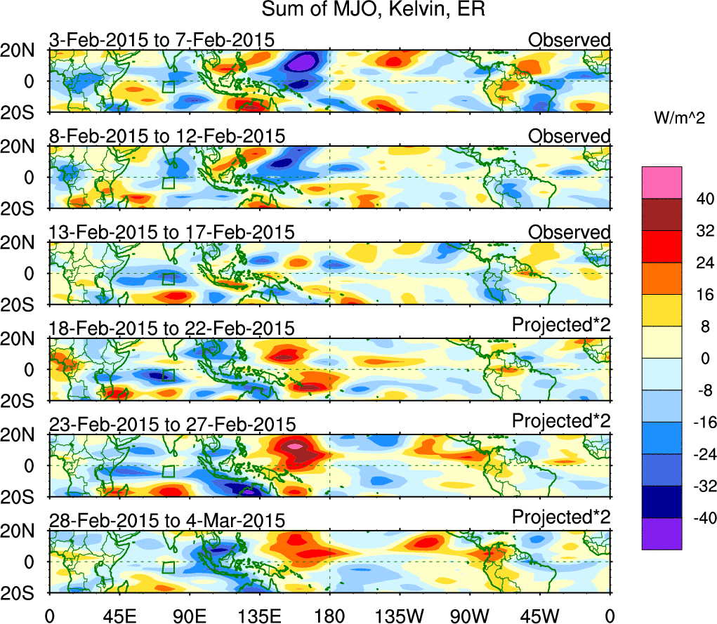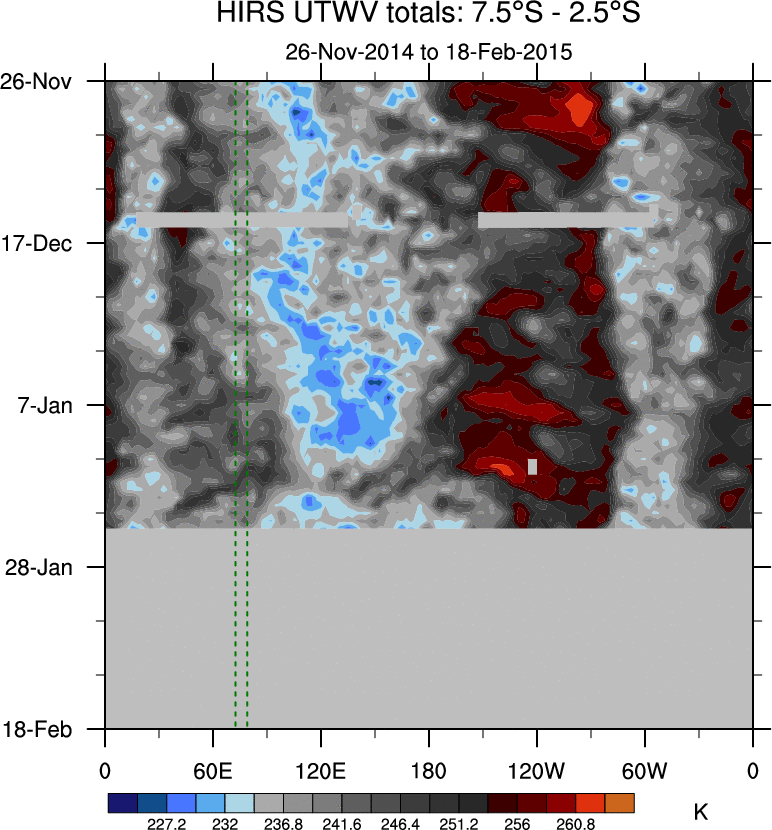 To identify tropical waves in near real-time, the OLR and UTWV data are filtered following Wheeler & Weickmann (2001 MWR). The daily anomalies are calculated using the first 3 harmonics of the seasonal cycle for 1979–2009. Missing values are then filled using linear interpolation in space and time. The most recent 365 days of anomalies are padded with 659 days of zeroes, and the result is filtered for each wave type.