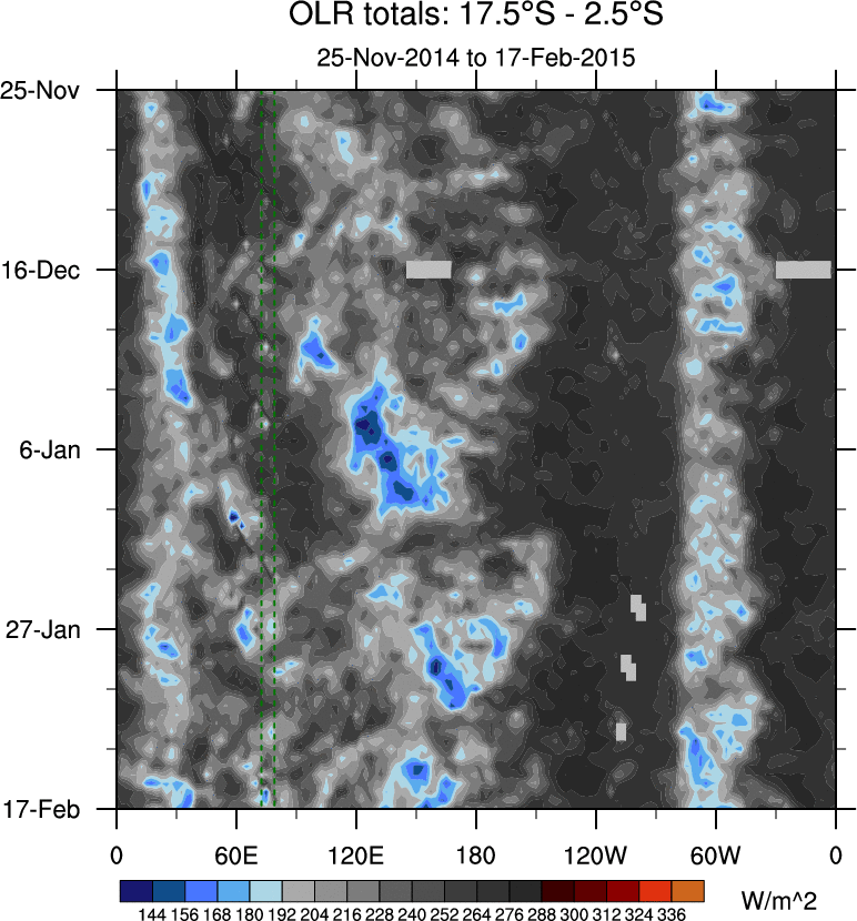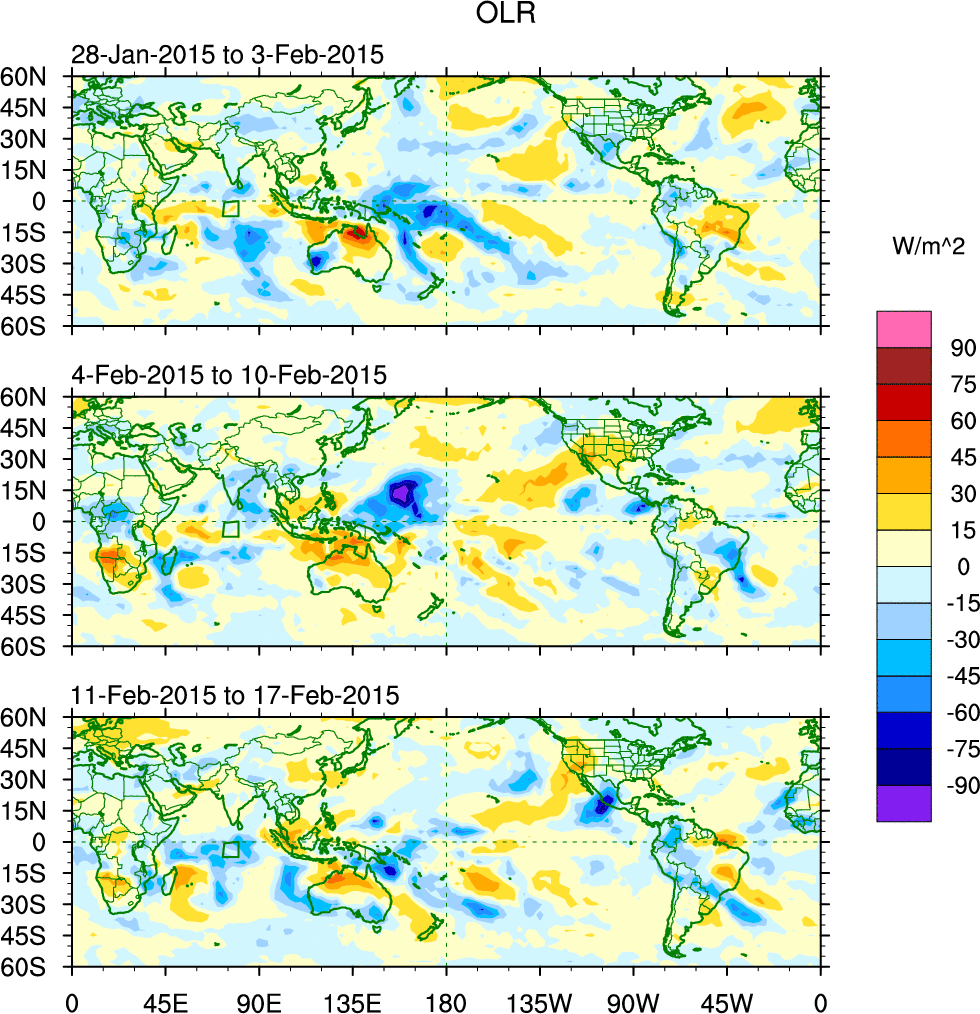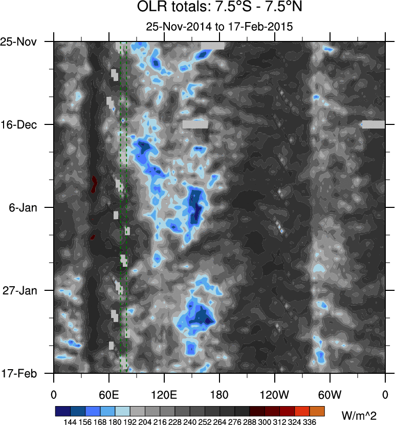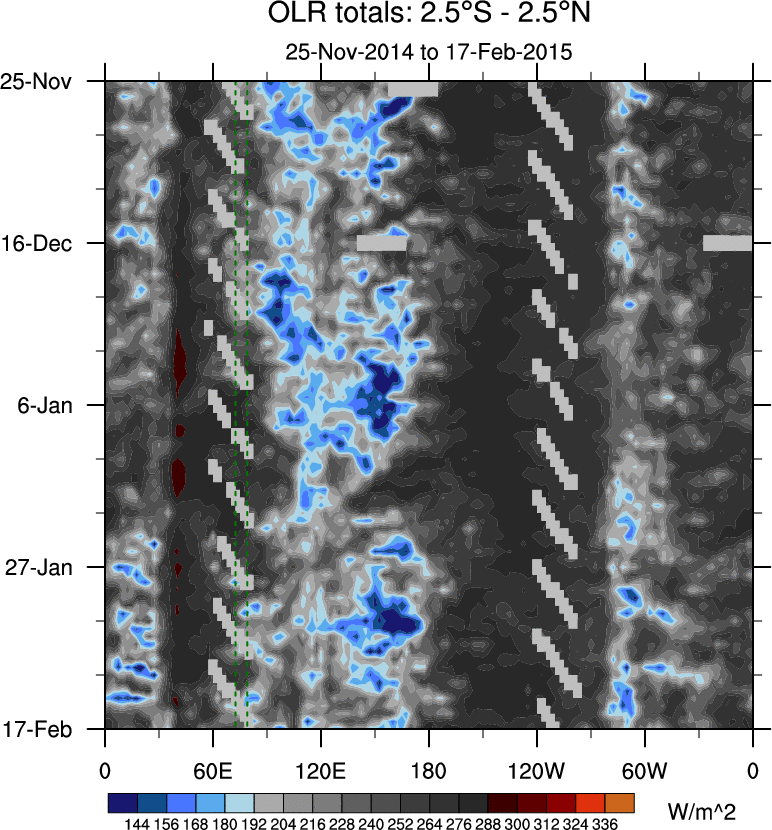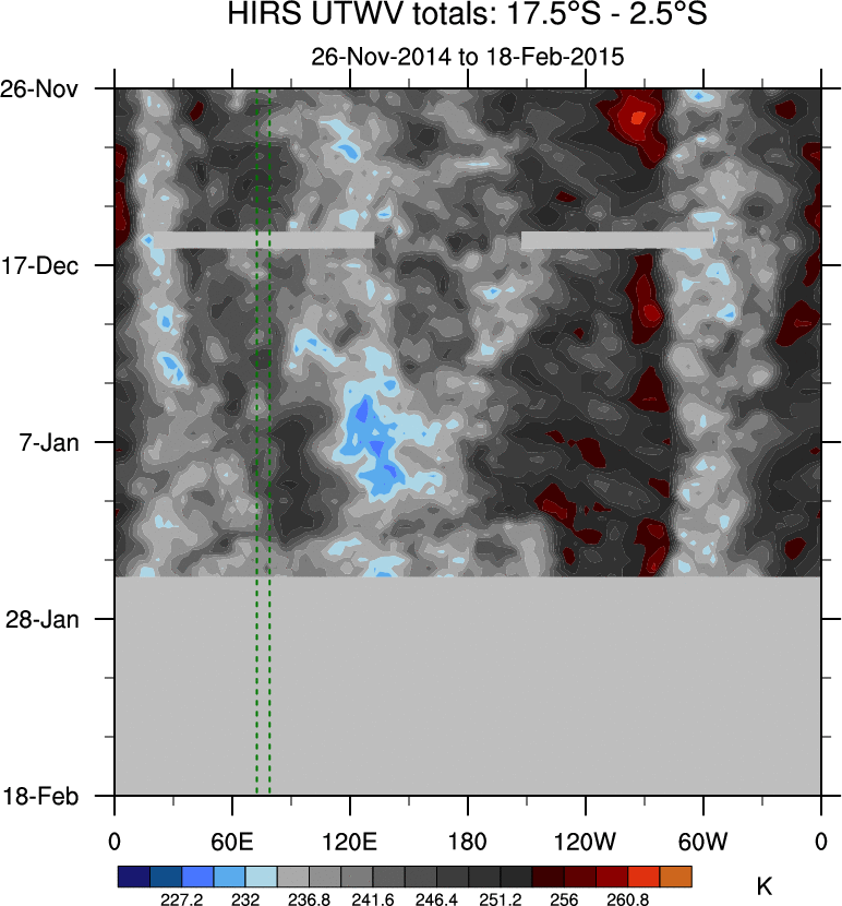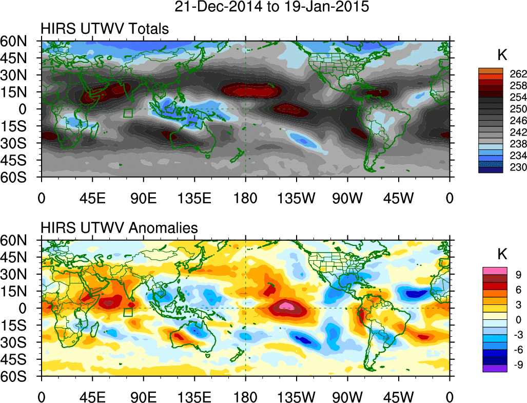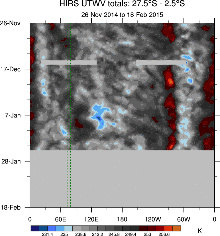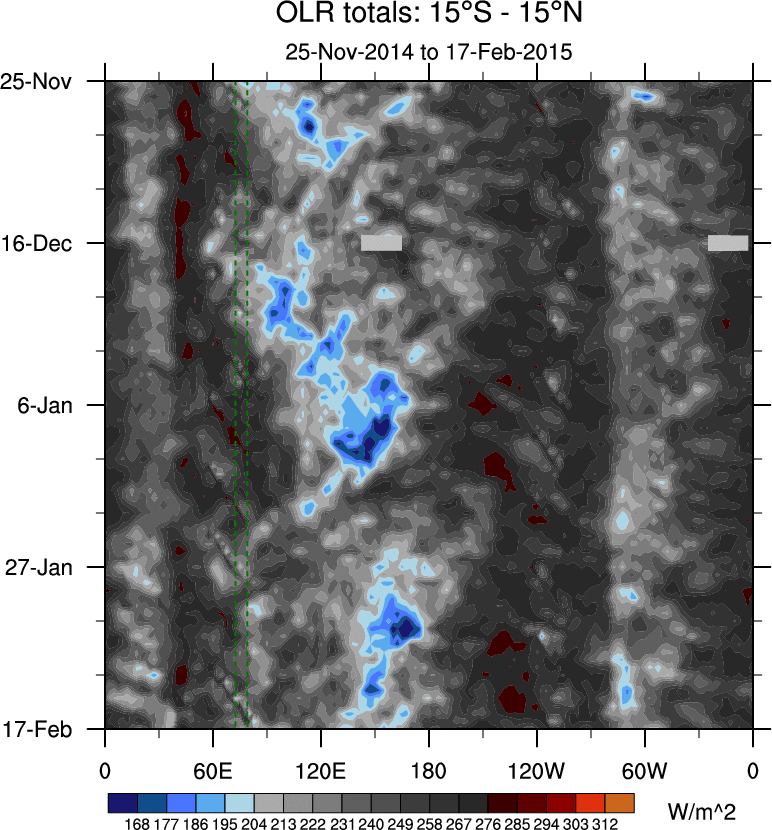 To identify tropical waves in near real-time, the OLR and UTWV data are filtered following Wheeler & Weickmann (2001 MWR). The daily anomalies are calculated using the first 3 harmonics of the seasonal cycle for 1979–2009. Missing values are then filled using linear interpolation in space and time. The most recent 365 days of anomalies are padded with 659 days of zeroes, and the result is filtered for each wave type.