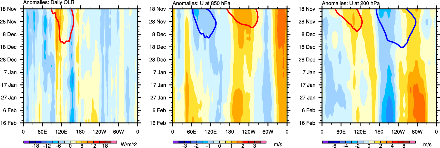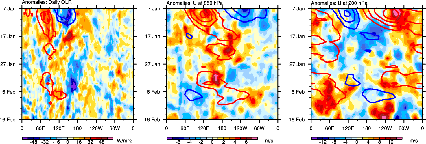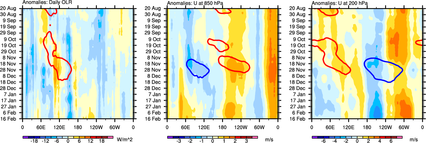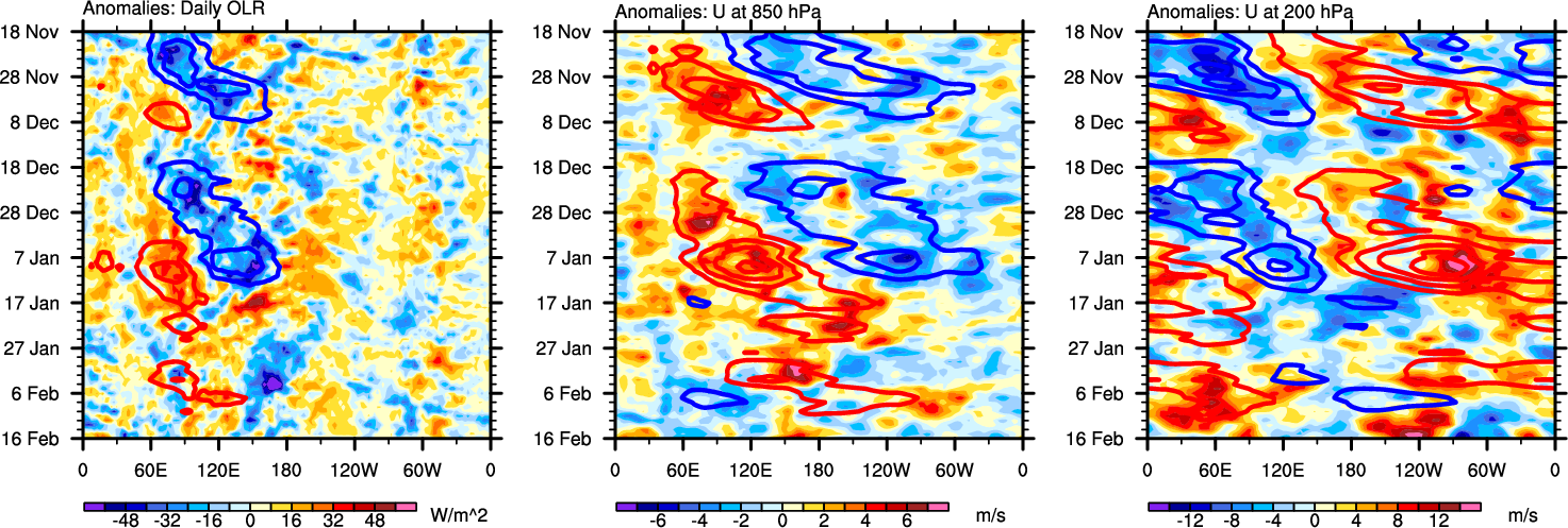 The Hovmöllers show longitude-time plots for OLR, U-850, and U-200. The shading indicates the observed anomalies, while the contours are the projection of those anomalies onto the RMM EOFs.