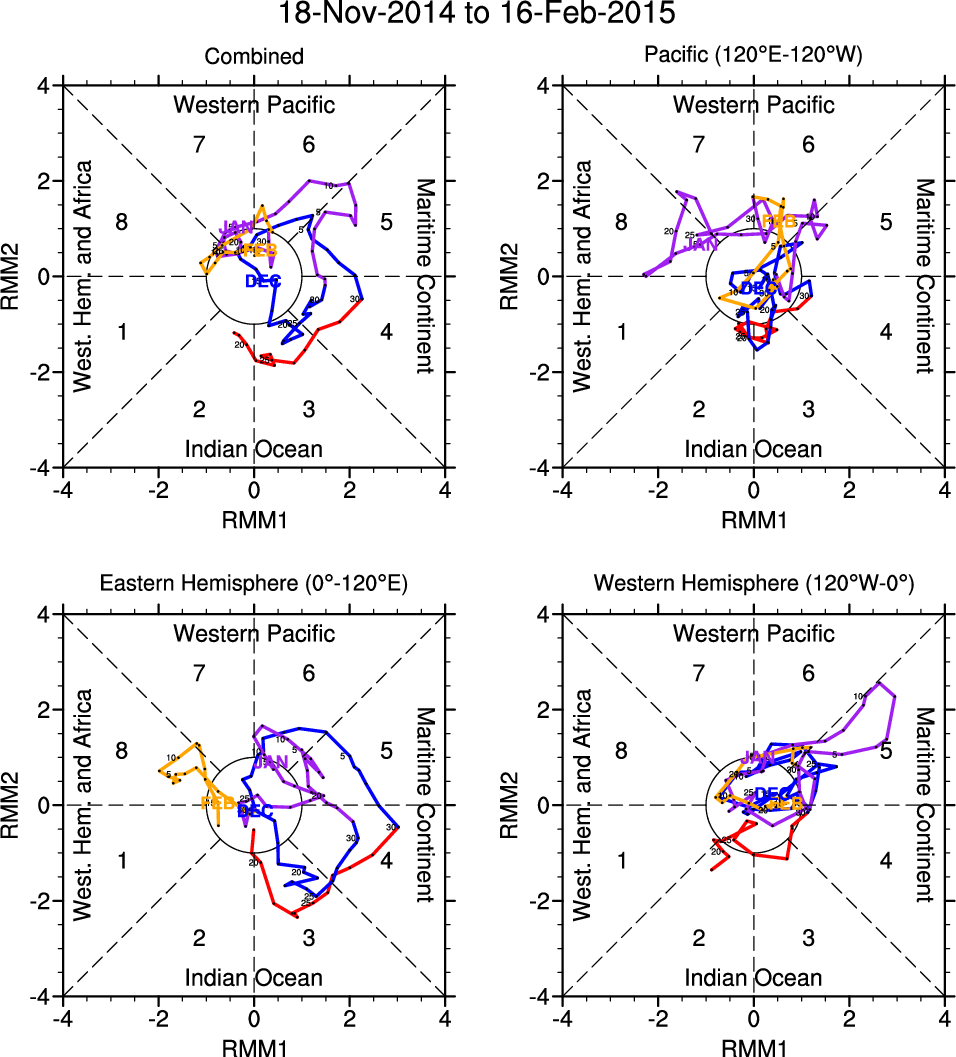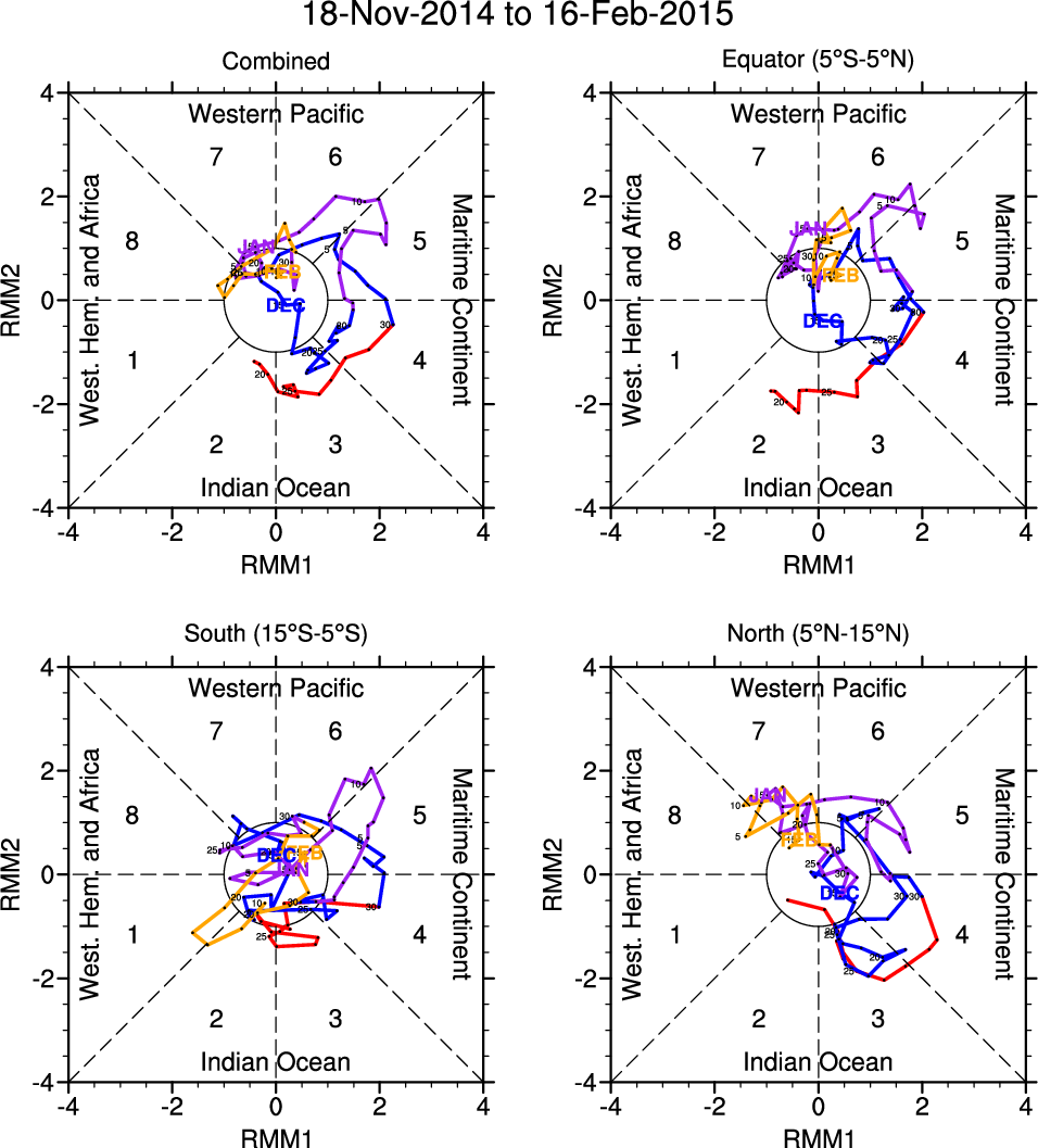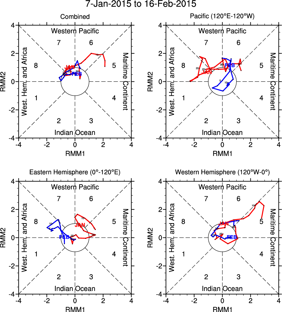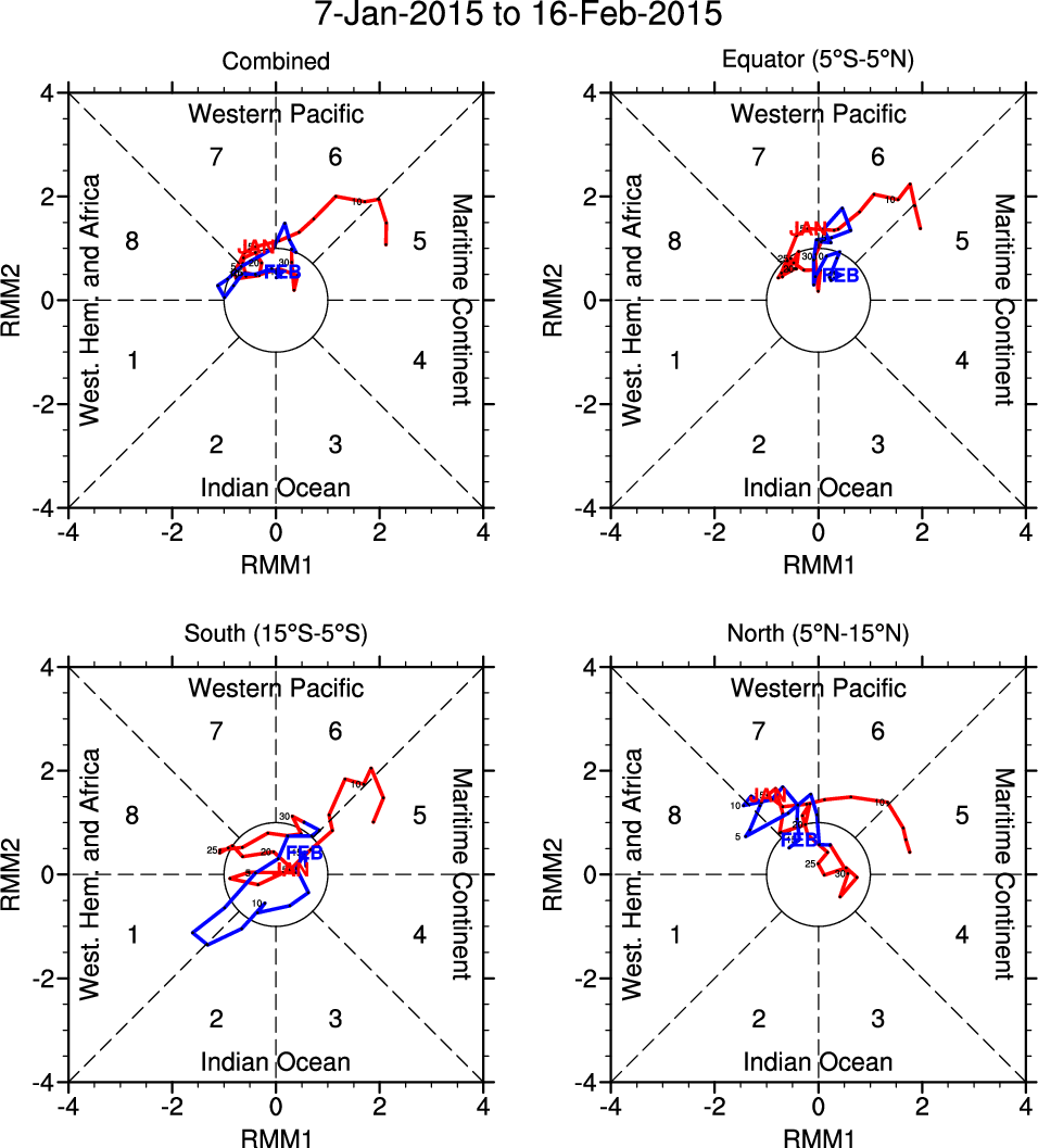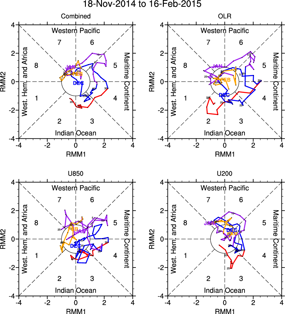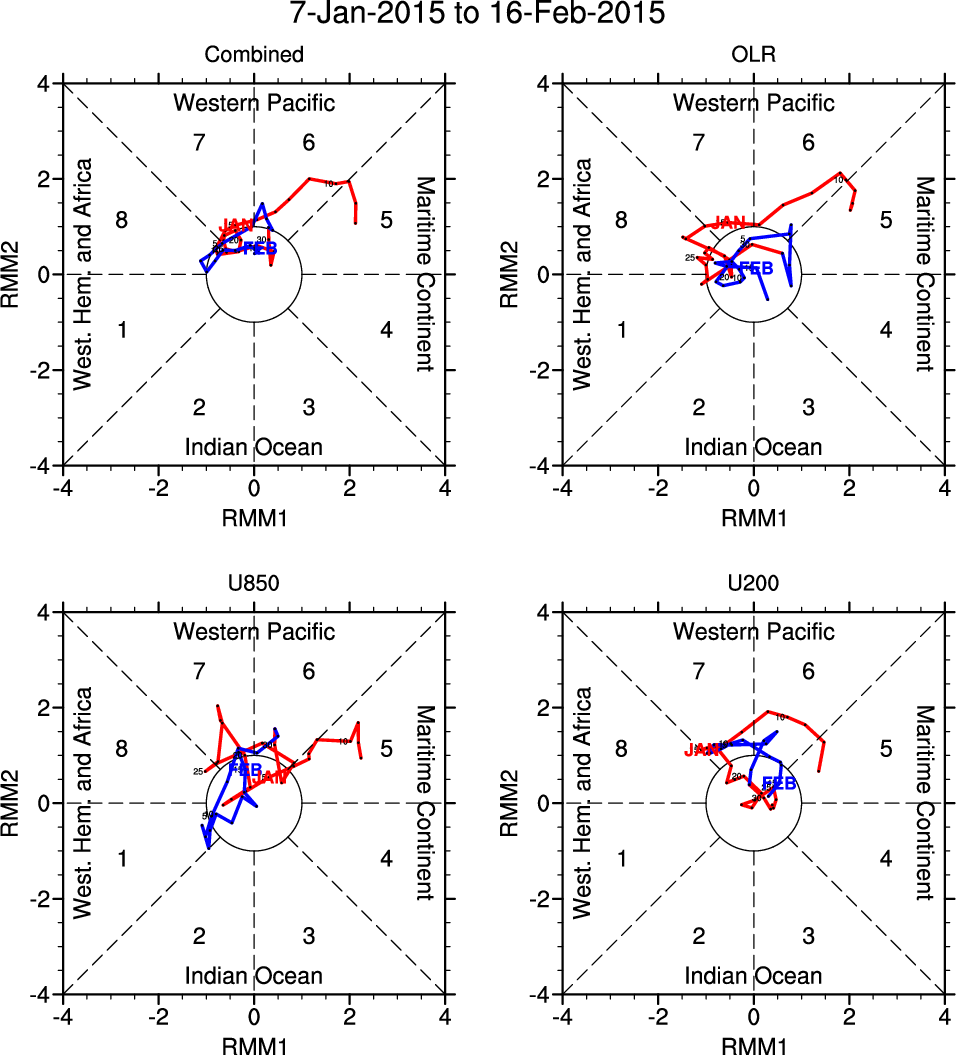 Wheeler and Hendon (2004) constructed the RMM index for monitoring the MJO. This index consists of the first two principal components (PCs) of OLR, 850-hPa zonal wind, and 200-hPa zonal wind averaged 15S-15N.