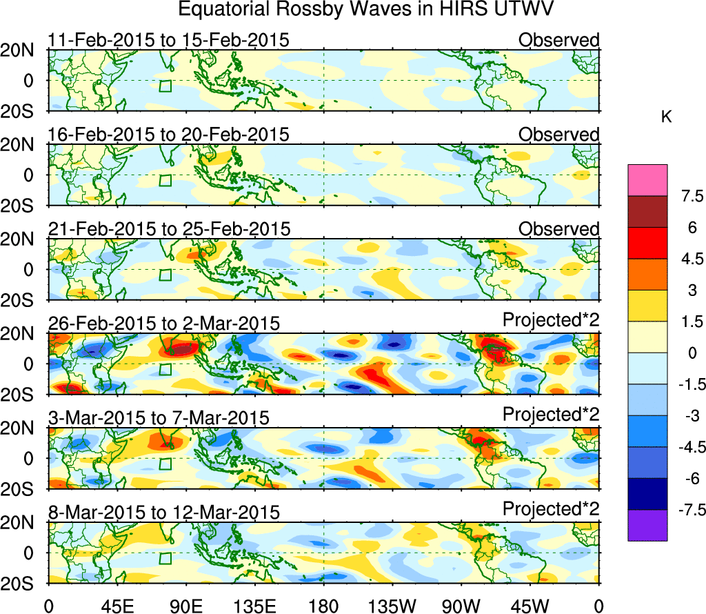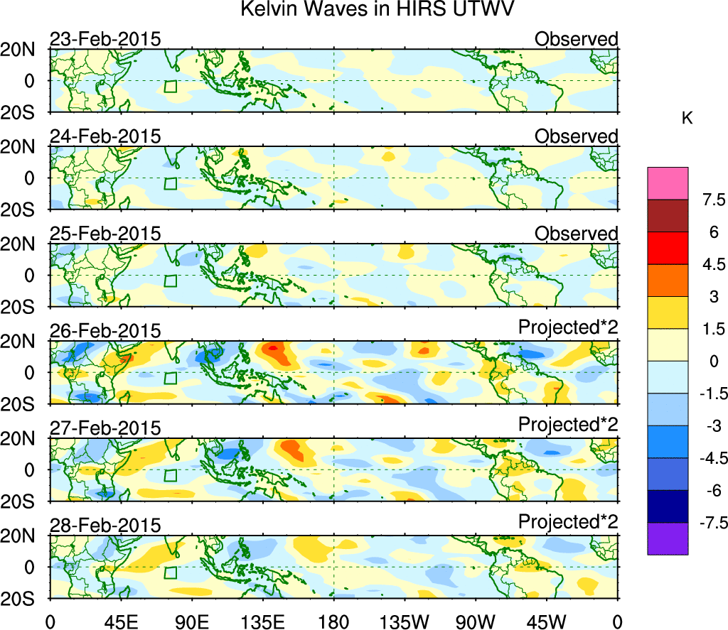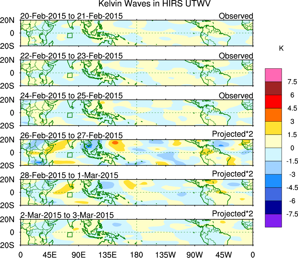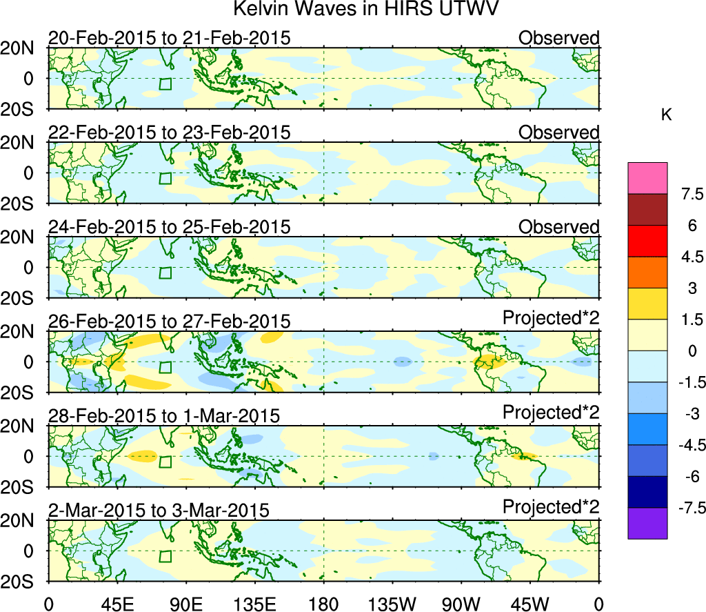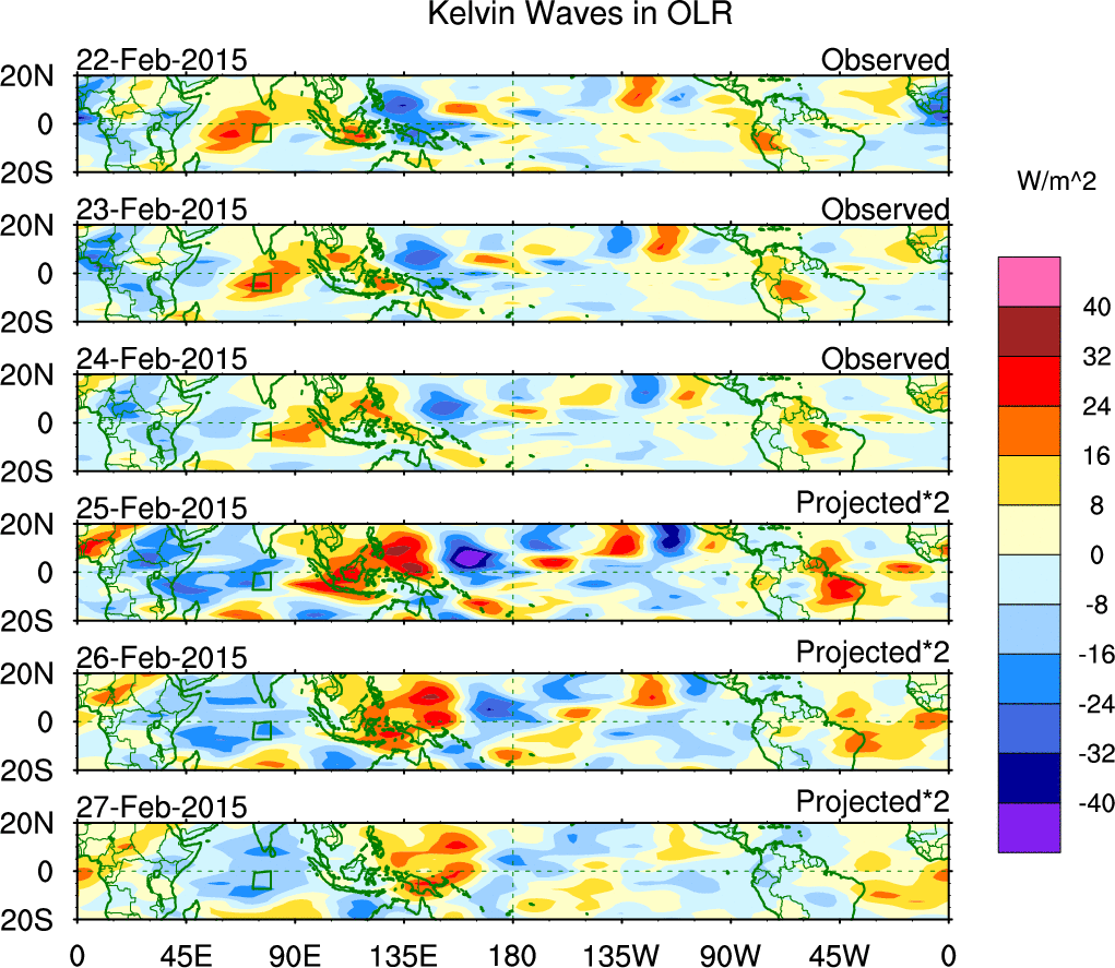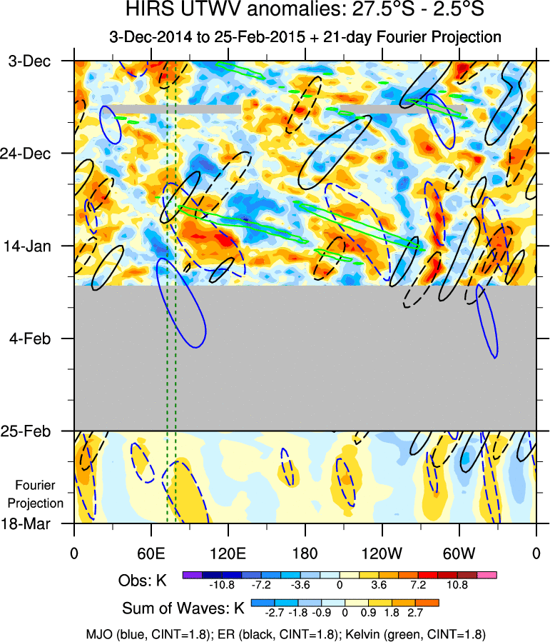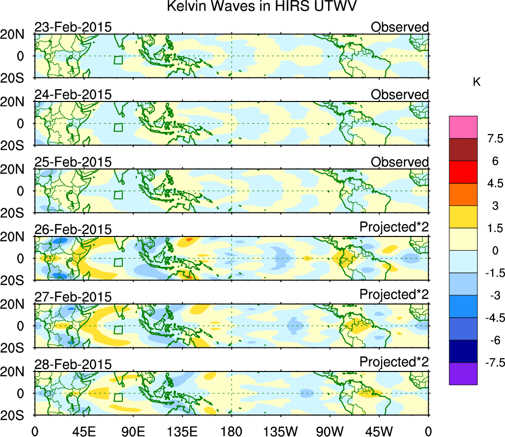 To identify tropical waves in near real-time, the OLR and UTWV data are filtered following Wheeler & Weickmann (2001 MWR). The daily anomalies are calculated using the first 3 harmonics of the seasonal cycle for 1979–2009. Missing values are then filled using linear interpolation in space and time. The most recent 365 days of anomalies are padded with 659 days of zeroes, and the result is filtered for each wave type.