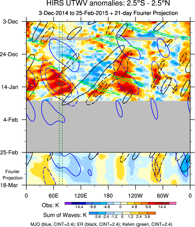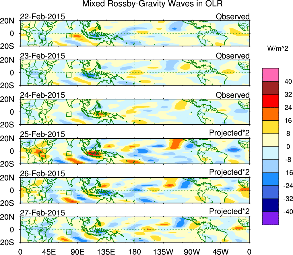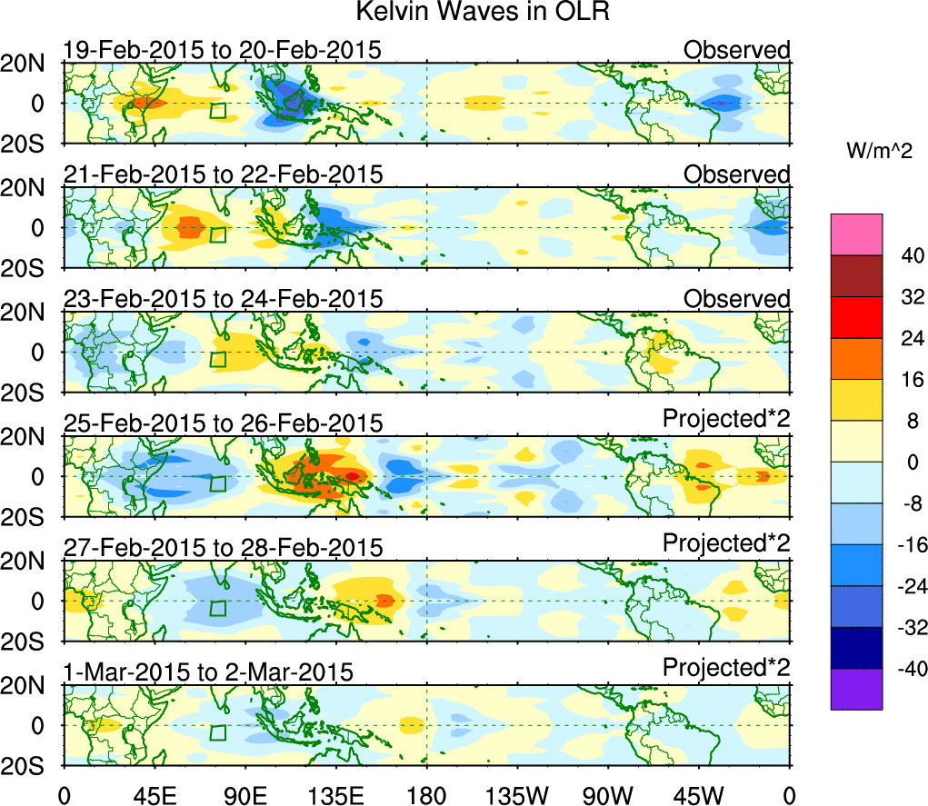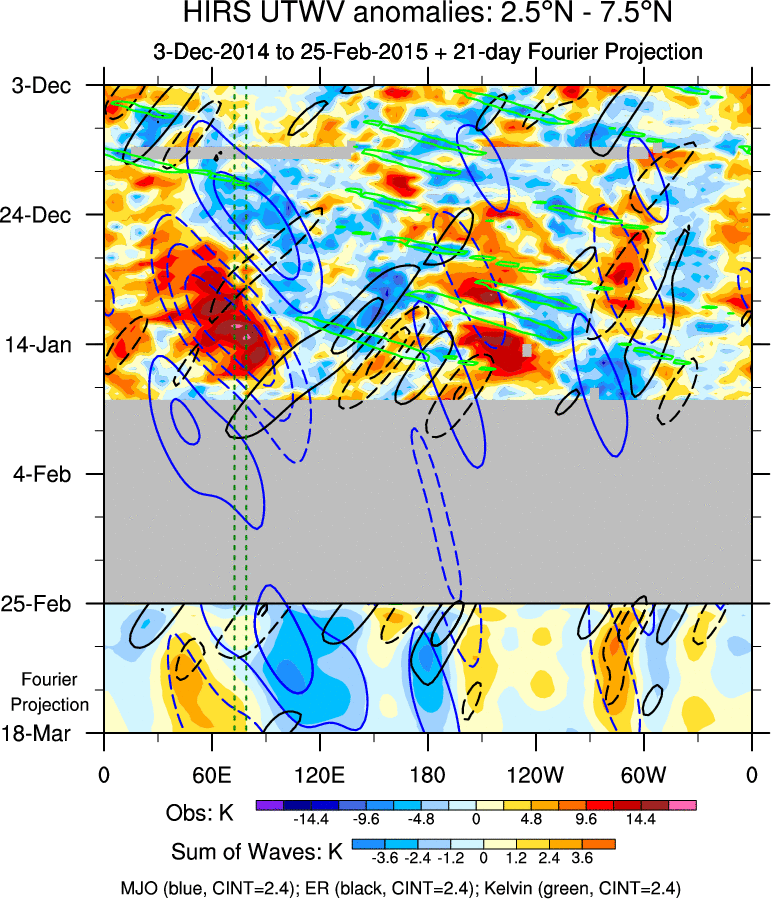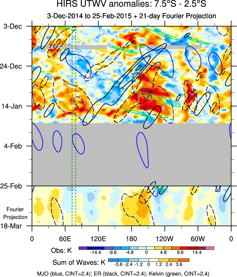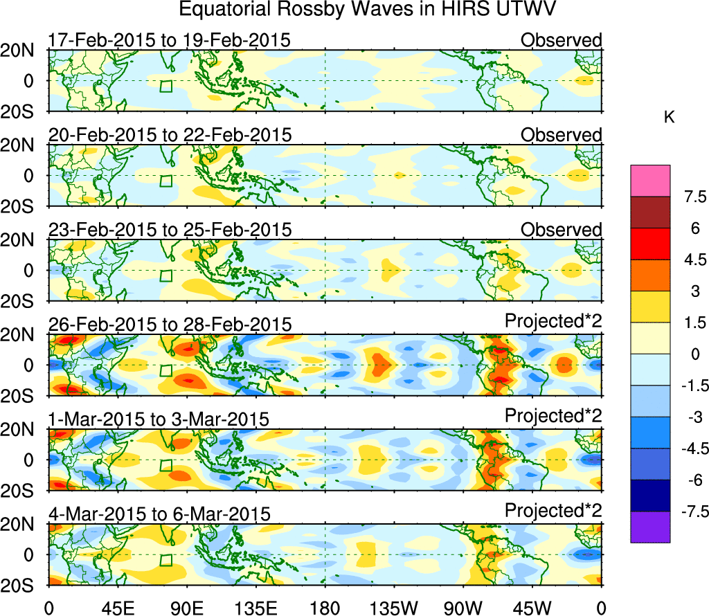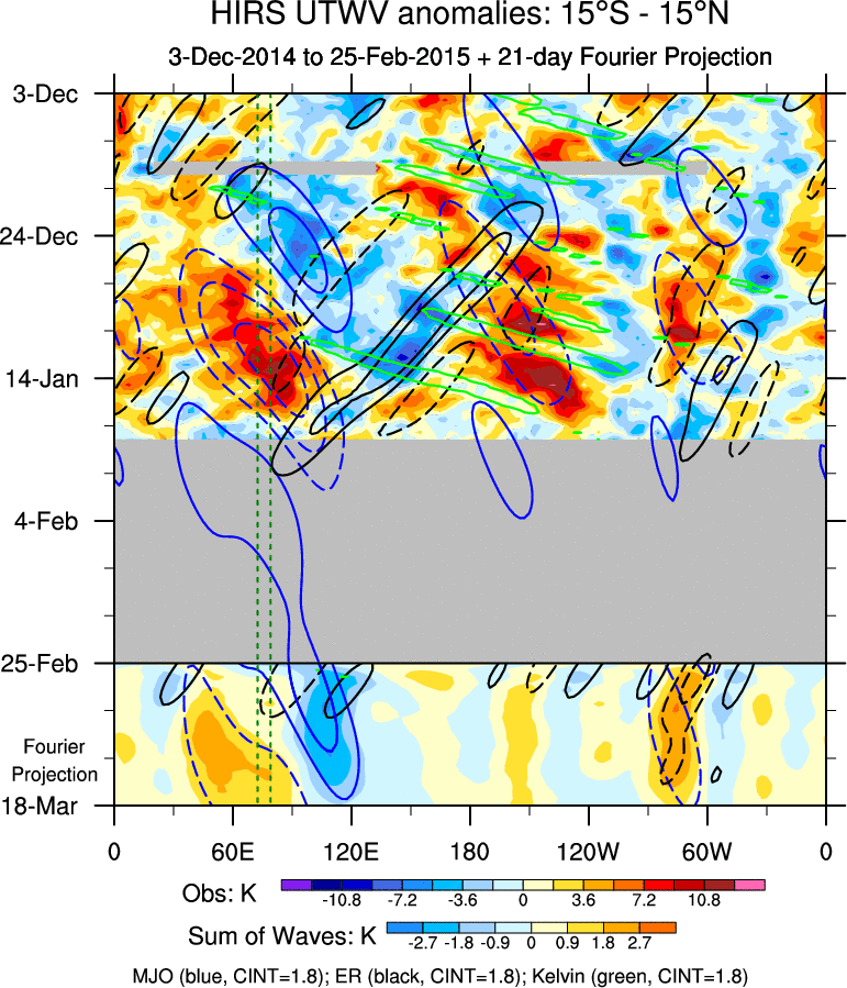 To identify tropical waves in near real-time, the OLR and UTWV data are filtered following Wheeler & Weickmann (2001 MWR). The daily anomalies are calculated using the first 3 harmonics of the seasonal cycle for 1979–2009. Missing values are then filled using linear interpolation in space and time. The most recent 365 days of anomalies are padded with 659 days of zeroes, and the result is filtered for each wave type.