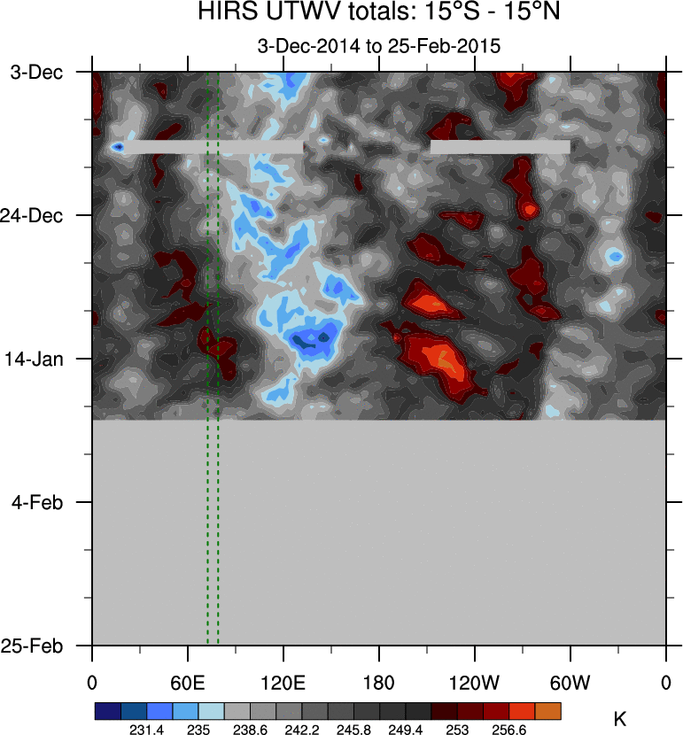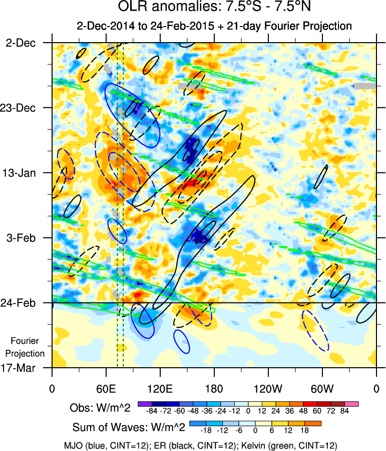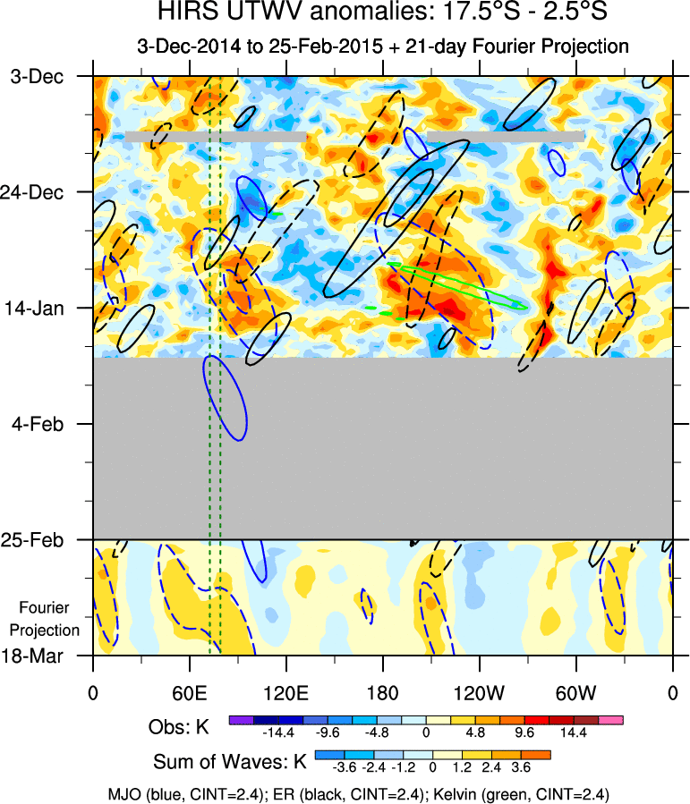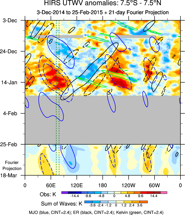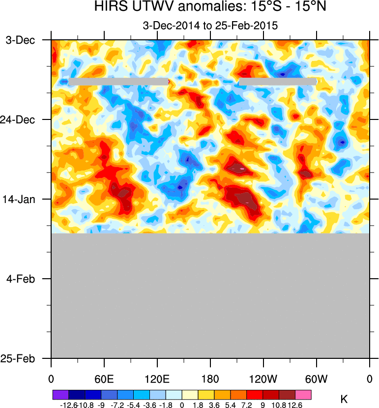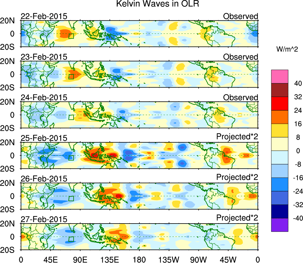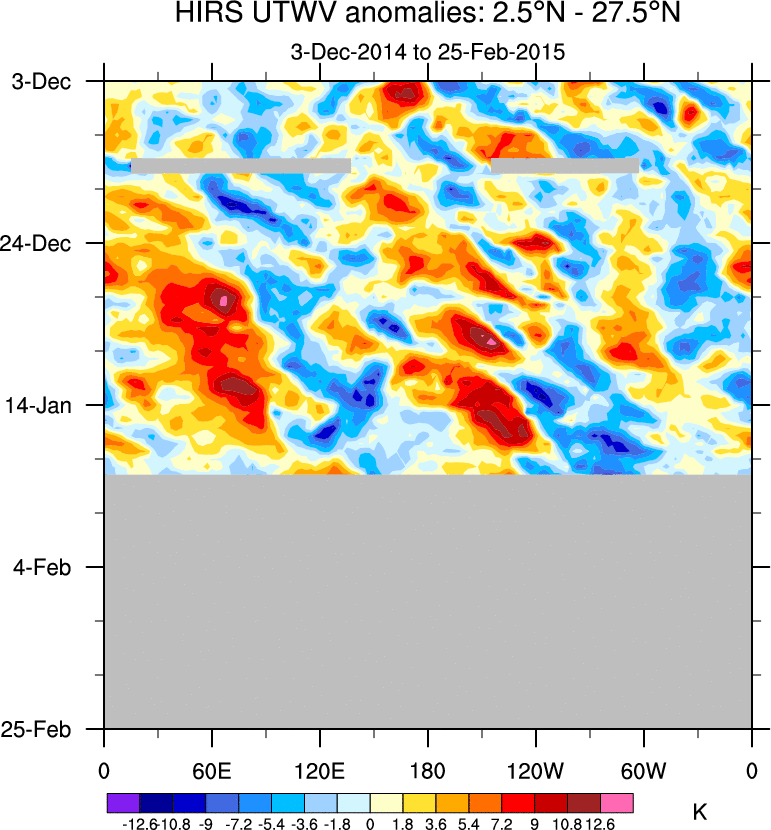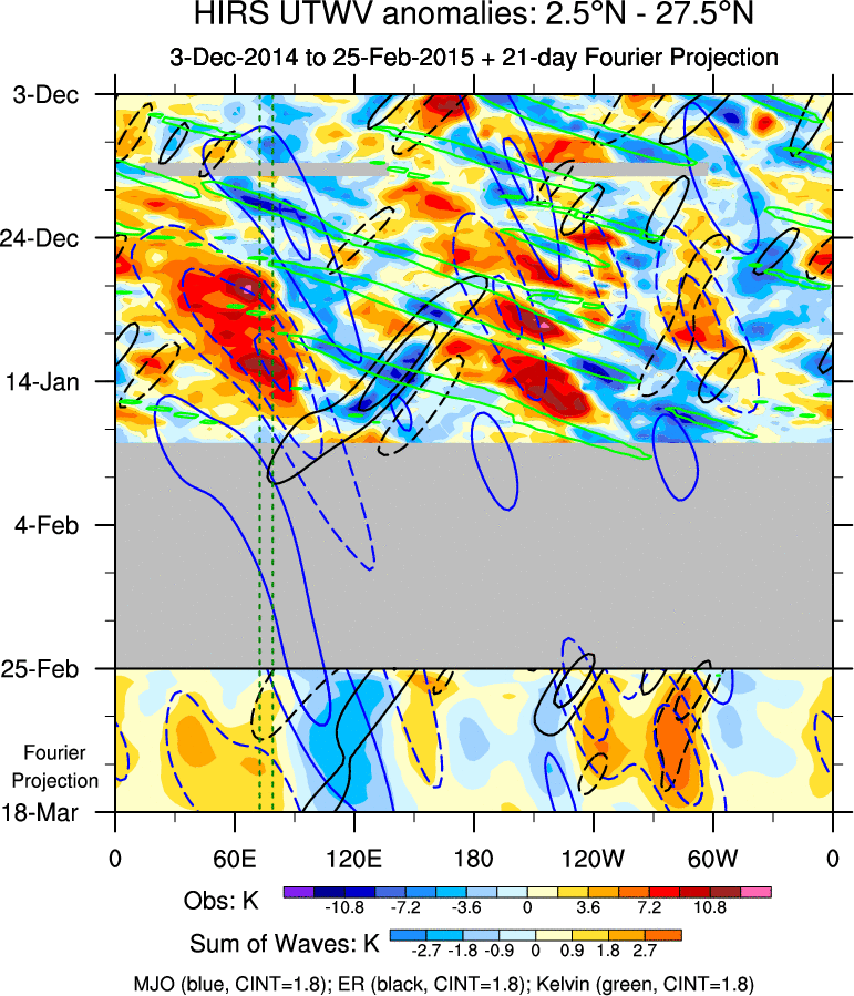 To identify tropical waves in near real-time, the OLR and UTWV data are filtered following Wheeler & Weickmann (2001 MWR). The daily anomalies are calculated using the first 3 harmonics of the seasonal cycle for 1979–2009. Missing values are then filled using linear interpolation in space and time. The most recent 365 days of anomalies are padded with 659 days of zeroes, and the result is filtered for each wave type.