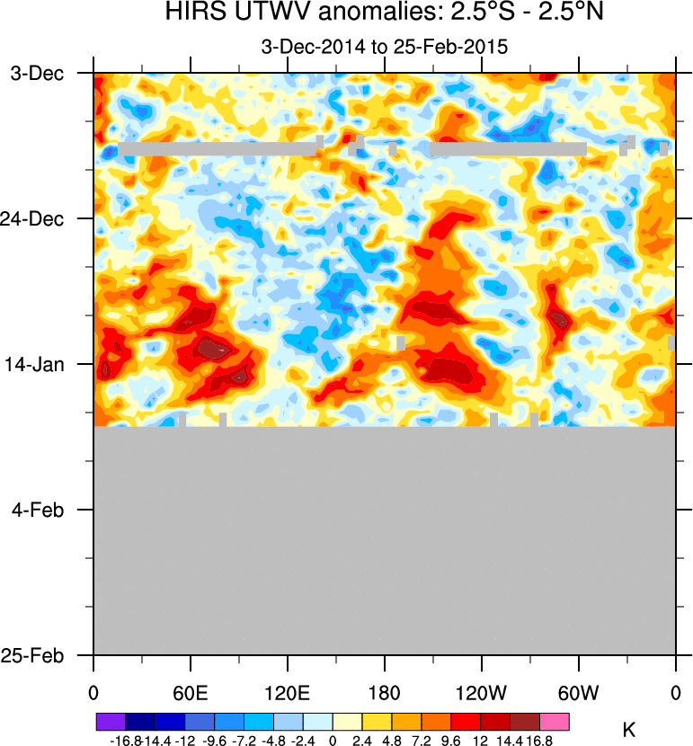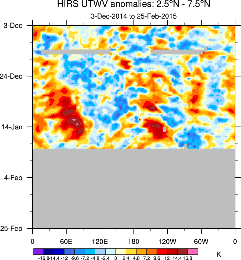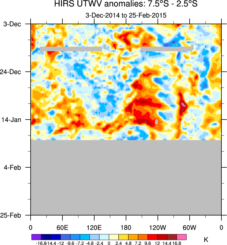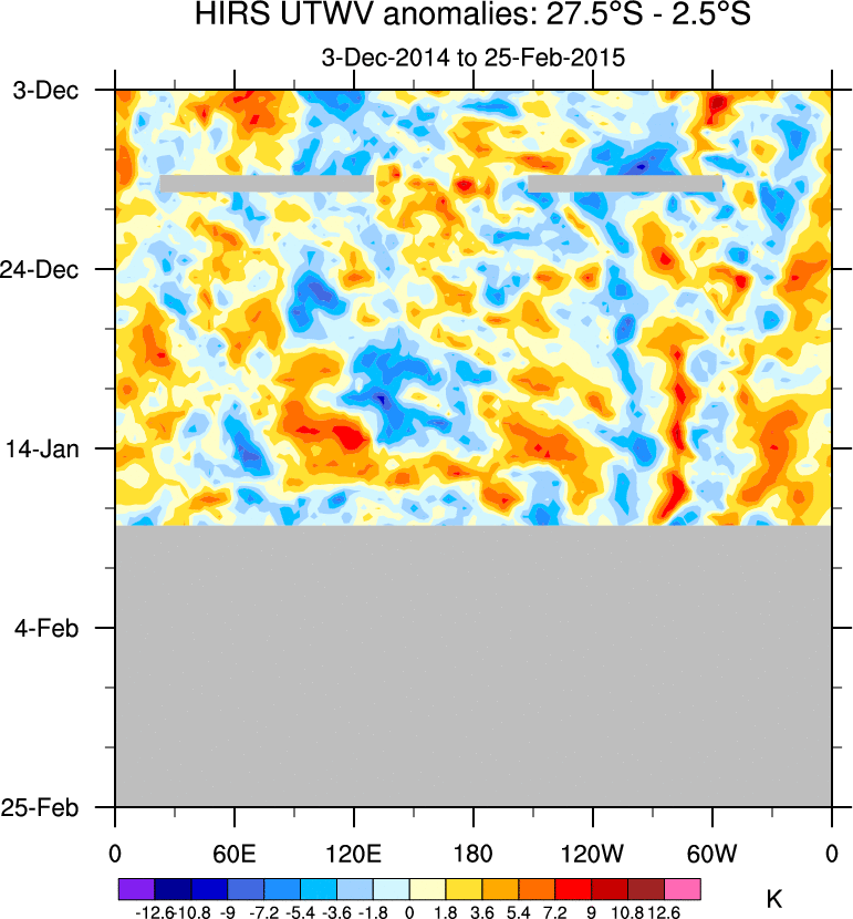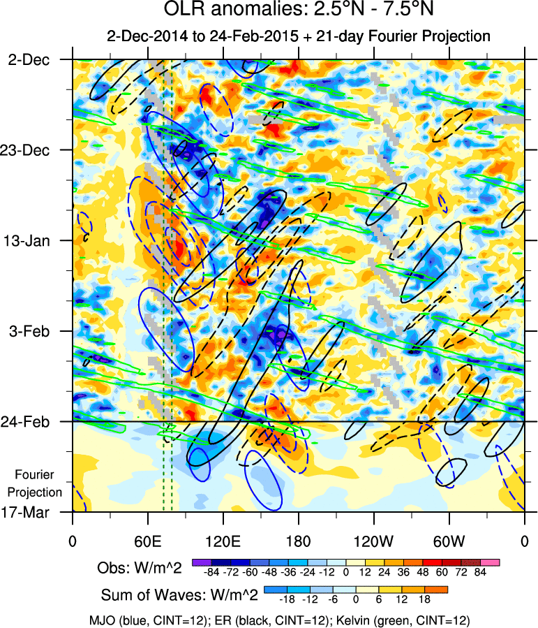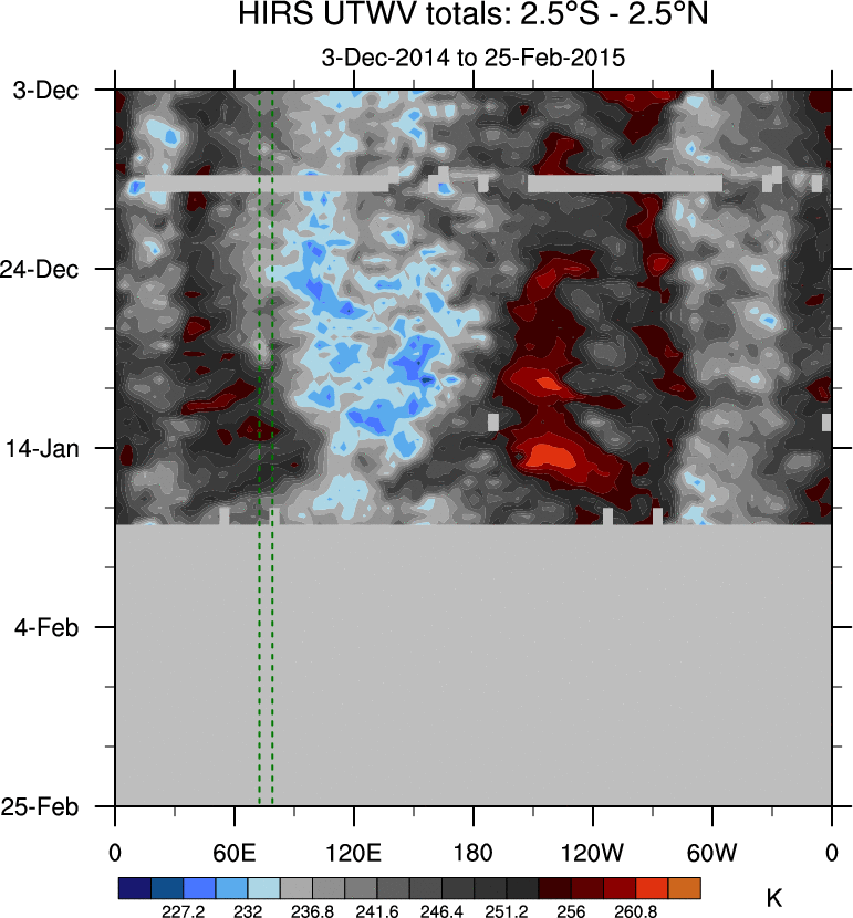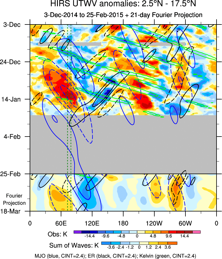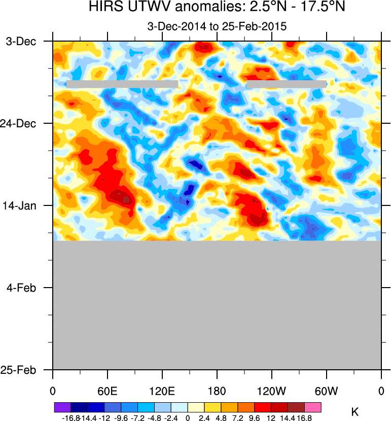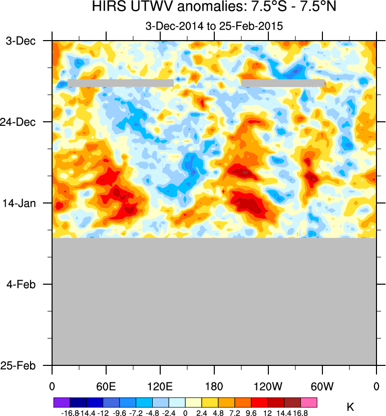 To identify tropical waves in near real-time, the OLR and UTWV data are filtered following Wheeler & Weickmann (2001 MWR). The daily anomalies are calculated using the first 3 harmonics of the seasonal cycle for 1979–2009. Missing values are then filled using linear interpolation in space and time. The most recent 365 days of anomalies are padded with 659 days of zeroes, and the result is filtered for each wave type.
