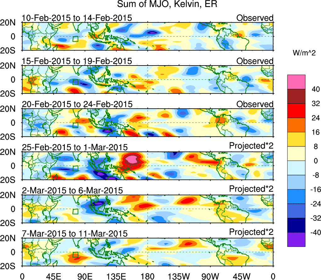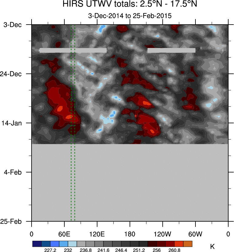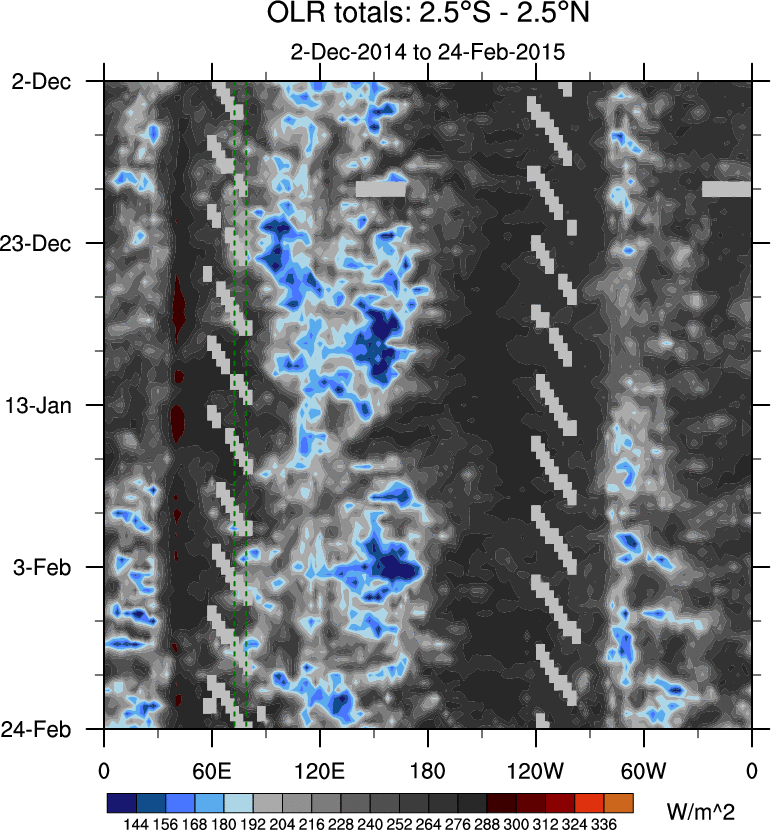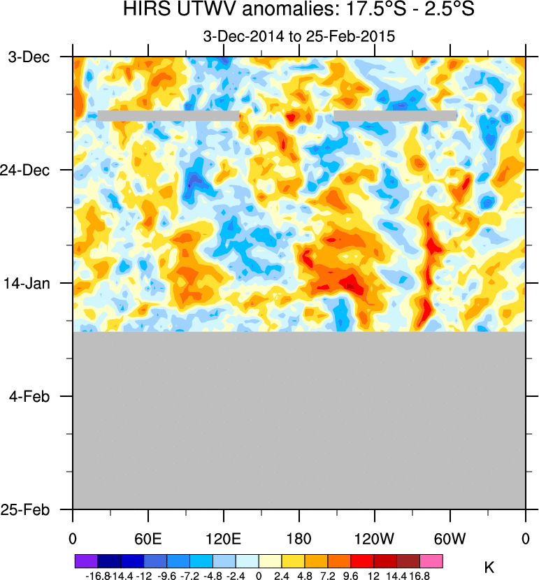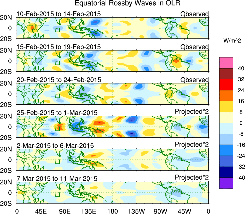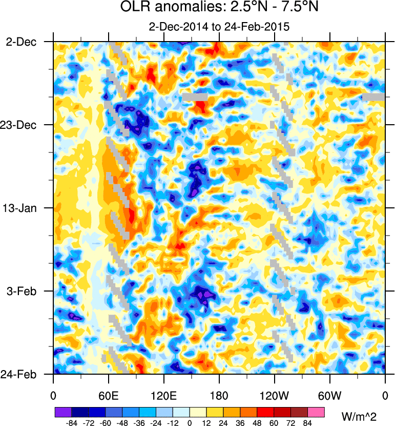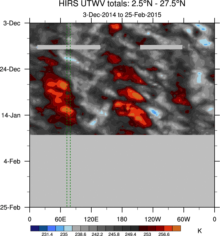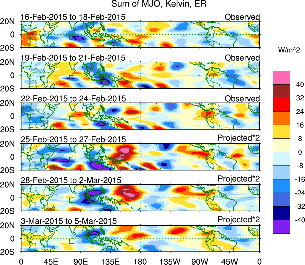 To identify tropical waves in near real-time, the OLR and UTWV data are filtered following Wheeler & Weickmann (2001 MWR). The daily anomalies are calculated using the first 3 harmonics of the seasonal cycle for 1979–2009. Missing values are then filled using linear interpolation in space and time. The most recent 365 days of anomalies are padded with 659 days of zeroes, and the result is filtered for each wave type.