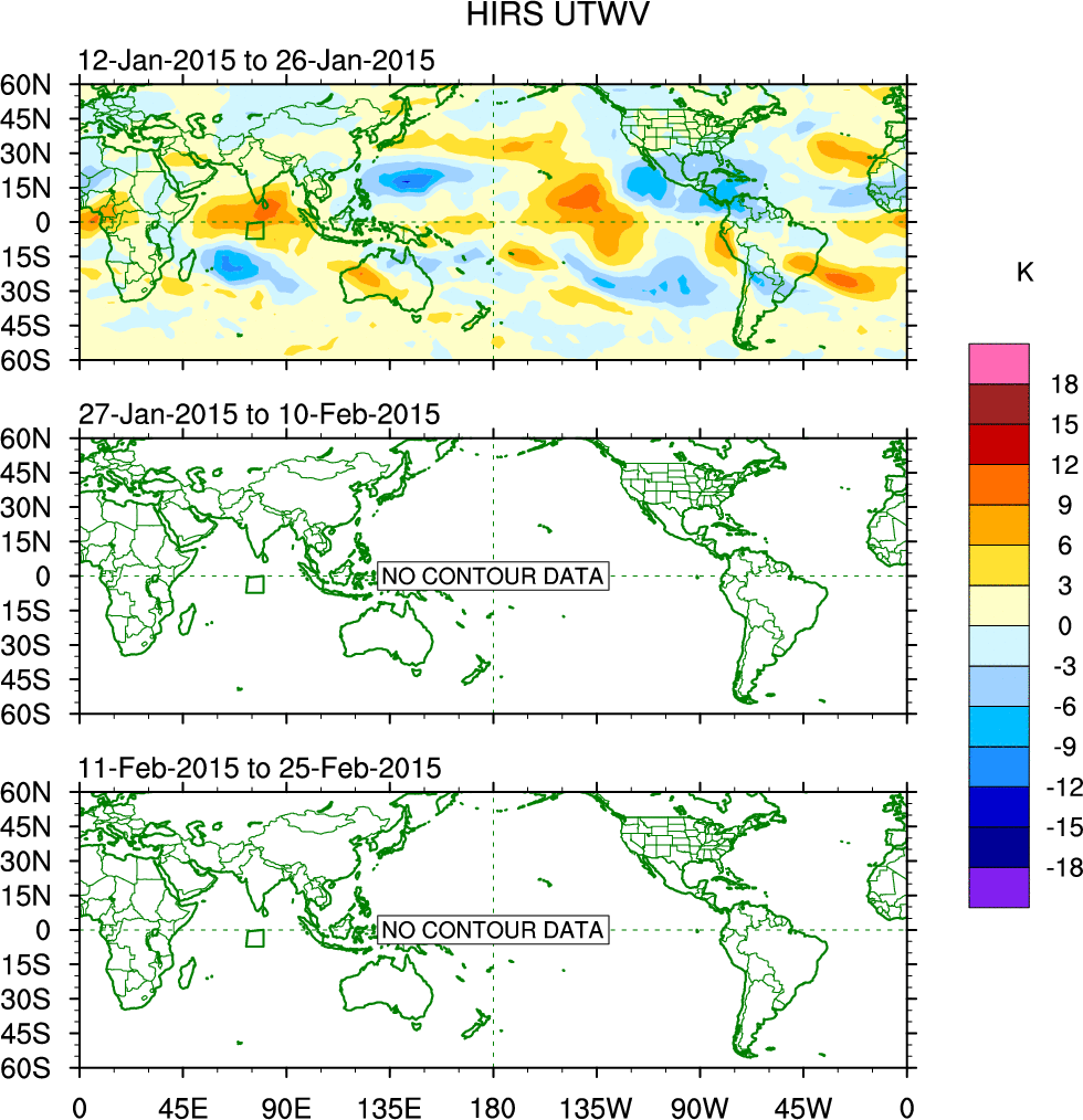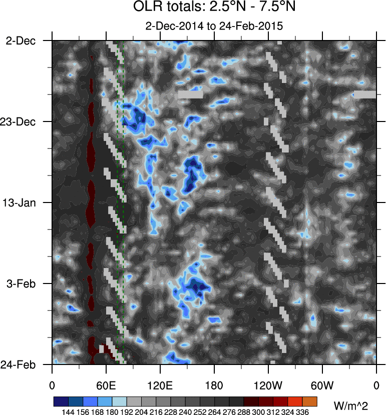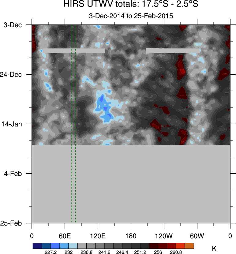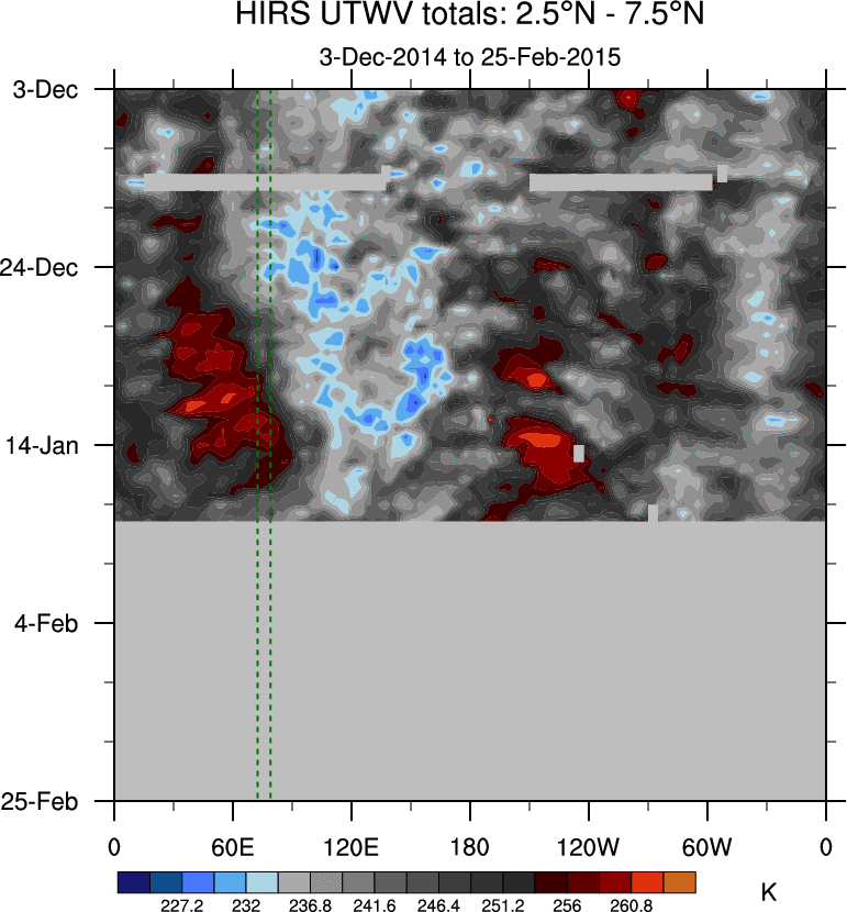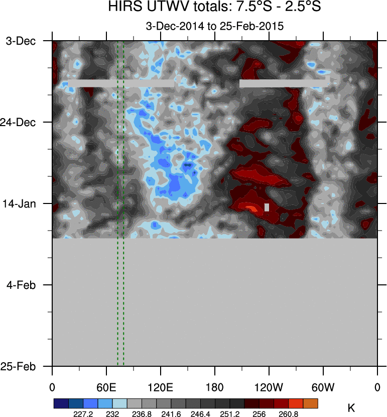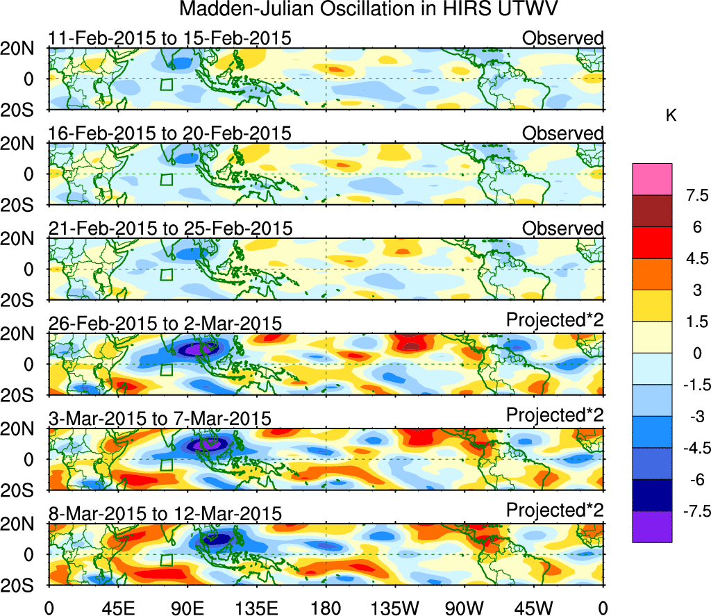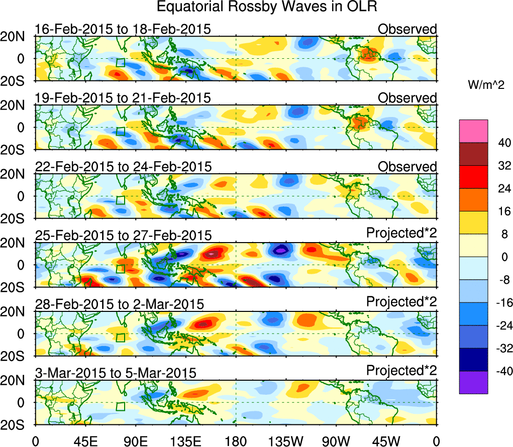 To identify tropical waves in near real-time, the OLR and UTWV data are filtered following Wheeler & Weickmann (2001 MWR). The daily anomalies are calculated using the first 3 harmonics of the seasonal cycle for 1979–2009. Missing values are then filled using linear interpolation in space and time. The most recent 365 days of anomalies are padded with 659 days of zeroes, and the result is filtered for each wave type.