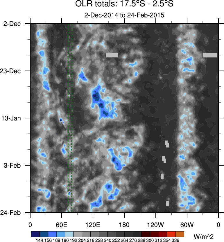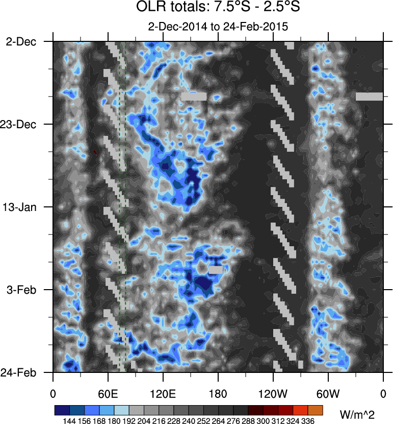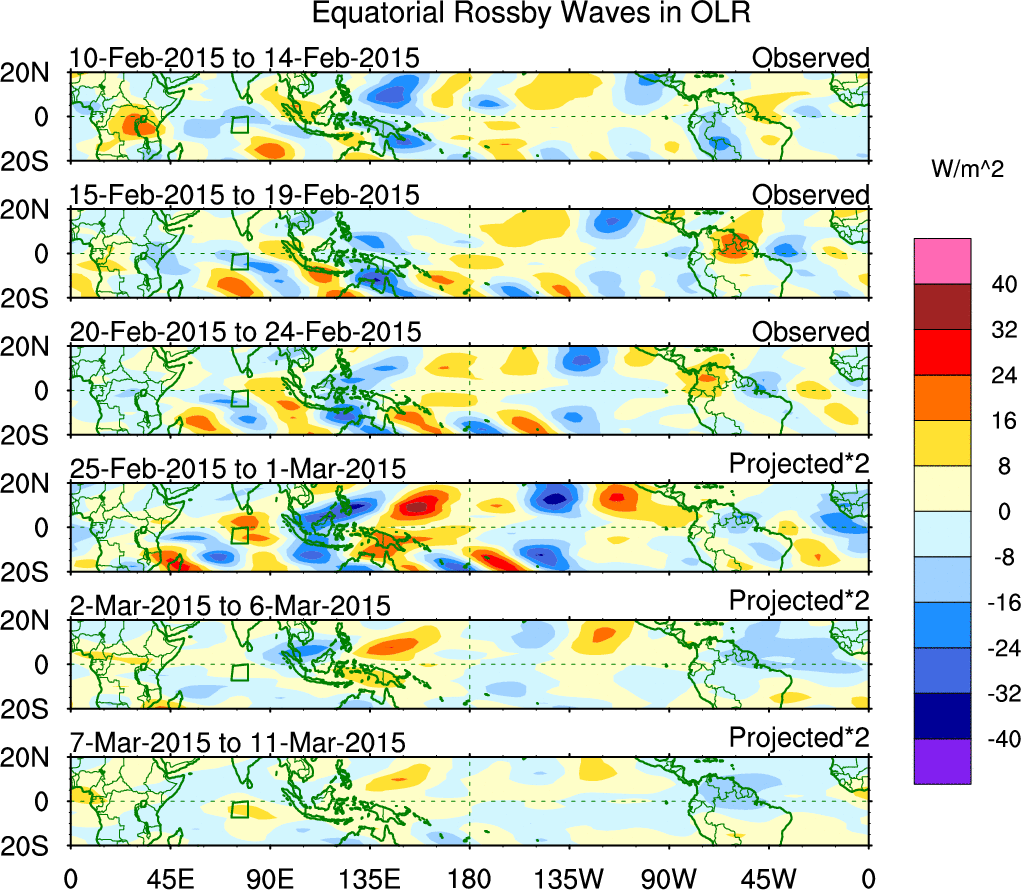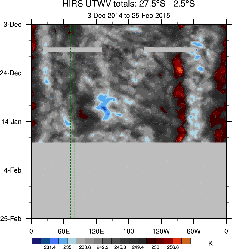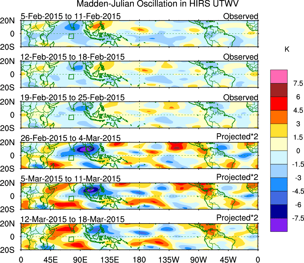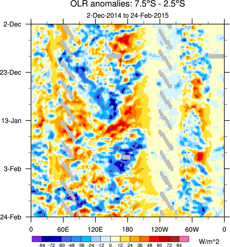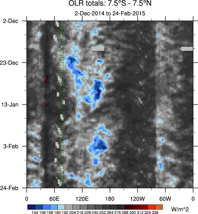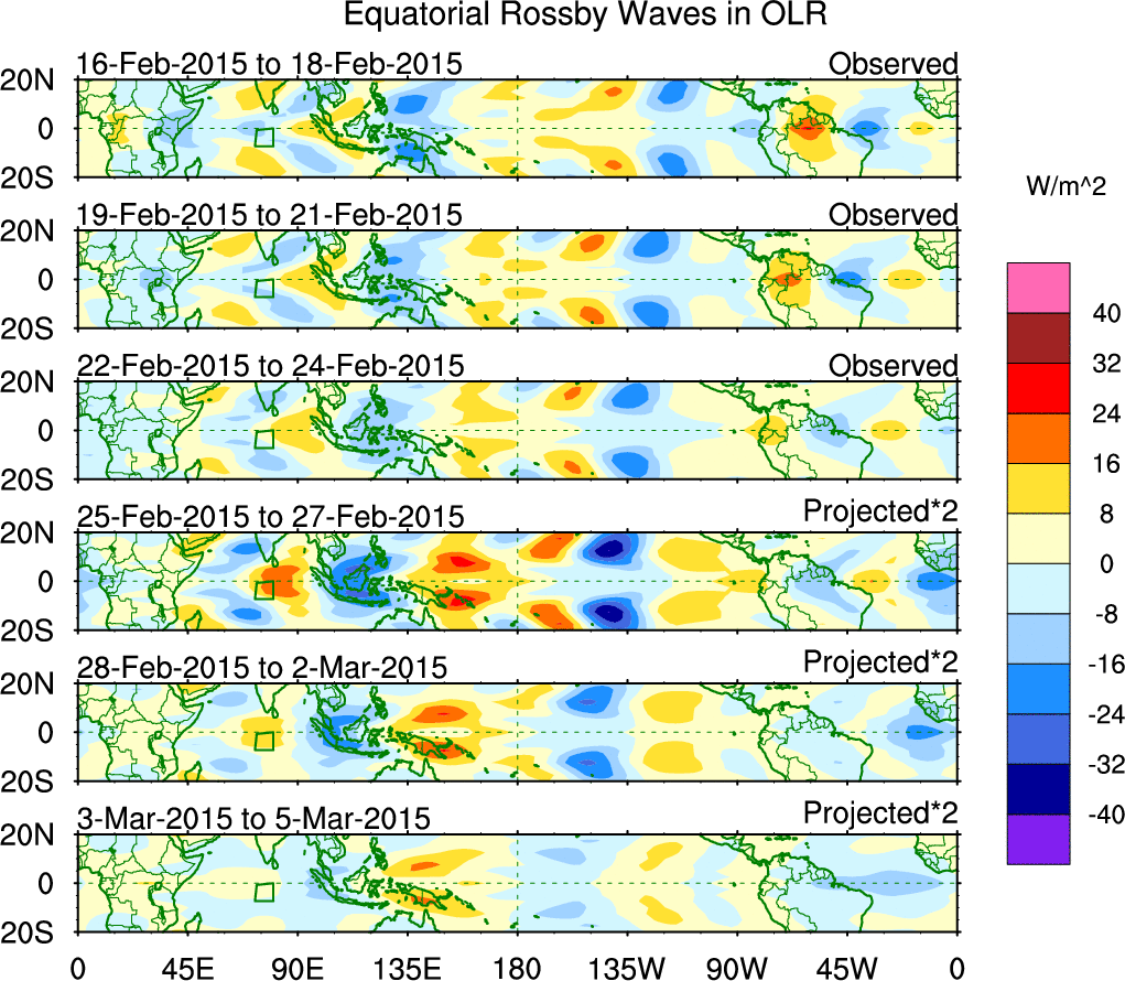 To identify tropical waves in near real-time, the OLR and UTWV data are filtered following Wheeler & Weickmann (2001 MWR). The daily anomalies are calculated using the first 3 harmonics of the seasonal cycle for 1979–2009. Missing values are then filled using linear interpolation in space and time. The most recent 365 days of anomalies are padded with 659 days of zeroes, and the result is filtered for each wave type.