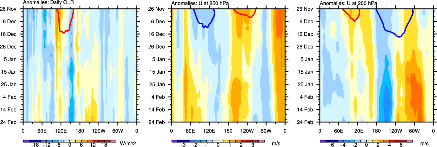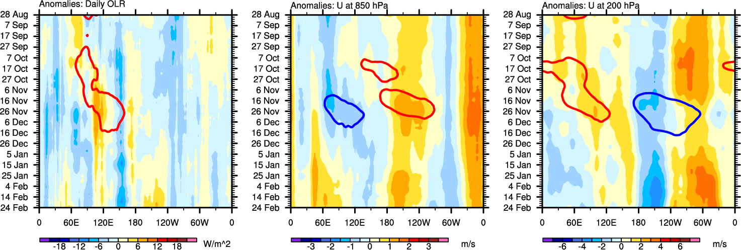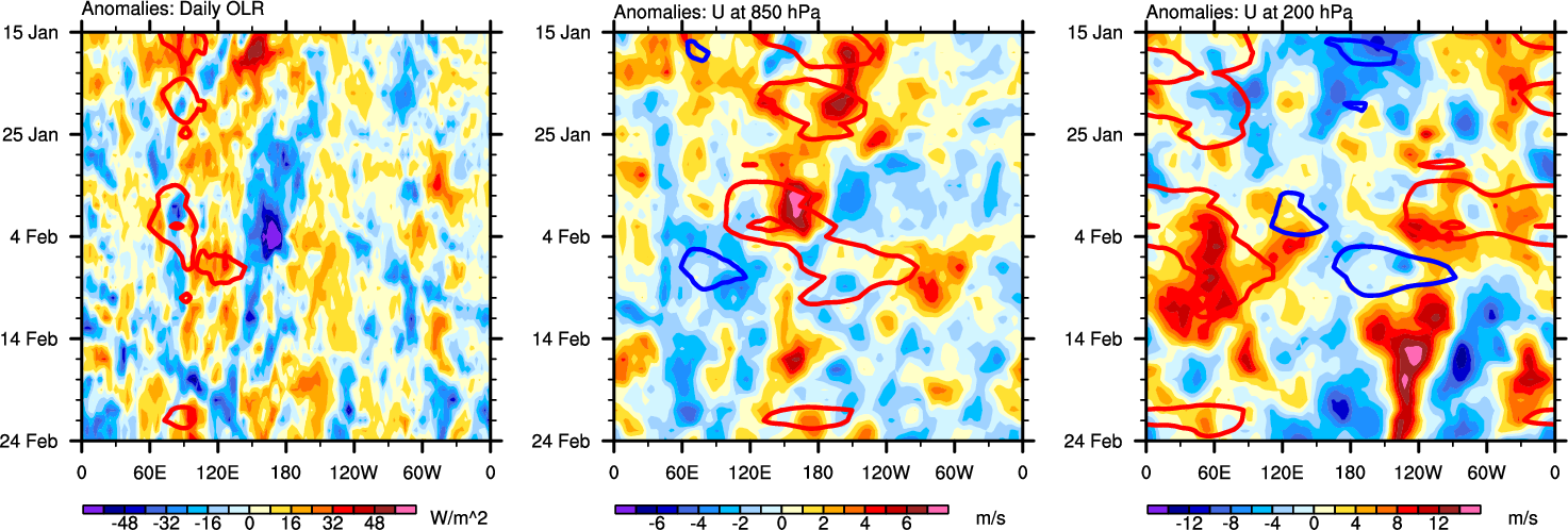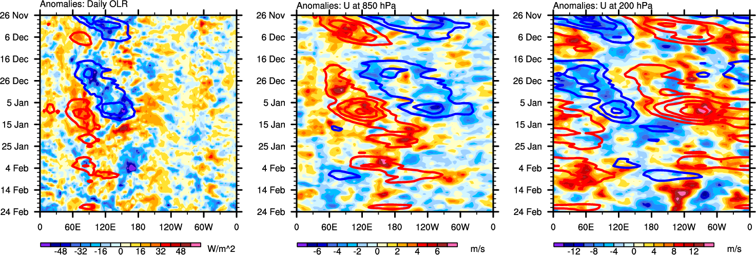 The Hovmöllers show longitude-time plots for OLR, U-850, and U-200. The shading indicates the observed anomalies, while the contours are the projection of those anomalies onto the RMM EOFs.