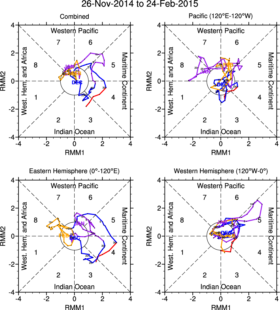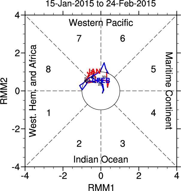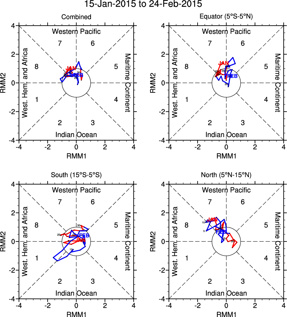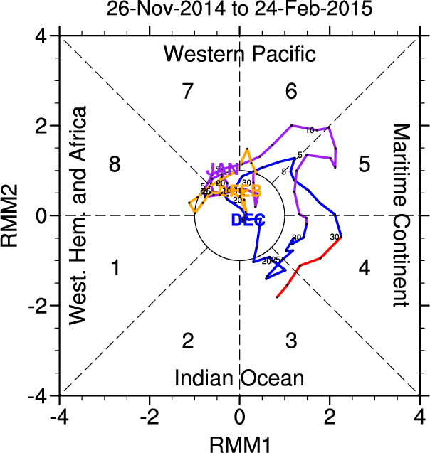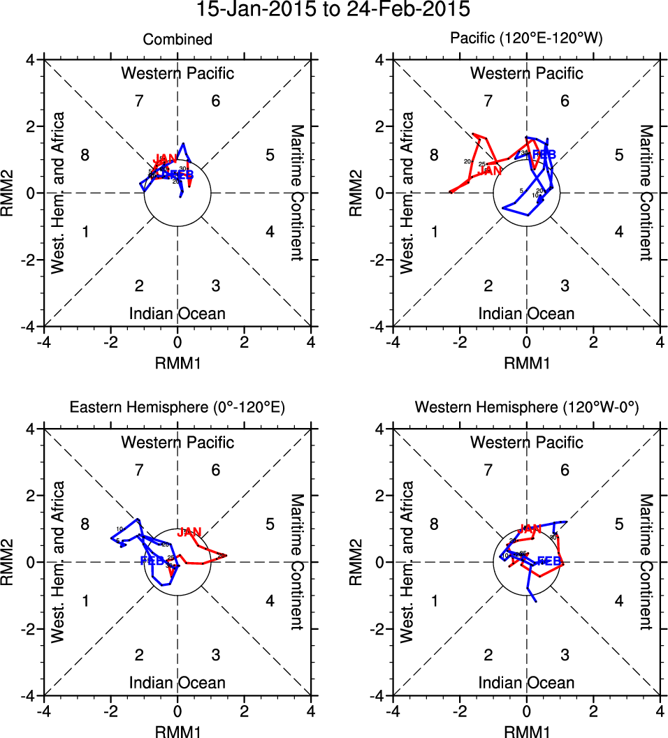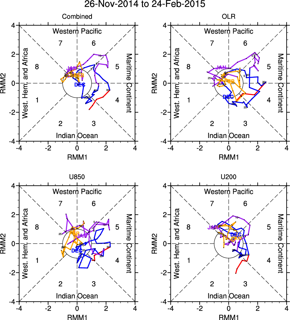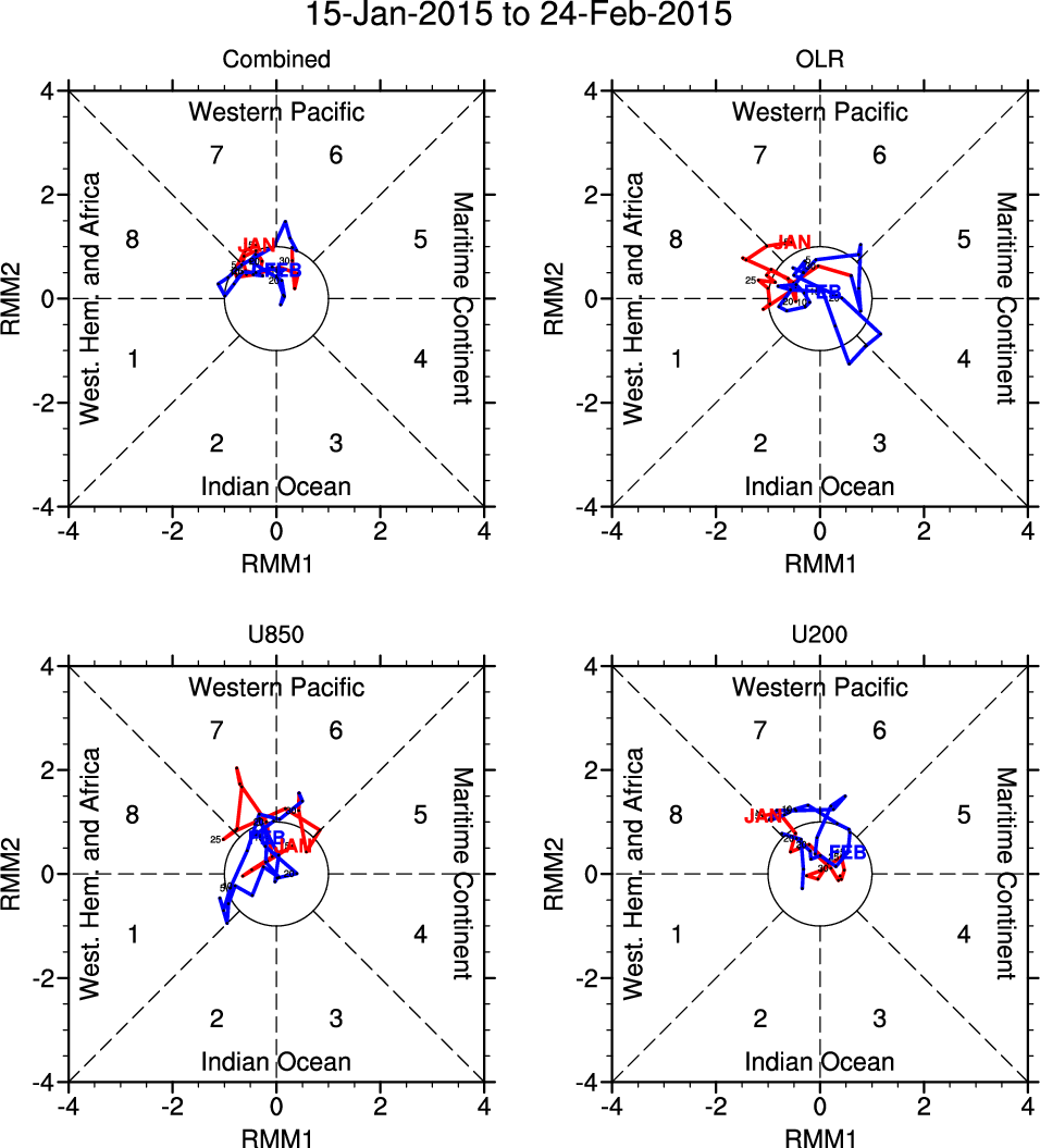 Wheeler and Hendon (2004) constructed the RMM index for monitoring the MJO. This index consists of the first two principal components (PCs) of OLR, 850-hPa zonal wind, and 200-hPa zonal wind averaged 15S-15N.