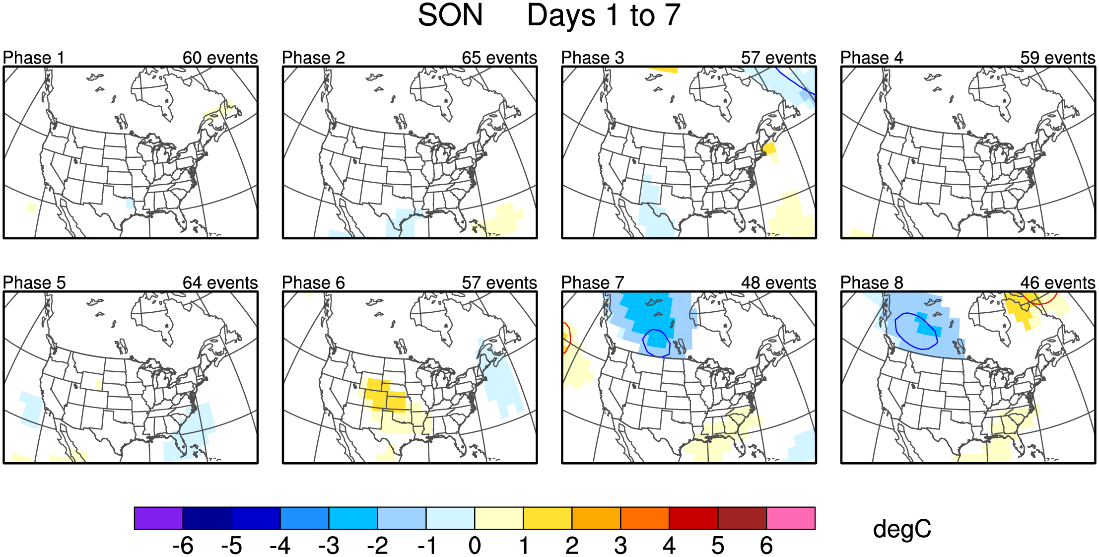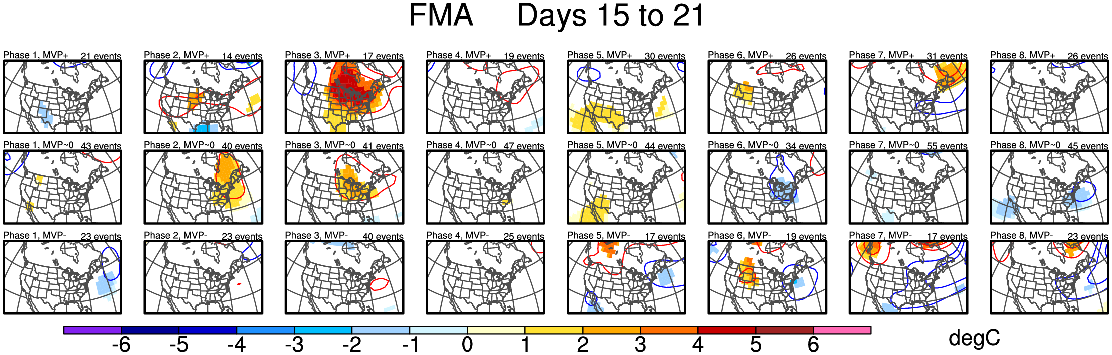Maps of 500-hPa geopotential height anomalies (contoured every 30 m) and significant 850-hPa temperature anomalies, as shown in Schreck et al. (2013).