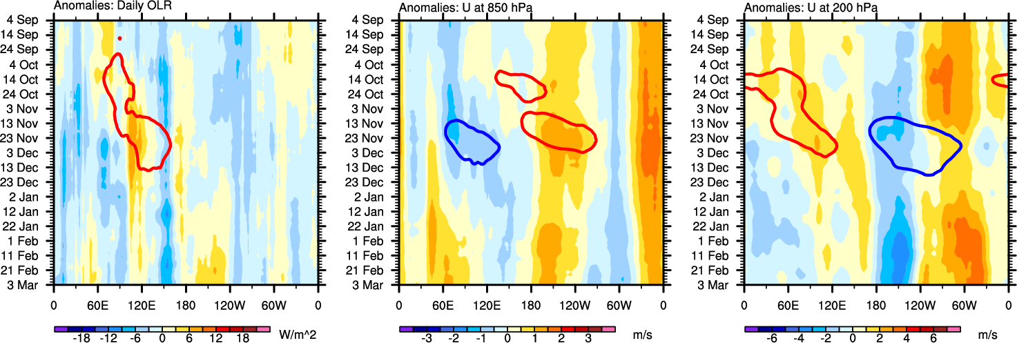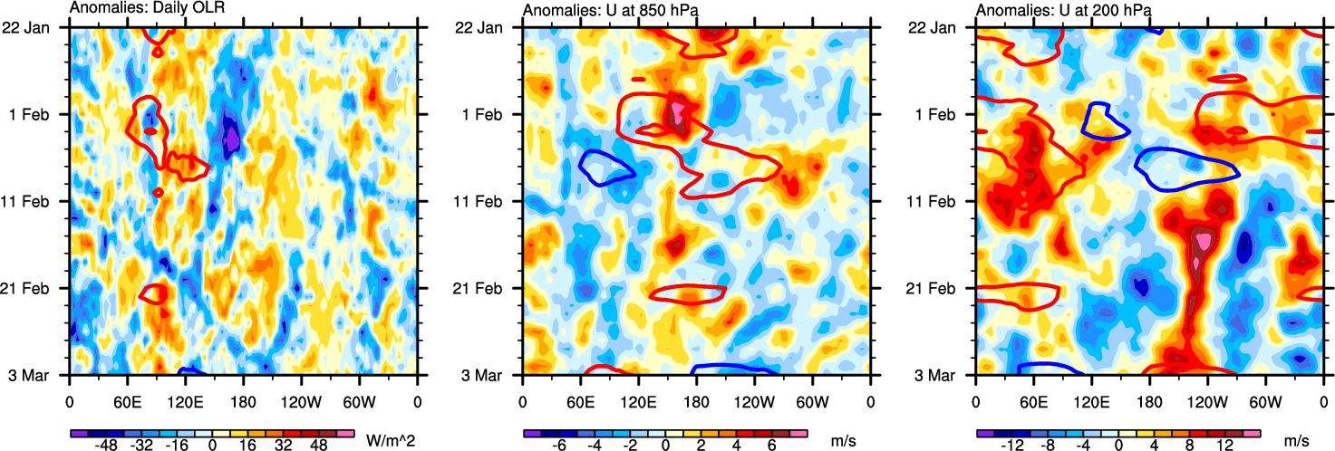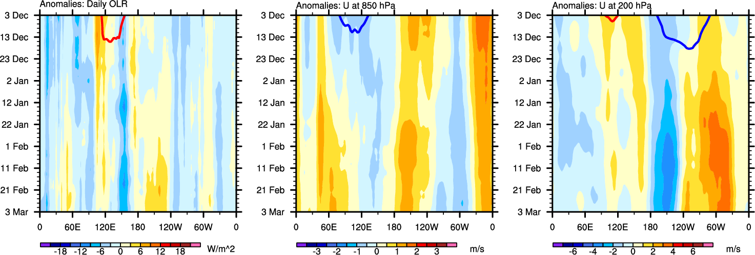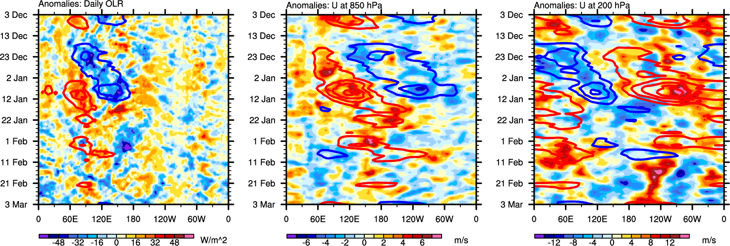 The Hovmöllers show longitude-time plots for OLR, U-850, and U-200. The shading indicates the observed anomalies, while the contours are the projection of those anomalies onto the RMM EOFs.