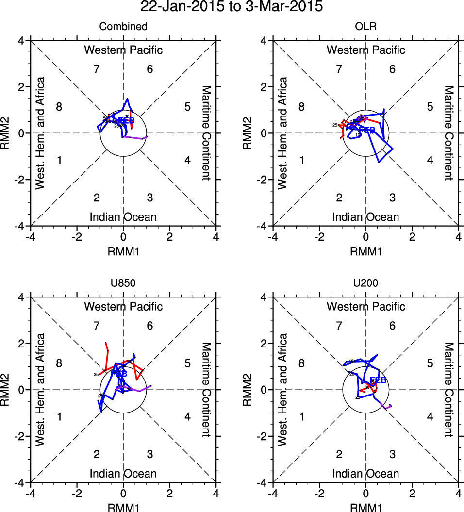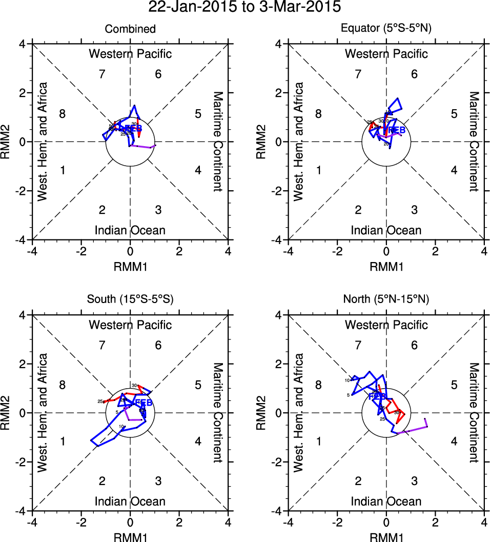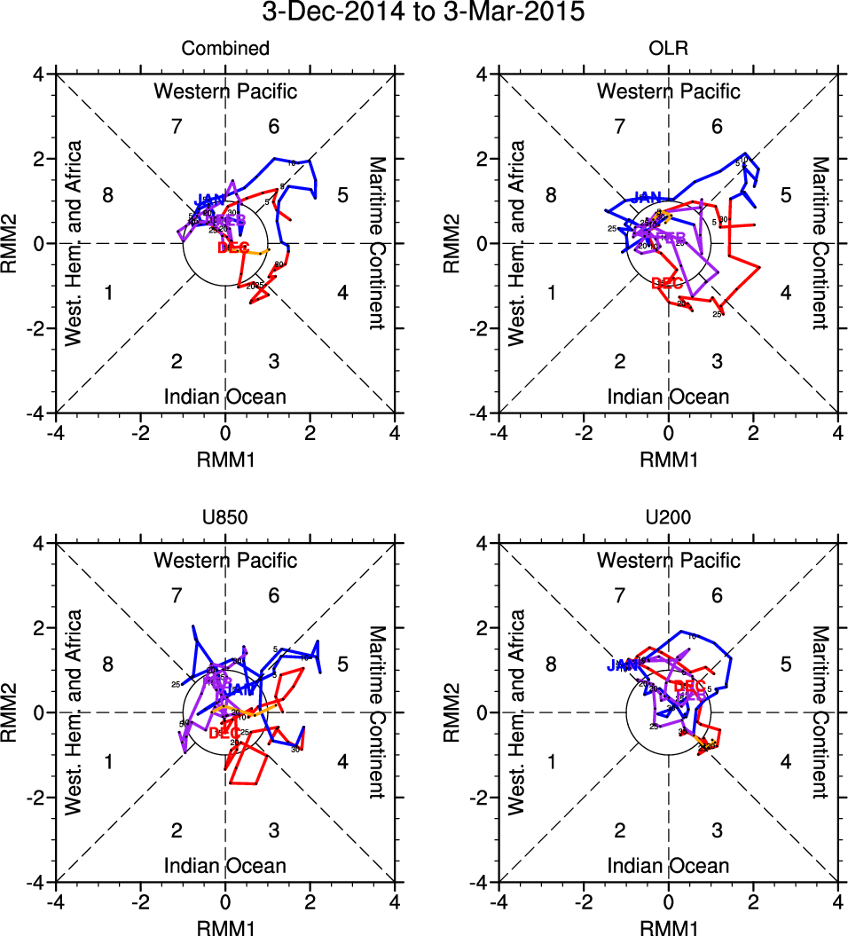 Wheeler and Hendon (2004) constructed the RMM index for monitoring the MJO. This index consists of the first two principal components (PCs) of OLR, 850-hPa zonal wind, and 200-hPa zonal wind averaged 15S-15N.