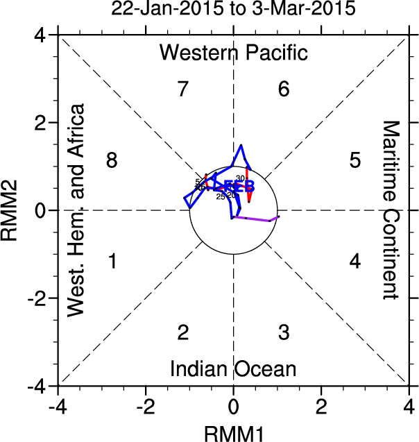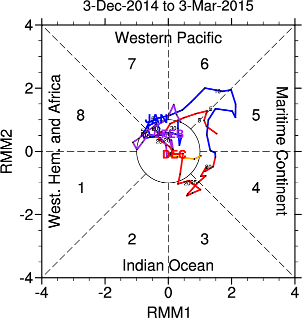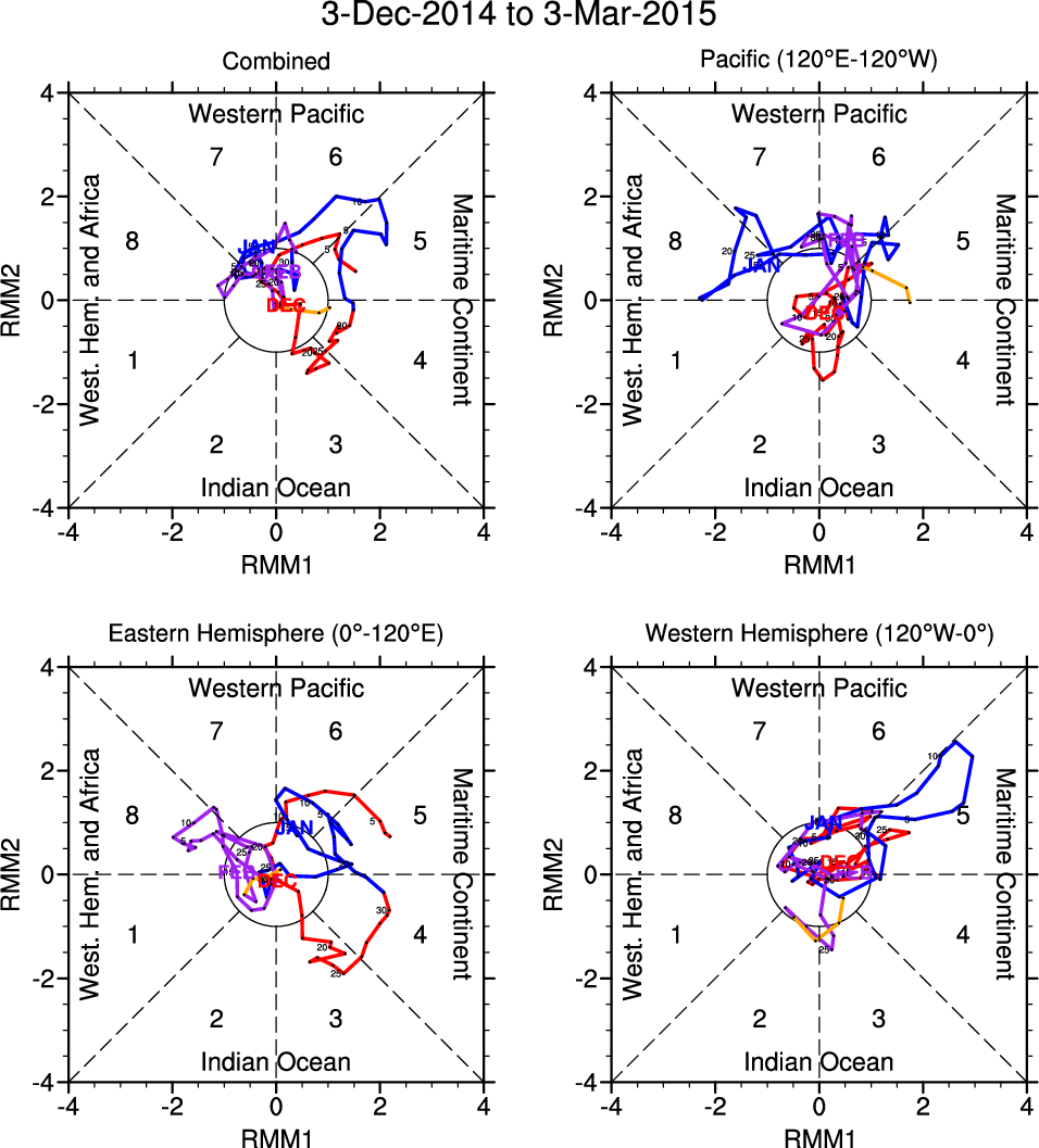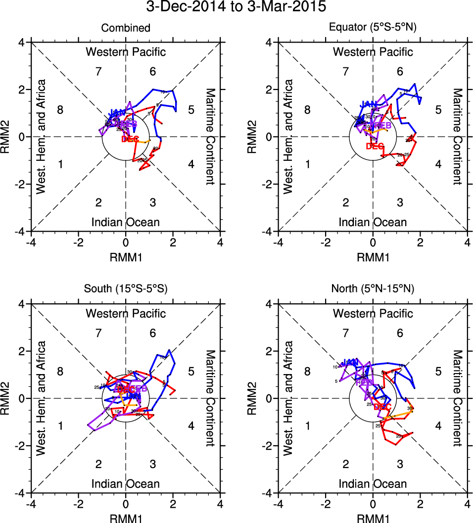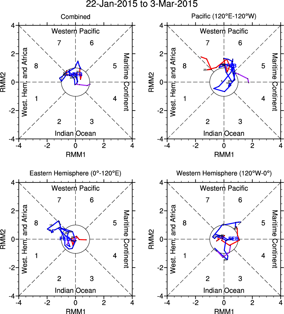 Wheeler and Hendon (2004) constructed the RMM index for monitoring the MJO. This index consists of the first two principal components (PCs) of OLR, 850-hPa zonal wind, and 200-hPa zonal wind averaged 15S-15N.
