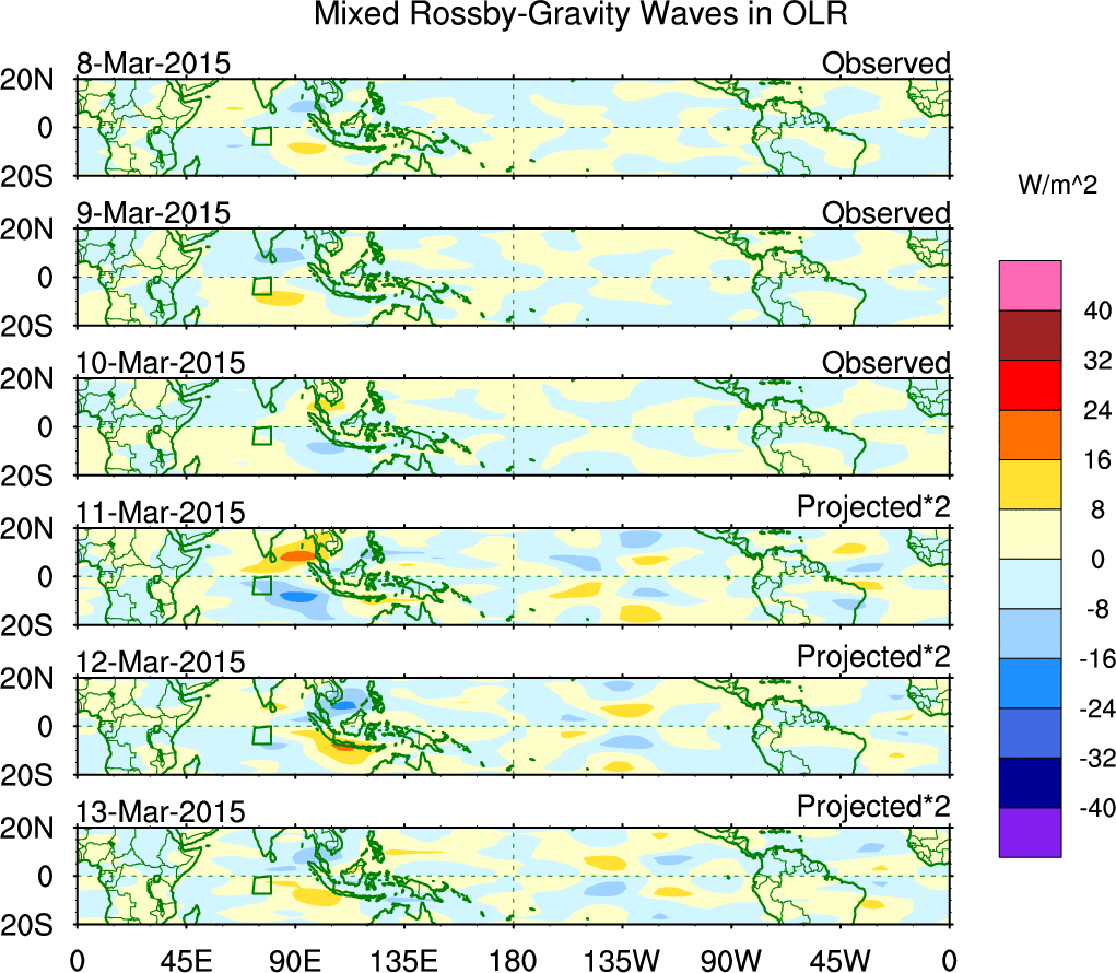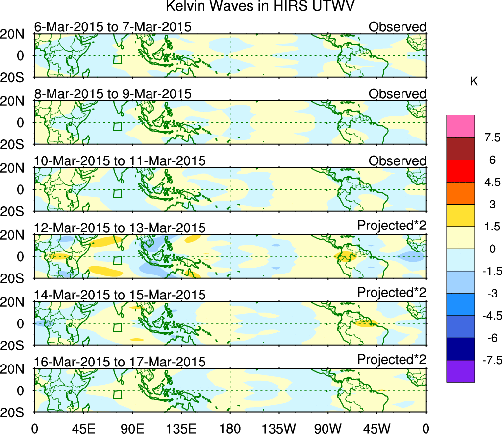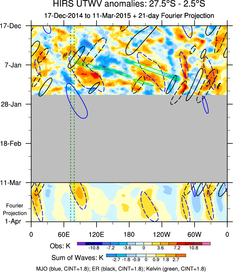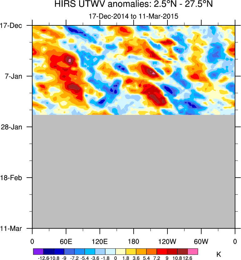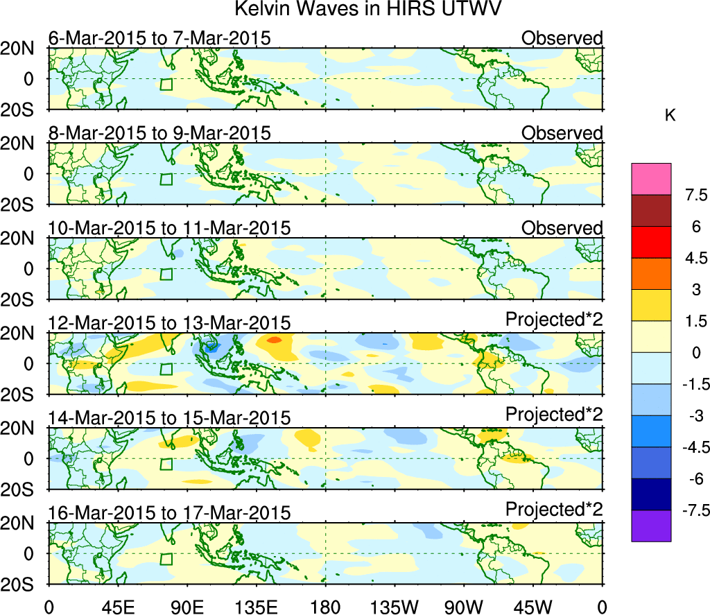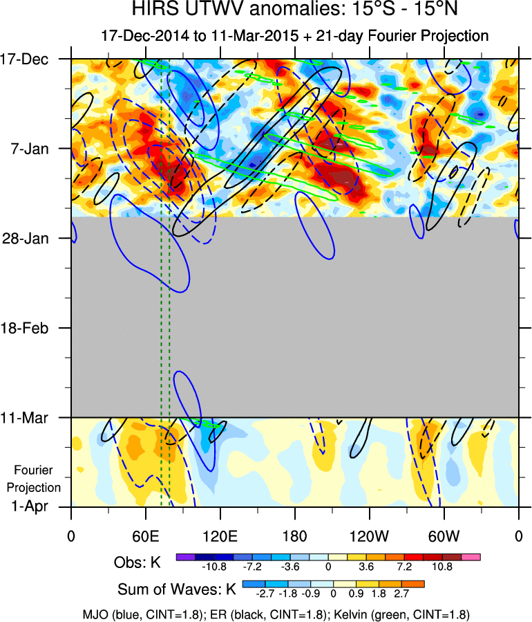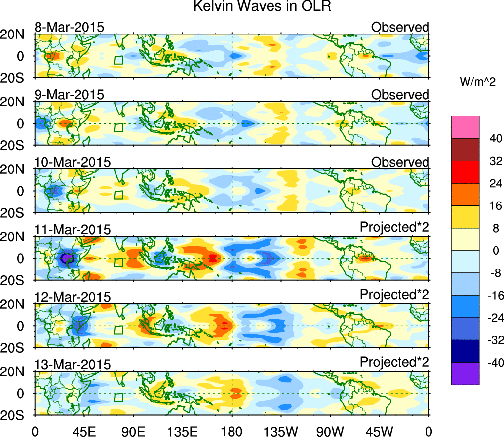 To identify tropical waves in near real-time, the OLR and UTWV data are filtered following Wheeler & Weickmann (2001 MWR). The daily anomalies are calculated using the first 3 harmonics of the seasonal cycle for 1979–2009. Missing values are then filled using linear interpolation in space and time. The most recent 365 days of anomalies are padded with 659 days of zeroes, and the result is filtered for each wave type.