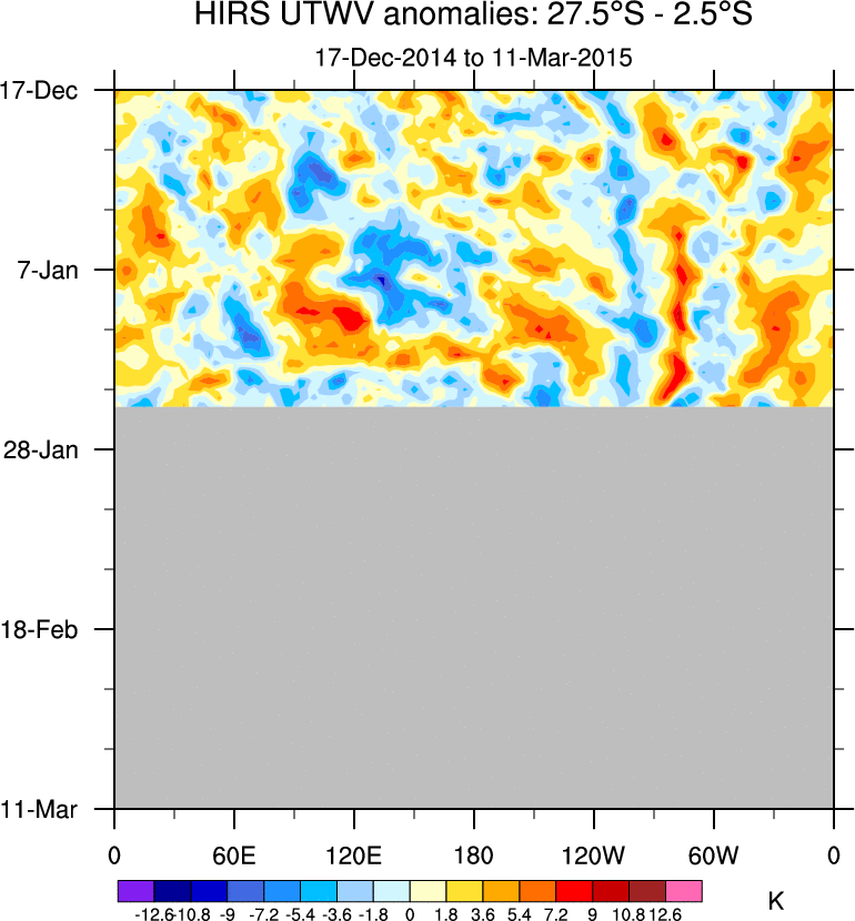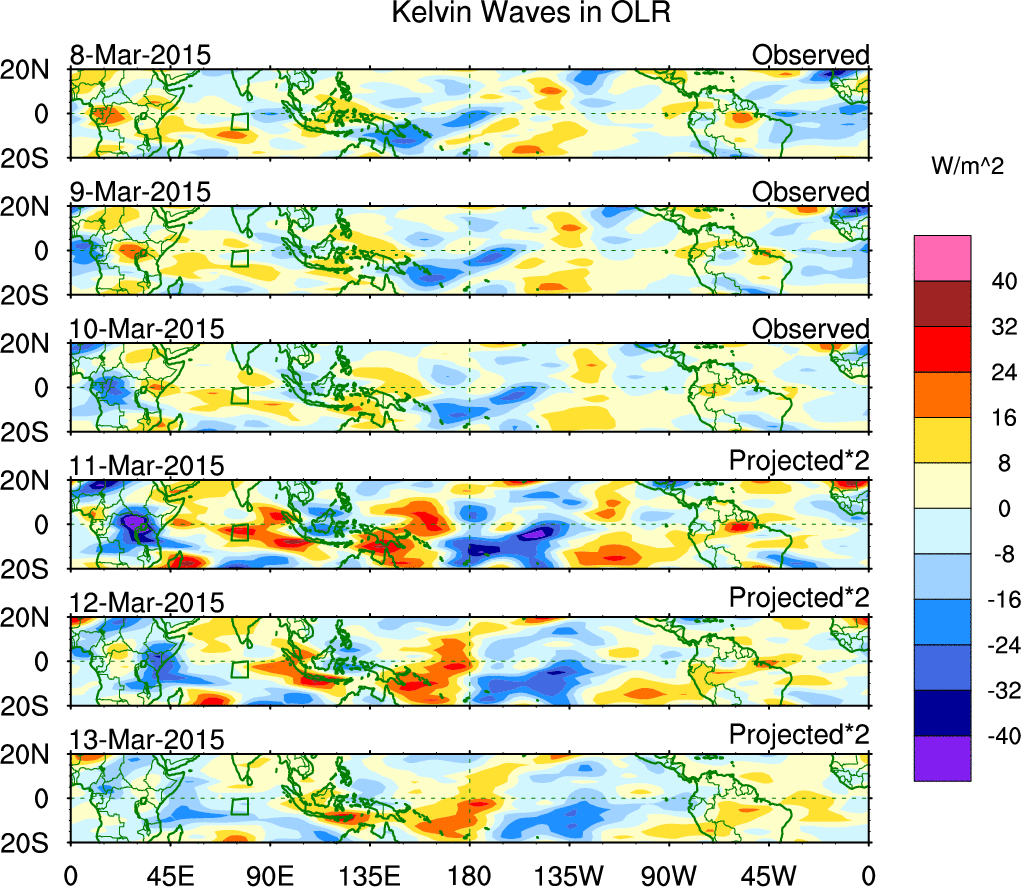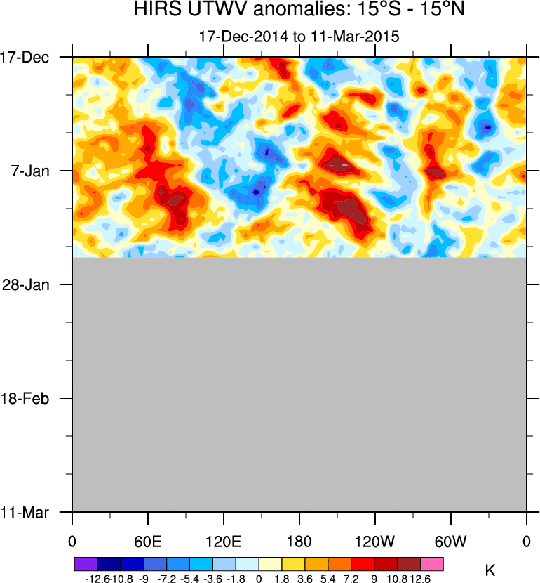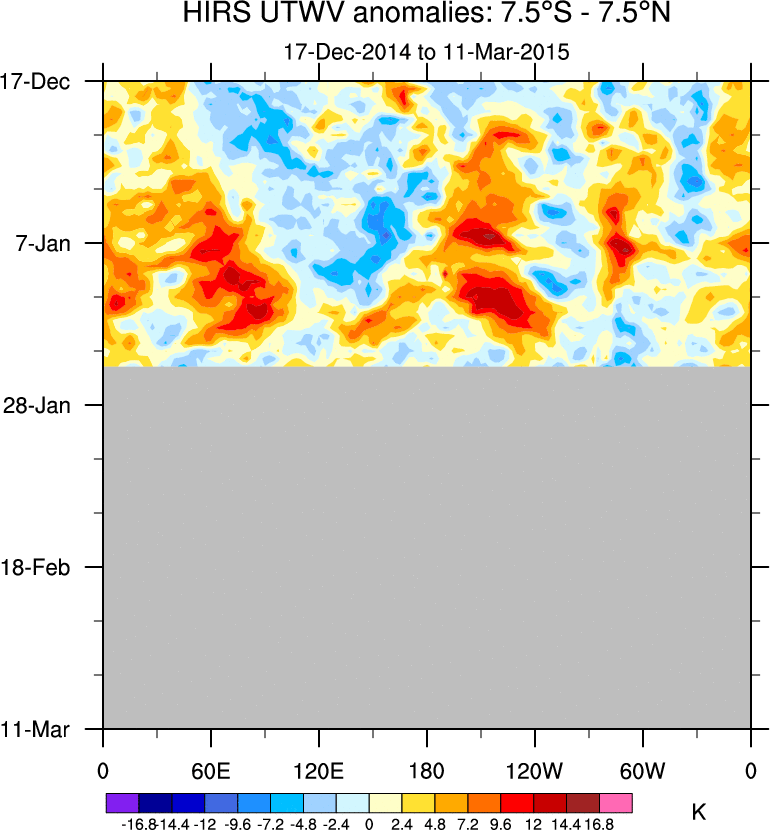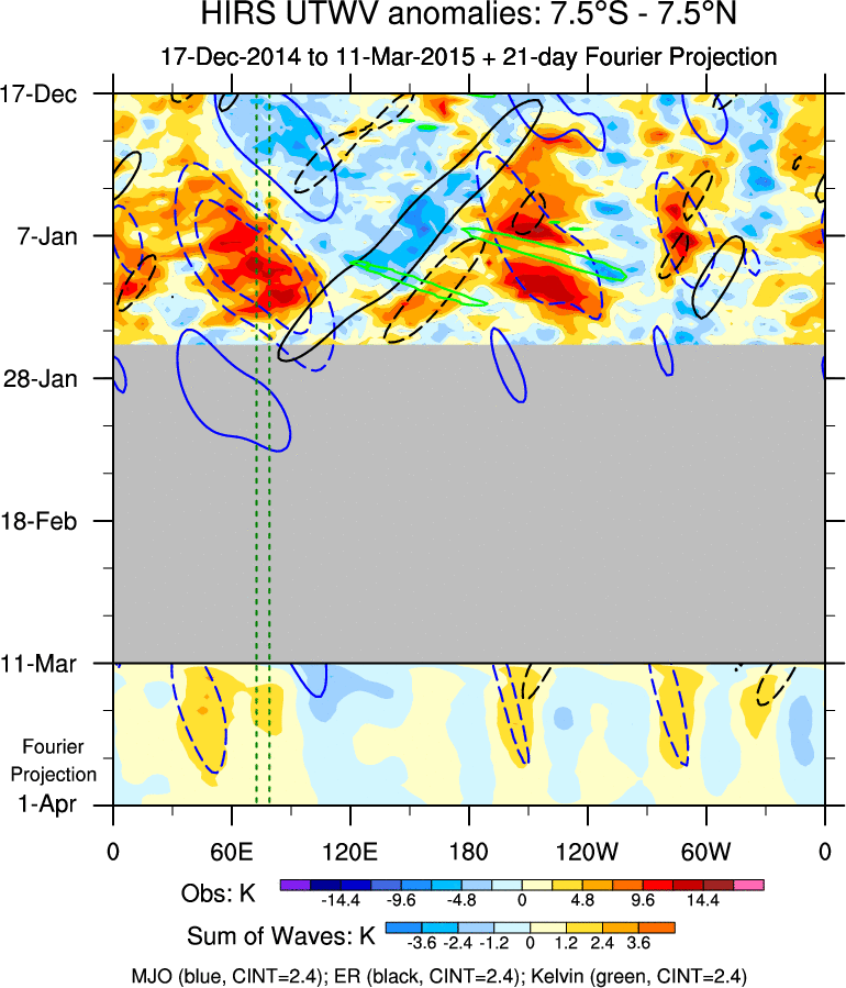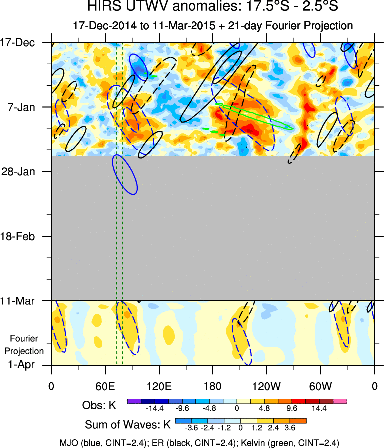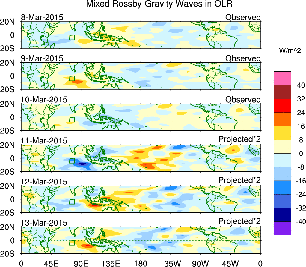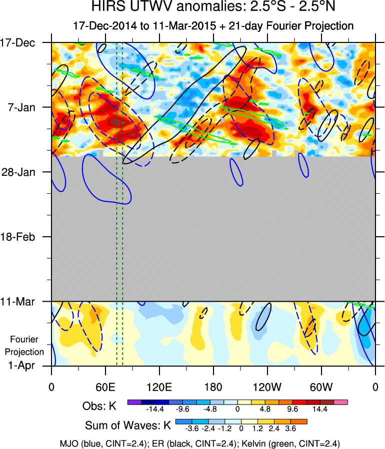To identify tropical waves in near real-time, the OLR and UTWV data are filtered following Wheeler & Weickmann (2001 MWR). The daily anomalies are calculated using the first 3 harmonics of the seasonal cycle for 1979–2009. Missing values are then filled using linear interpolation in space and time. The most recent 365 days of anomalies are padded with 659 days of zeroes, and the result is filtered for each wave type.