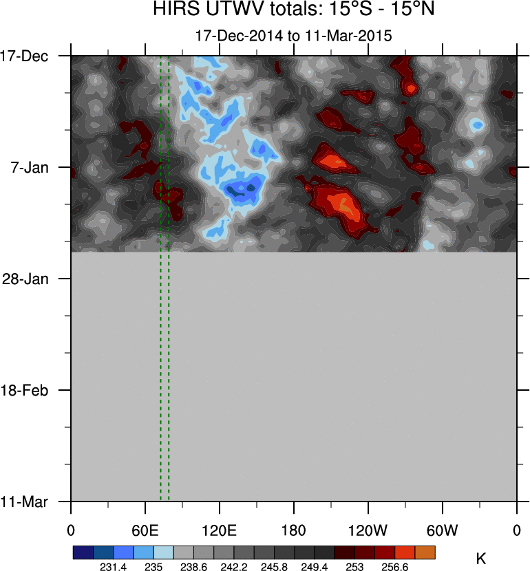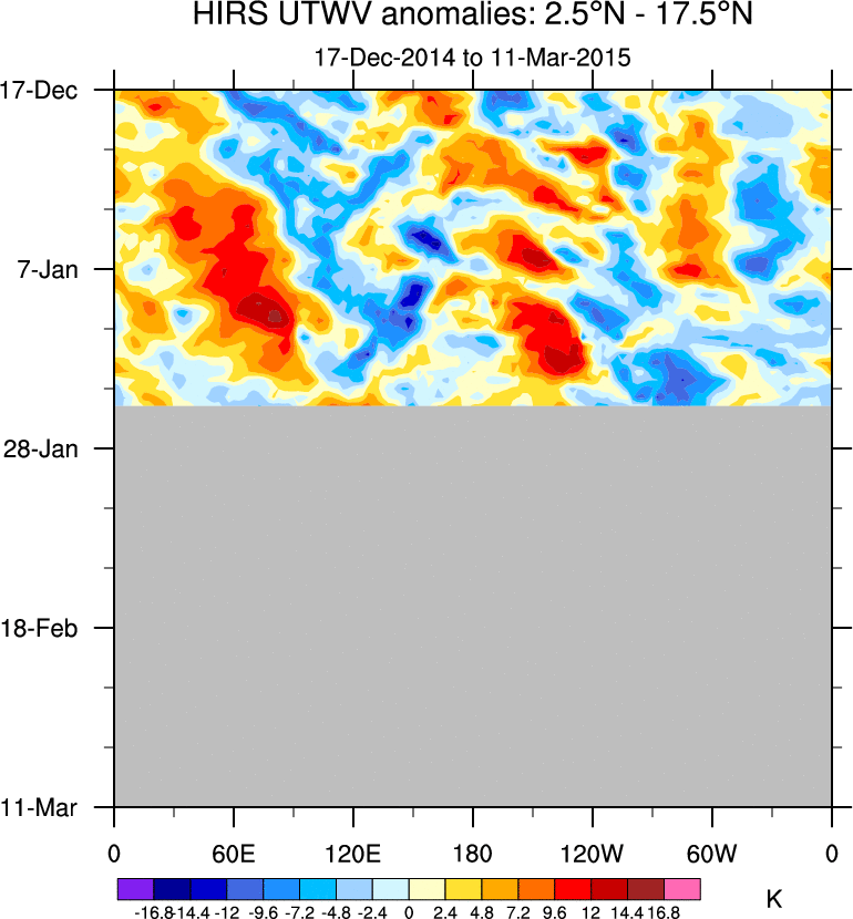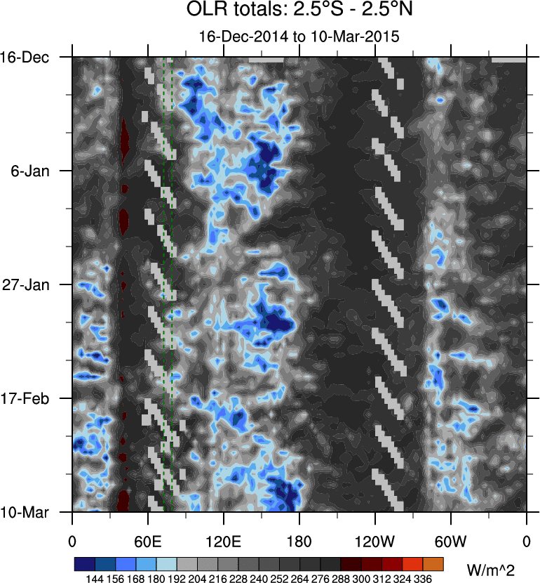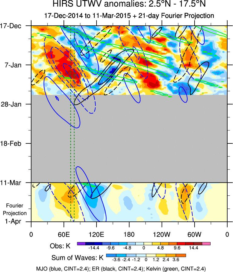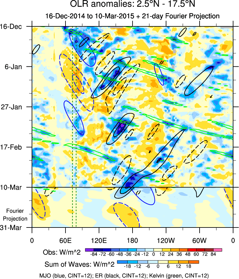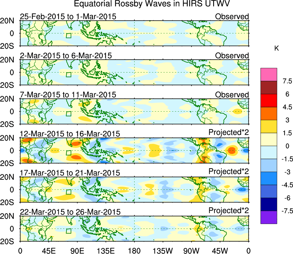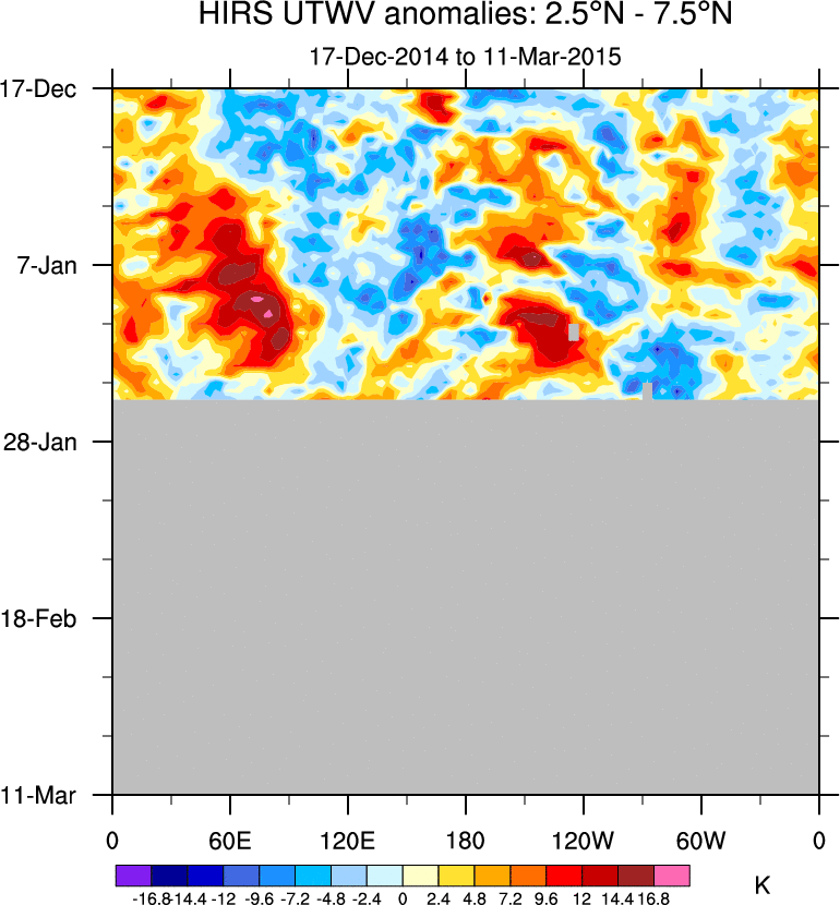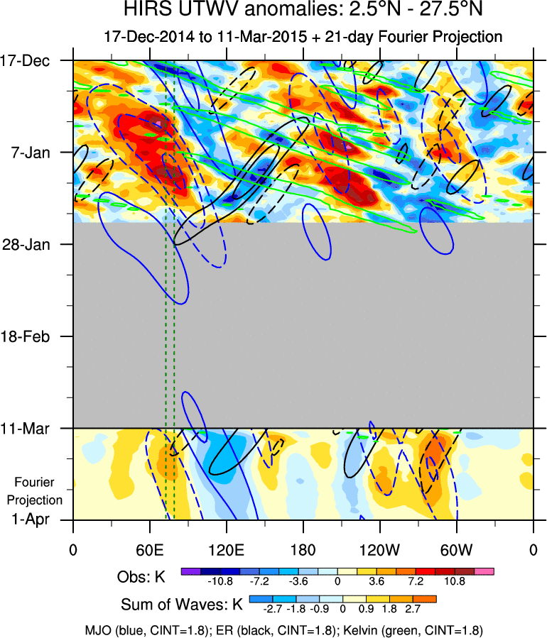 To identify tropical waves in near real-time, the OLR and UTWV data are filtered following Wheeler & Weickmann (2001 MWR). The daily anomalies are calculated using the first 3 harmonics of the seasonal cycle for 1979–2009. Missing values are then filled using linear interpolation in space and time. The most recent 365 days of anomalies are padded with 659 days of zeroes, and the result is filtered for each wave type.