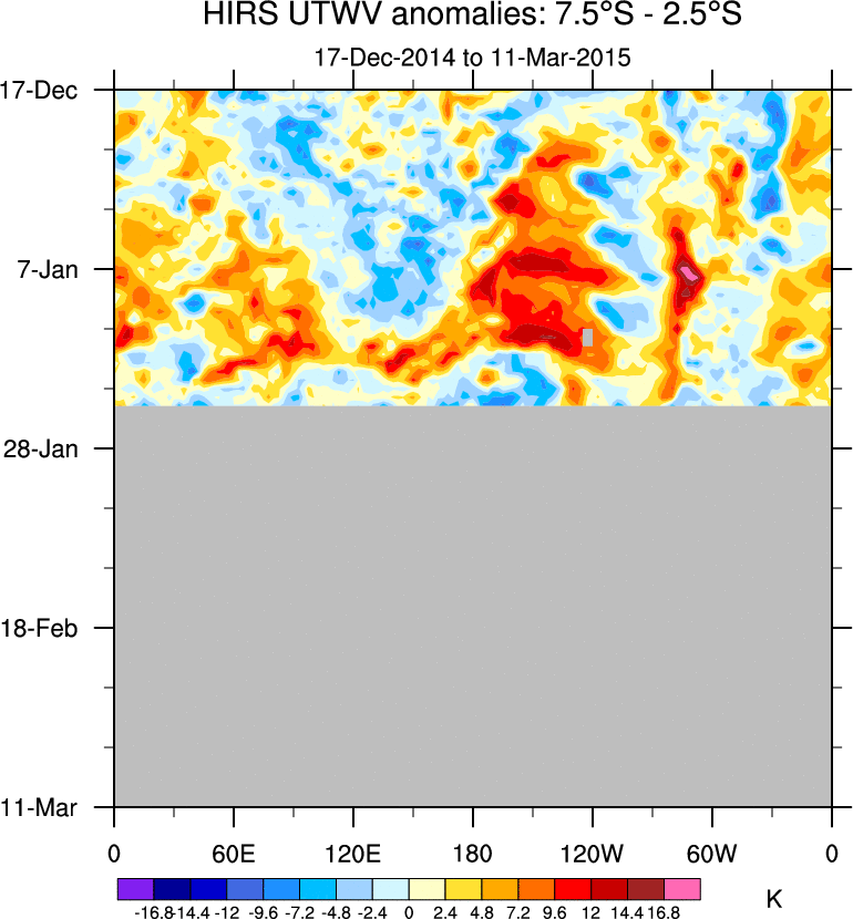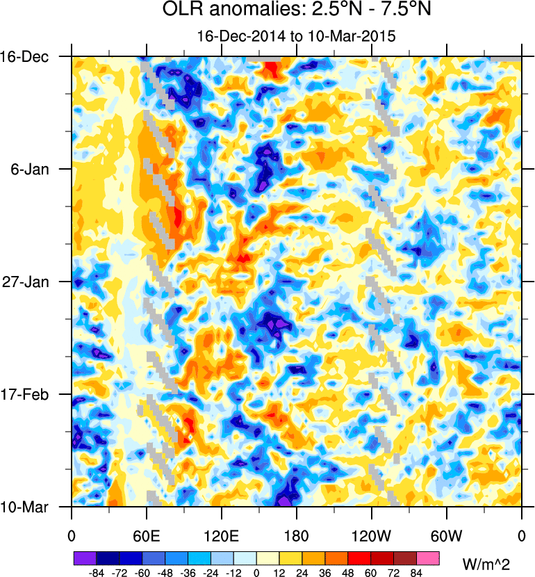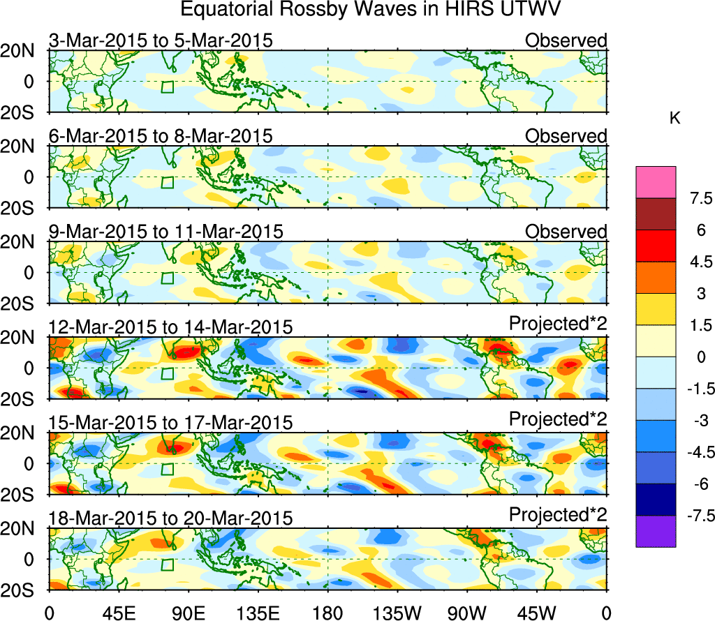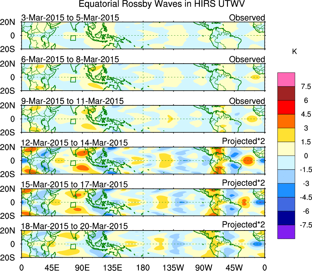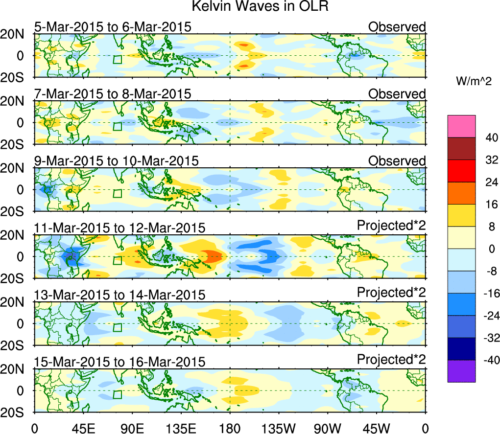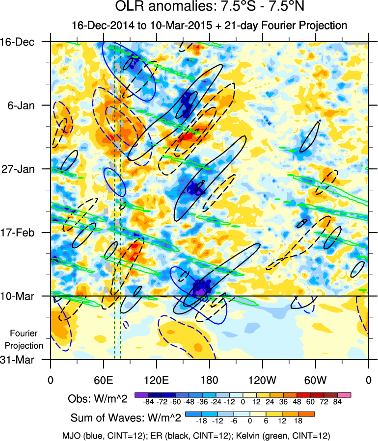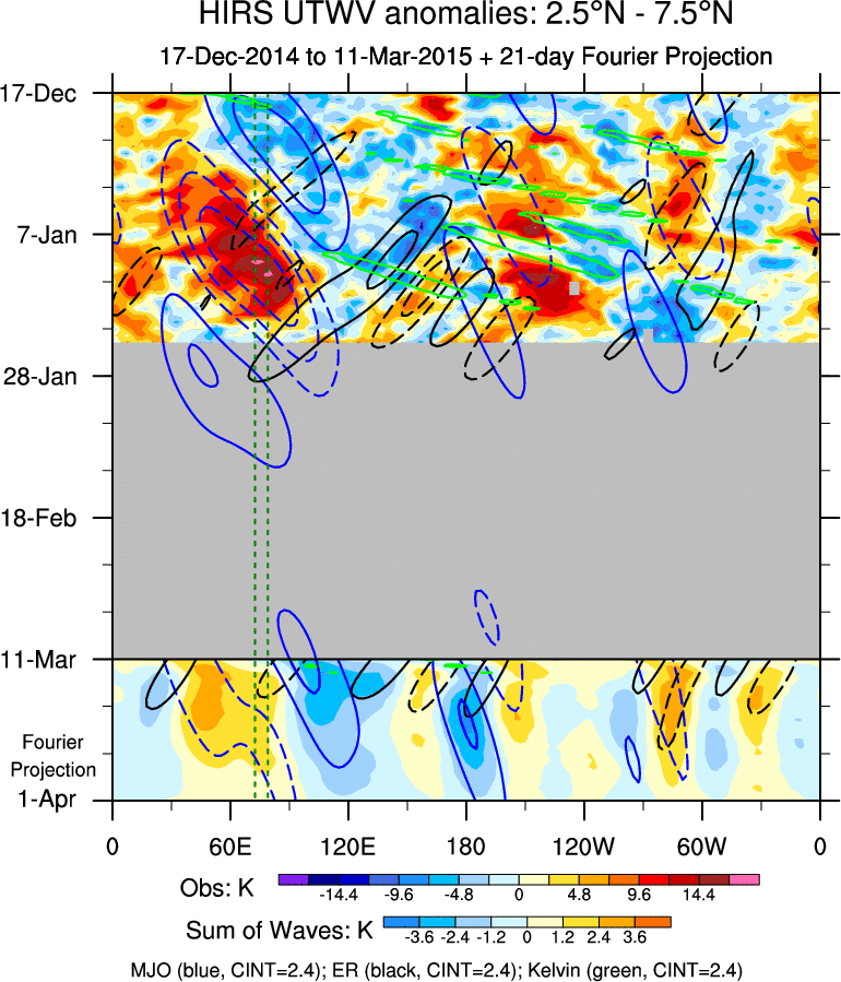 To identify tropical waves in near real-time, the OLR and UTWV data are filtered following Wheeler & Weickmann (2001 MWR). The daily anomalies are calculated using the first 3 harmonics of the seasonal cycle for 1979–2009. Missing values are then filled using linear interpolation in space and time. The most recent 365 days of anomalies are padded with 659 days of zeroes, and the result is filtered for each wave type.