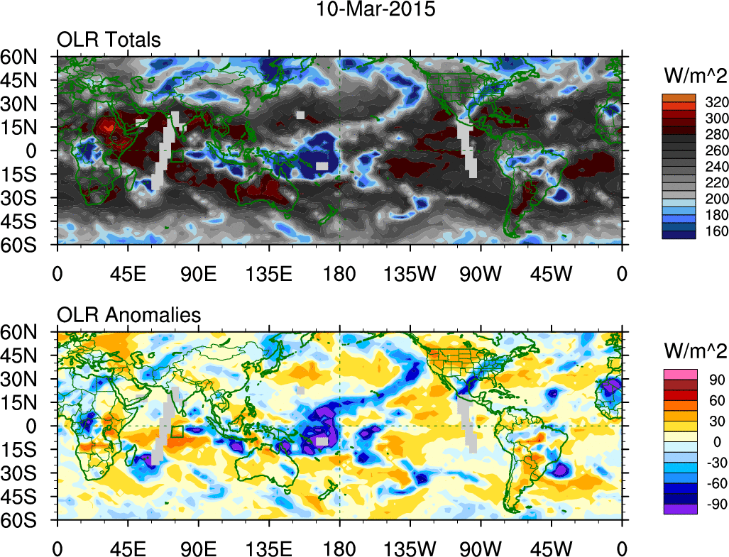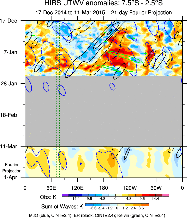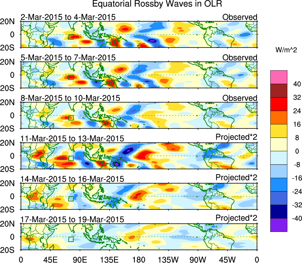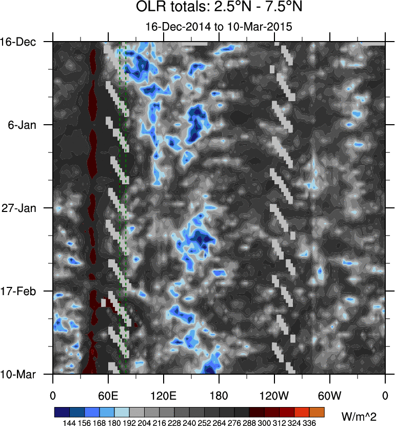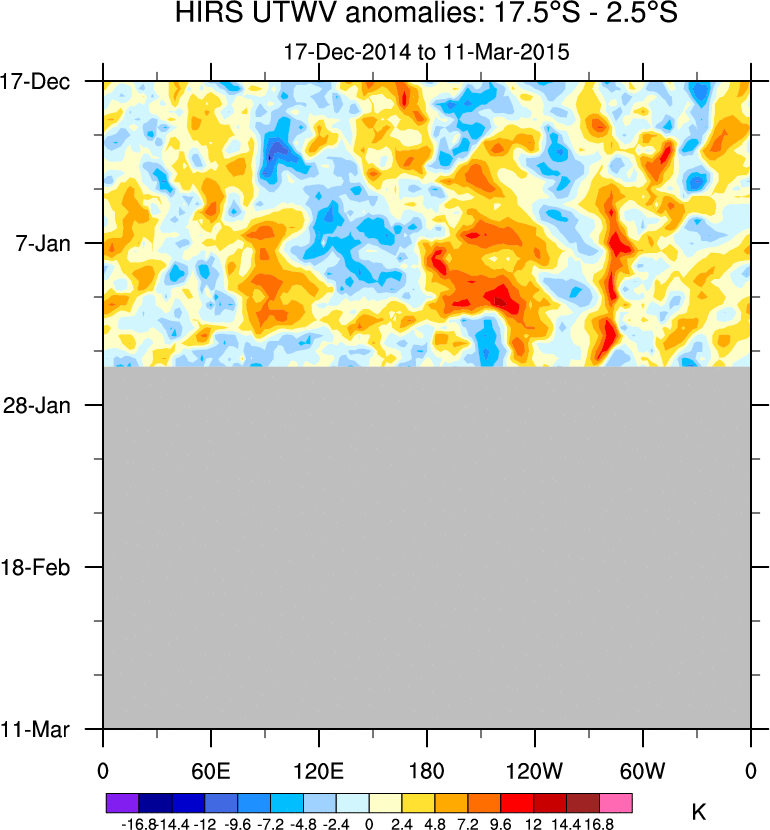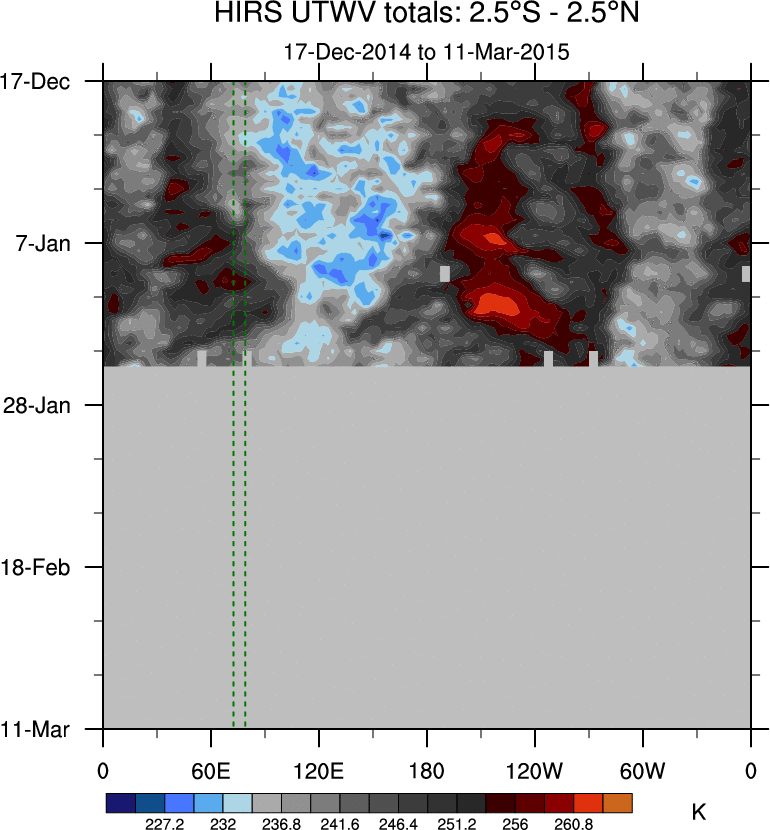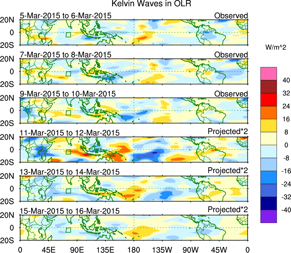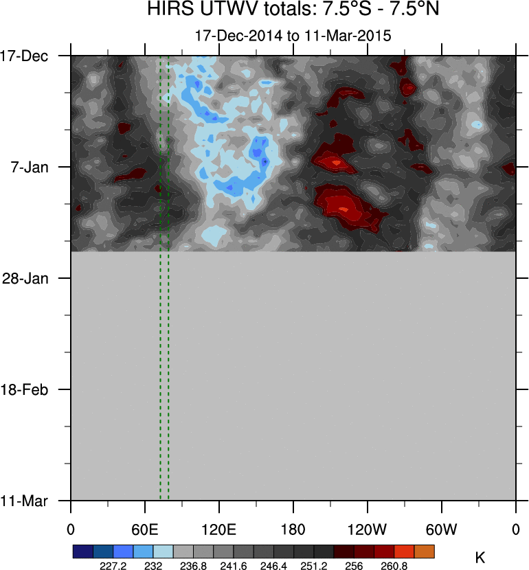 To identify tropical waves in near real-time, the OLR and UTWV data are filtered following Wheeler & Weickmann (2001 MWR). The daily anomalies are calculated using the first 3 harmonics of the seasonal cycle for 1979–2009. Missing values are then filled using linear interpolation in space and time. The most recent 365 days of anomalies are padded with 659 days of zeroes, and the result is filtered for each wave type.