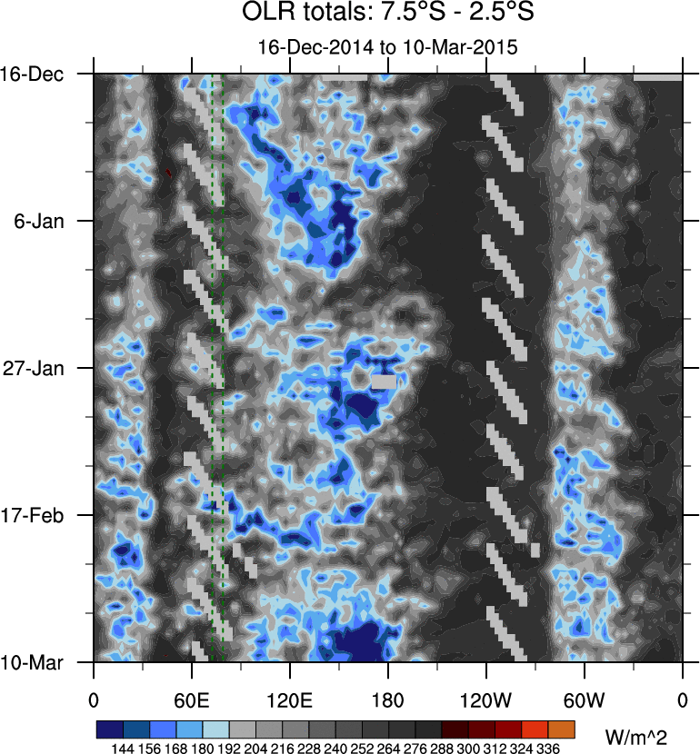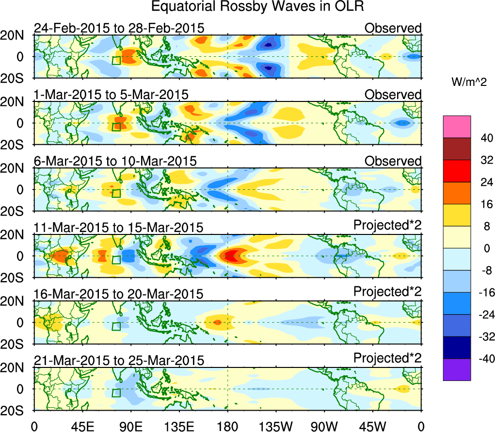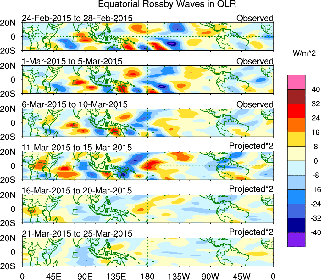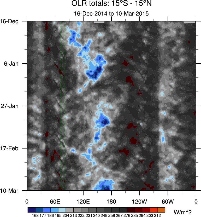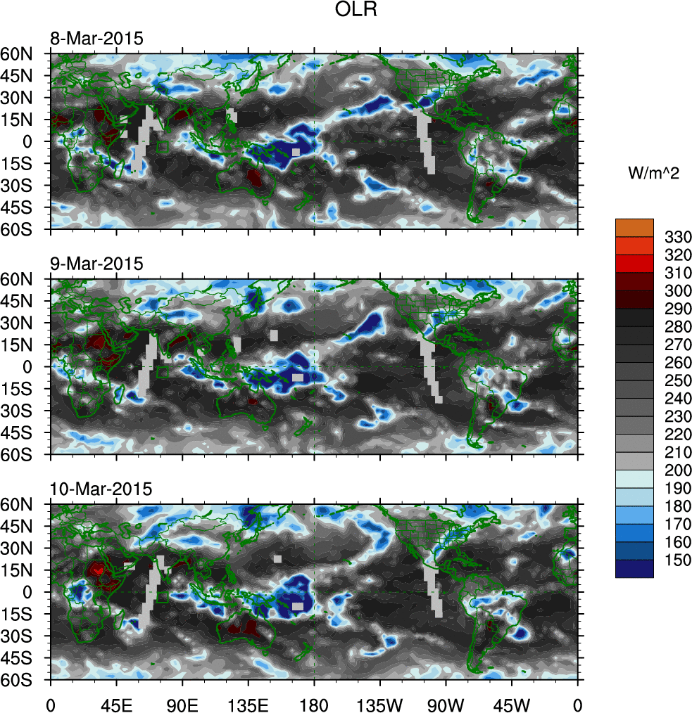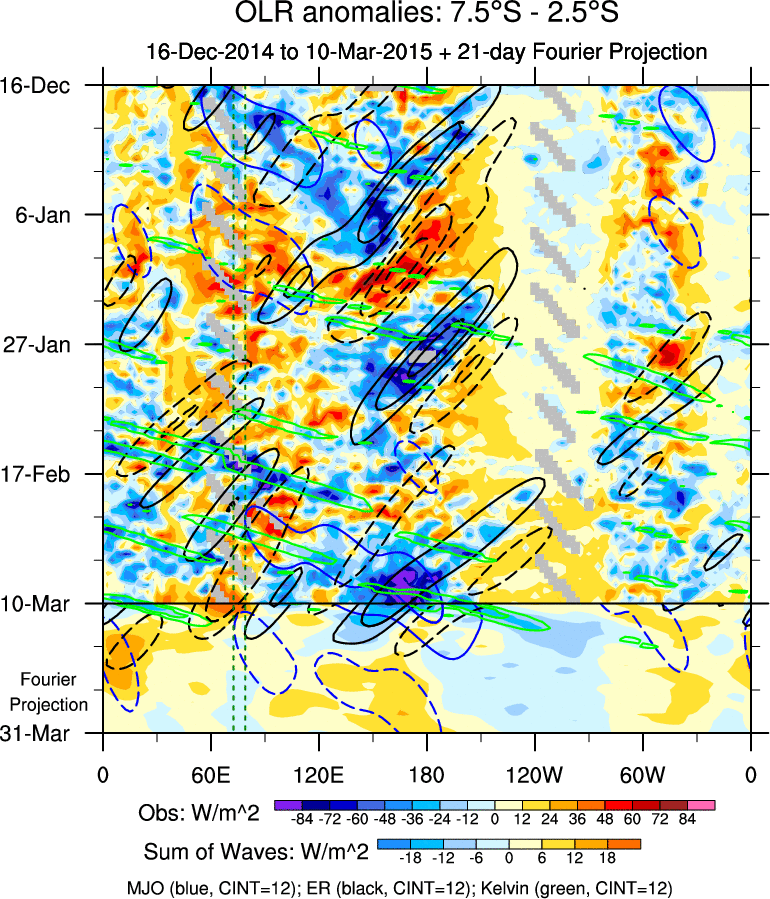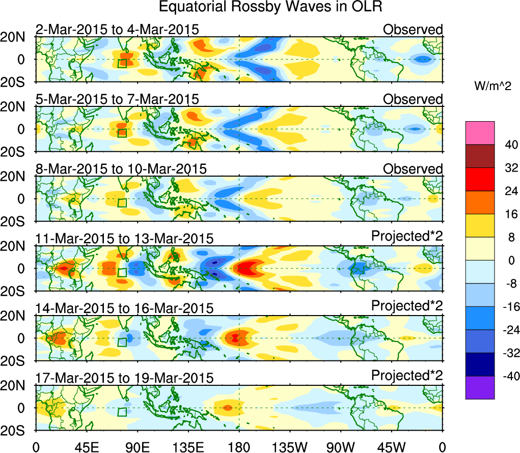 To identify tropical waves in near real-time, the OLR and UTWV data are filtered following Wheeler & Weickmann (2001 MWR). The daily anomalies are calculated using the first 3 harmonics of the seasonal cycle for 1979–2009. Missing values are then filled using linear interpolation in space and time. The most recent 365 days of anomalies are padded with 659 days of zeroes, and the result is filtered for each wave type.