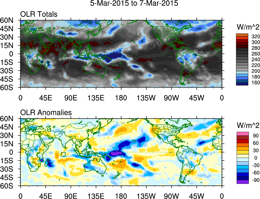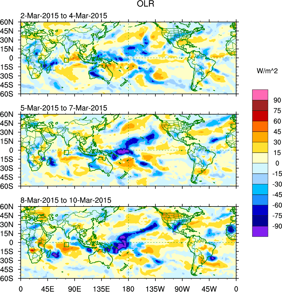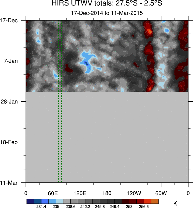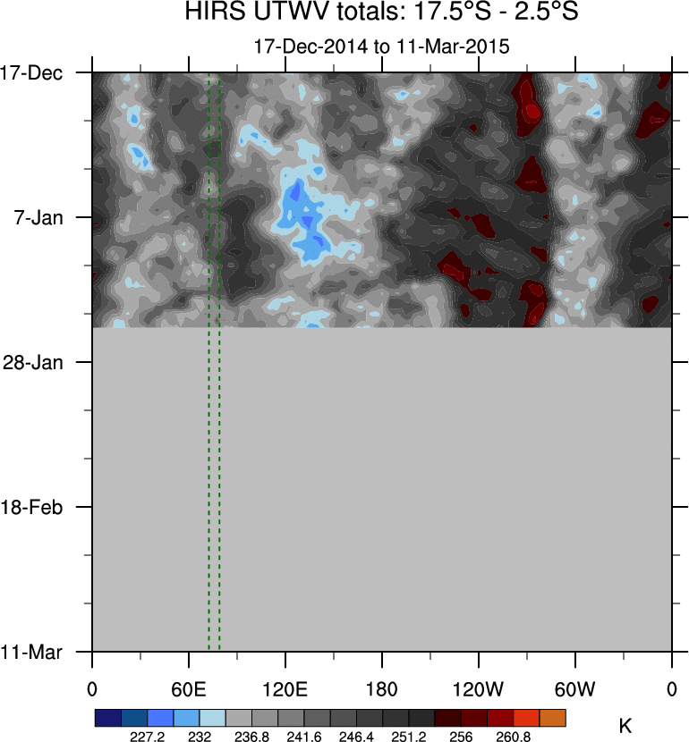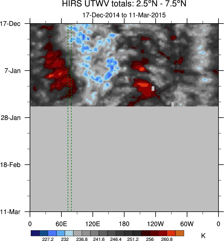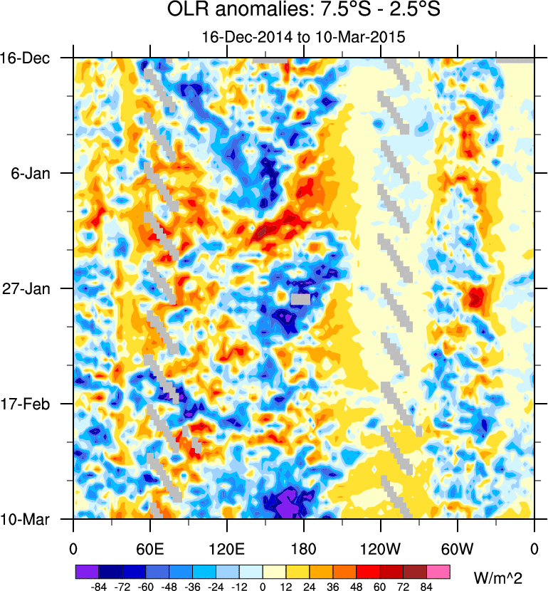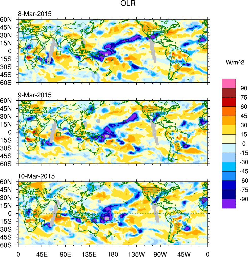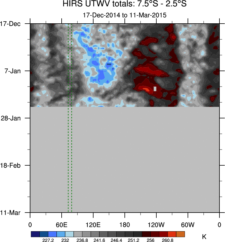 To identify tropical waves in near real-time, the OLR and UTWV data are filtered following Wheeler & Weickmann (2001 MWR). The daily anomalies are calculated using the first 3 harmonics of the seasonal cycle for 1979–2009. Missing values are then filled using linear interpolation in space and time. The most recent 365 days of anomalies are padded with 659 days of zeroes, and the result is filtered for each wave type.